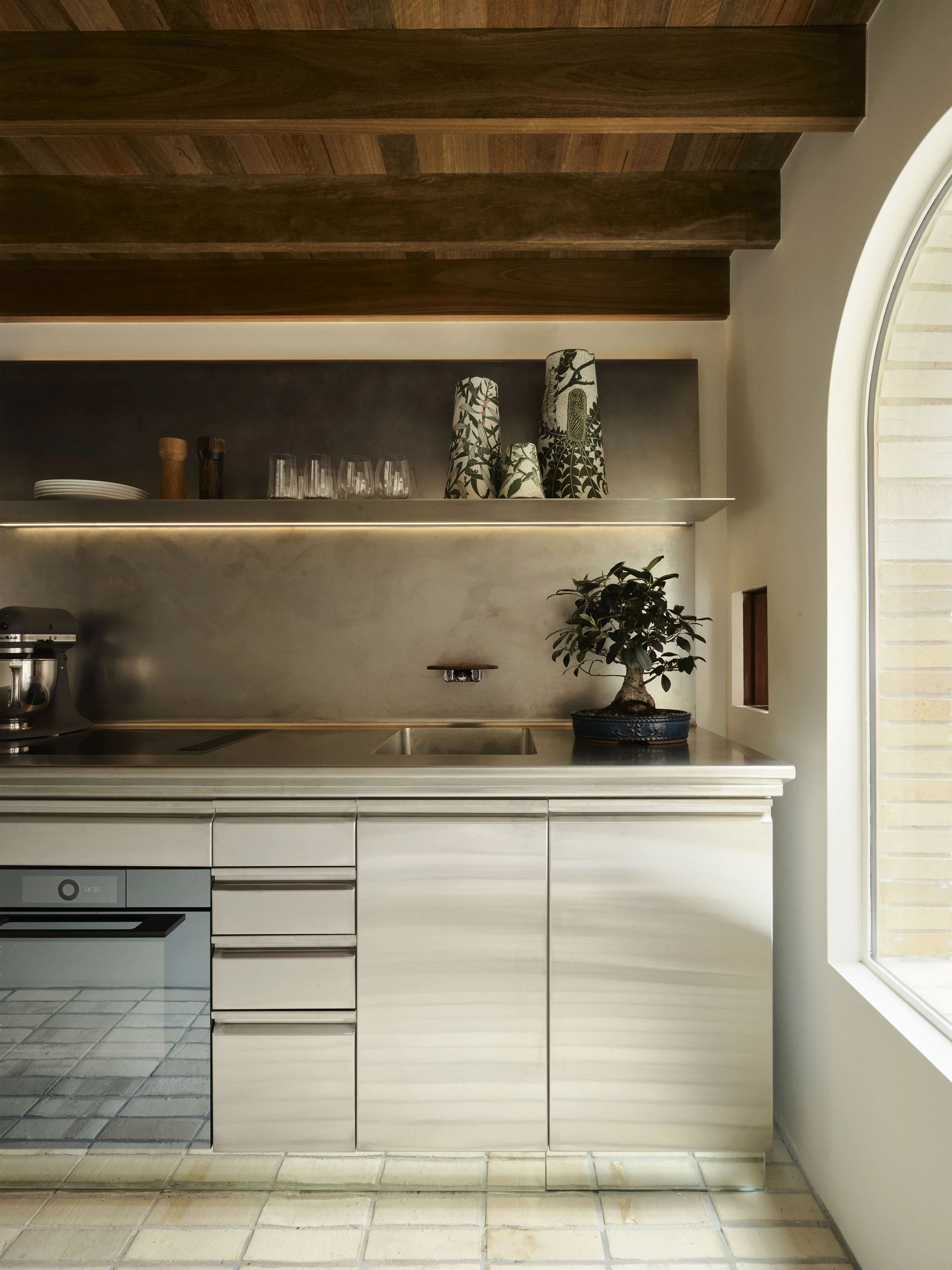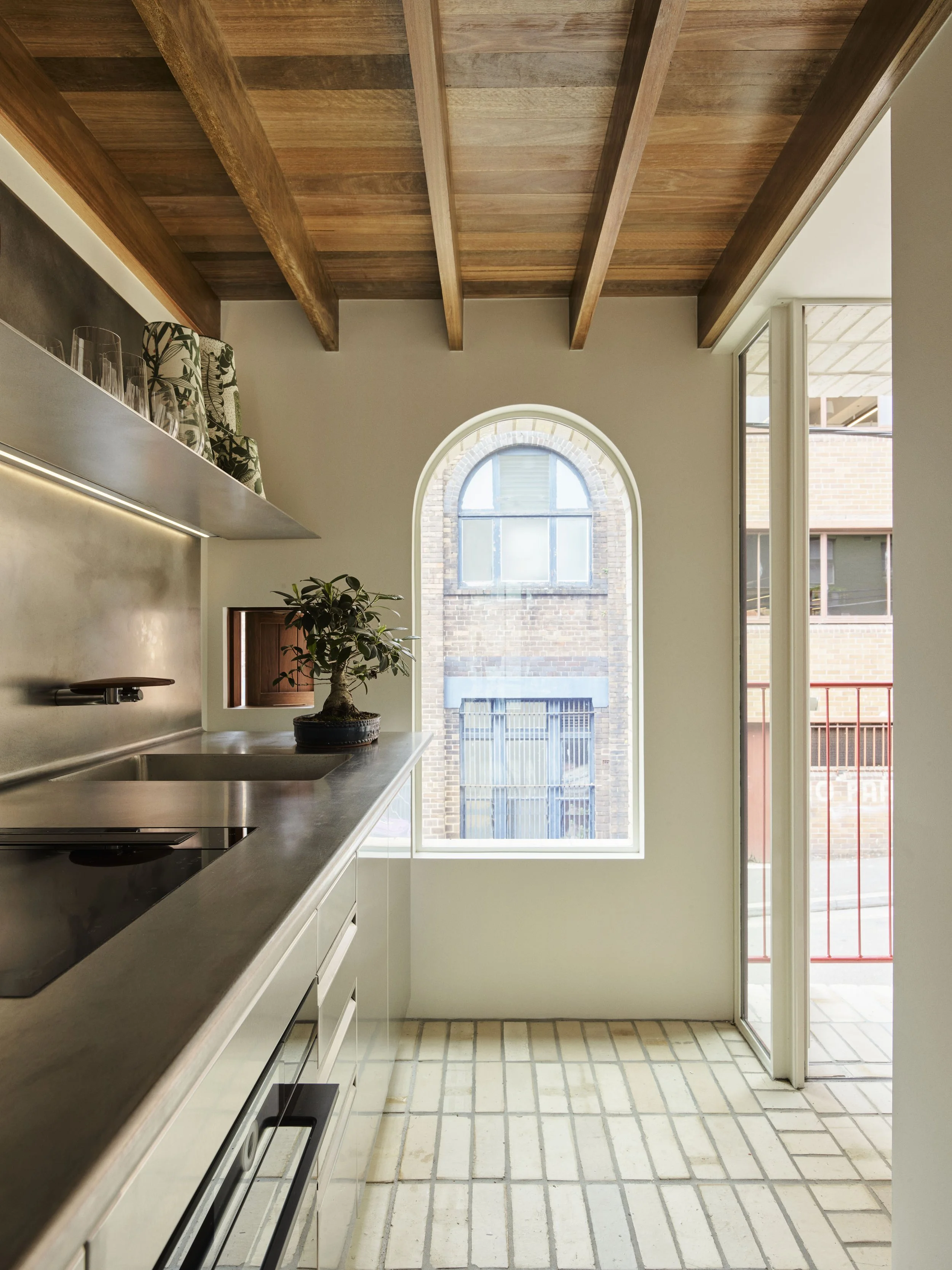 An arched window in the kitchen frames views of the neighbouring warehouses. Photo: Anson Smart