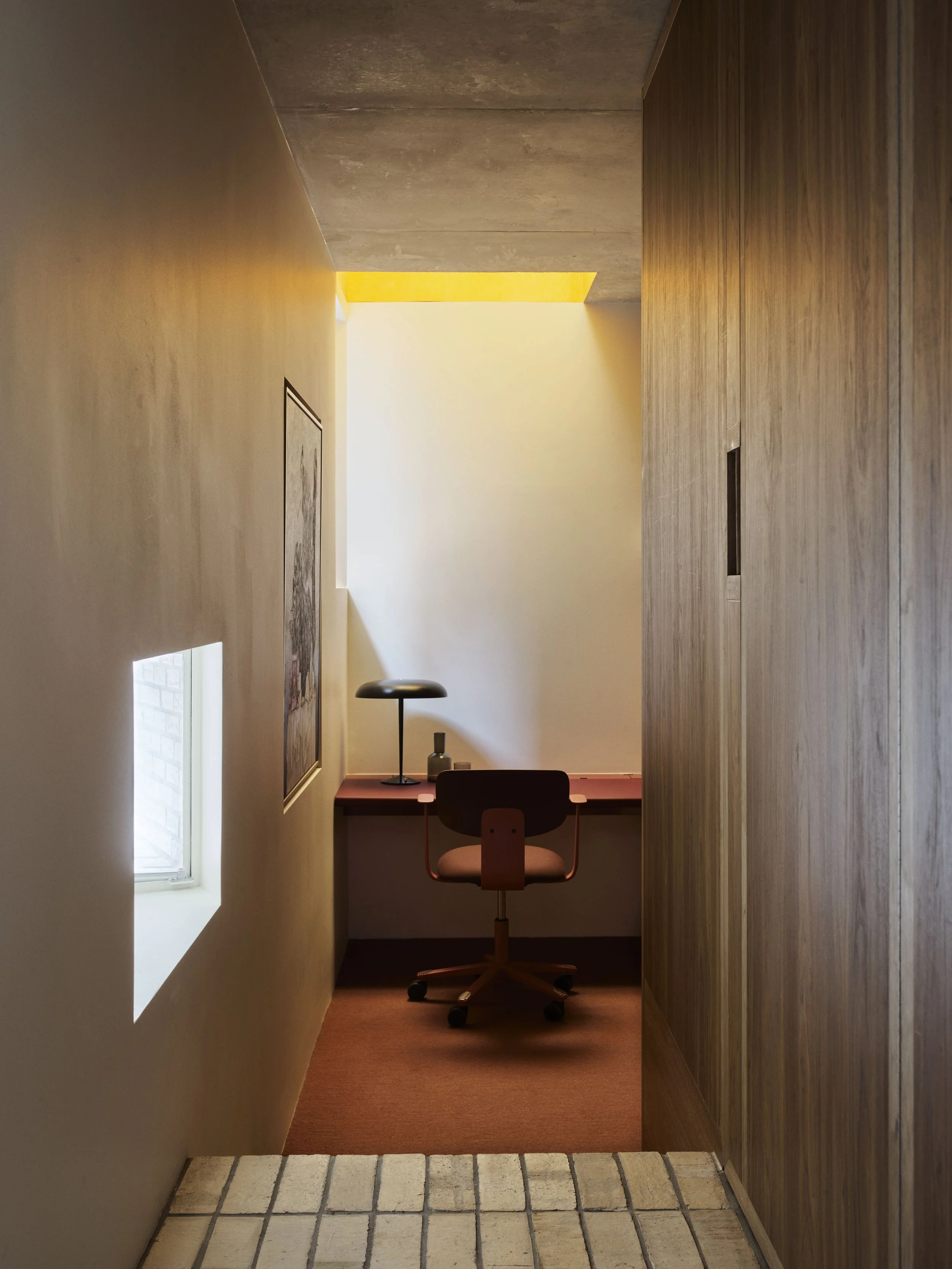 The service spaces, such as storage areas, kitchen, wardrobe, and ensuite, have a ceiling height of 2.1 meters. On the other hand, the served spaces, including the study, living area, and bedroom, have higher ceilings measuring 3.6 meters, creating a more spacious atmosphere. Despite its maximum depth of 3.3 meters, the house is designed to maximise natural light and ventilation, ensuring a constant connection to the energy of the day and giving the spaces a strong urban feel.