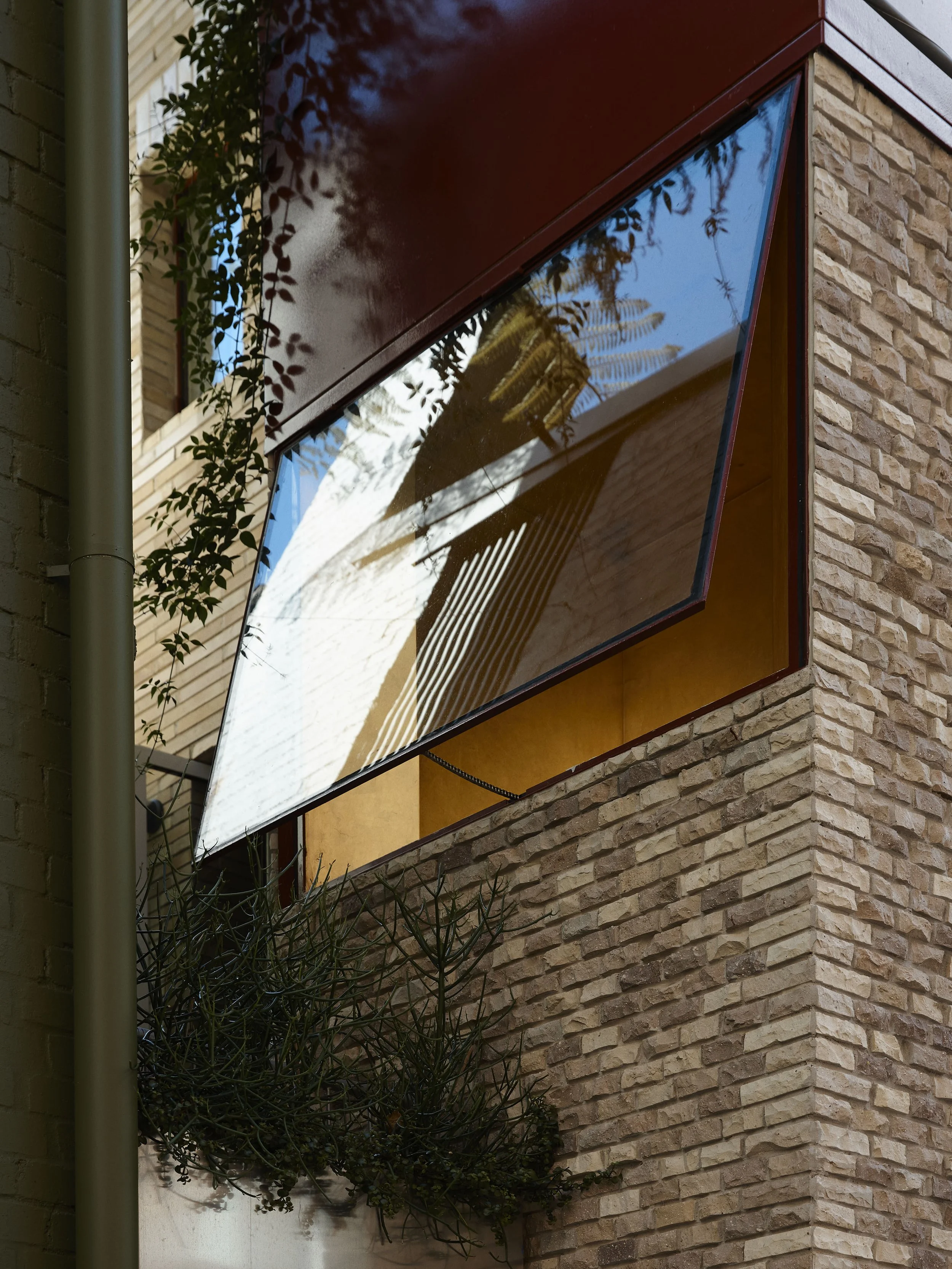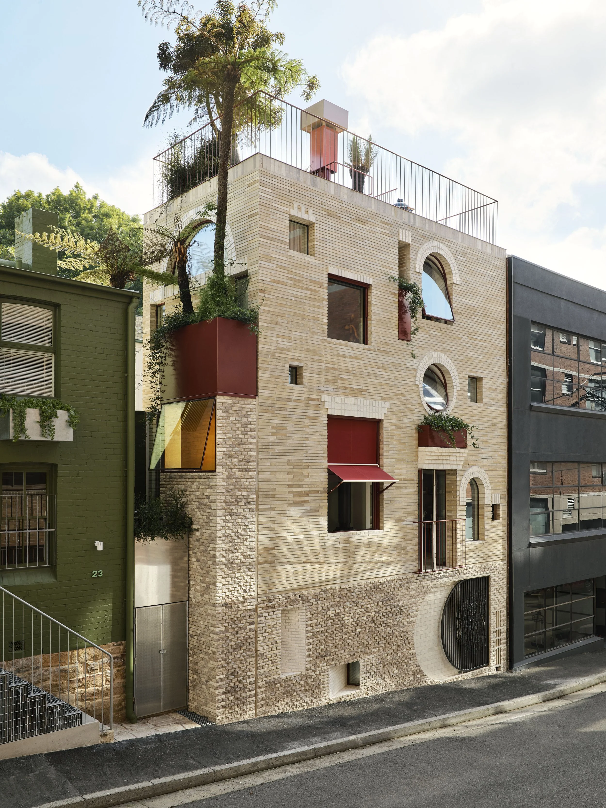 The exterior of the house is characterised by a playful and textured design that draws inspiration from the surrounding suburb. It evokes a whimsical and lively atmosphere, reminiscent of a house from a Jacques Tati film. The façade is constructed using reclaimed bricks, some of which are broken and reflect the historic sandstone base of the nearby streets. The bricks were creatively cut and folded to conceal openings and preserve views. Additionally, the upper portion of the façade features bricks of varying sizes, strategically framing windows and providing support for planted elements.