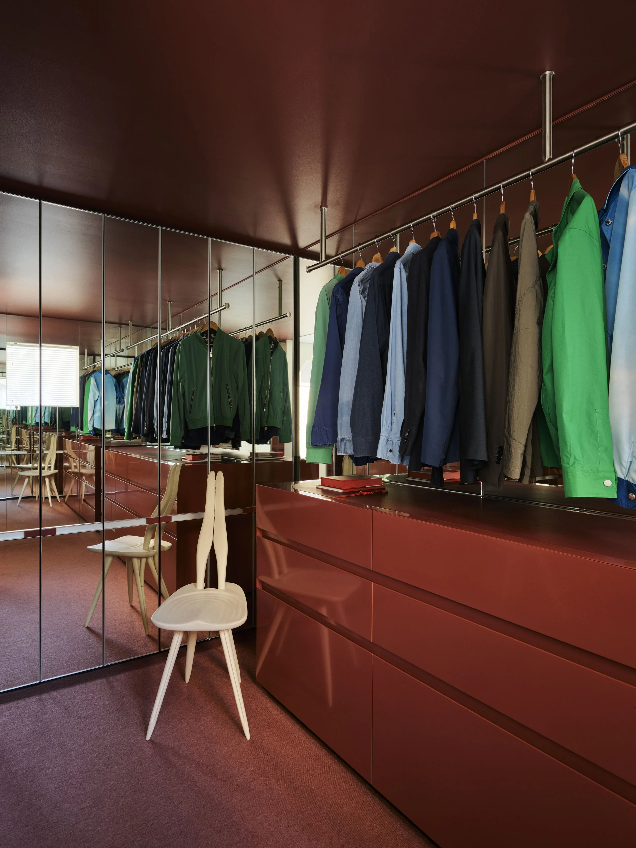 Mirrored cabinets in the walk-in wardrobe reflect light and also give the illusion of a bigger space. Photo: Anson Smart