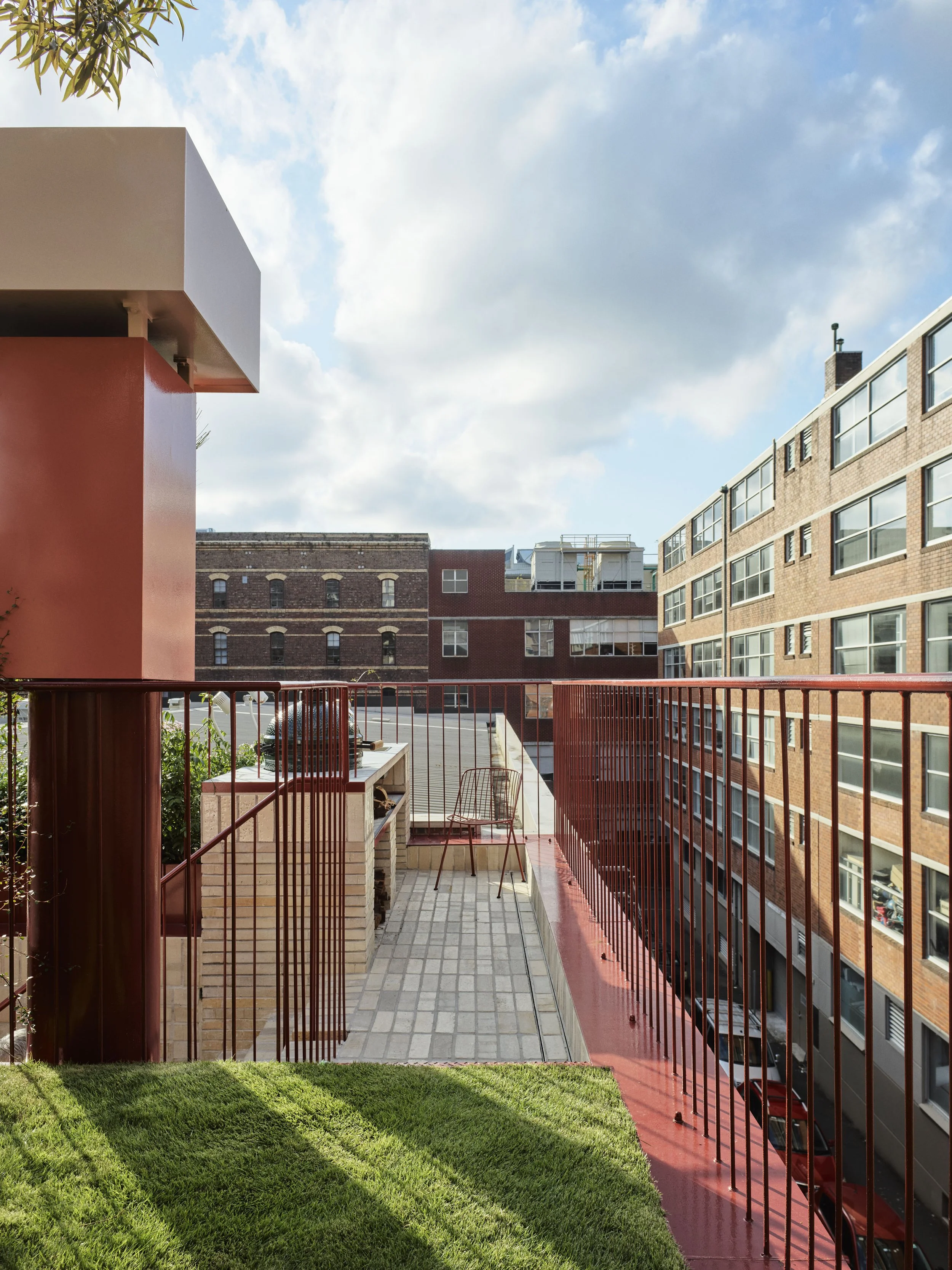 The rooftop garden complete with chimney tower, pizza oven and a grass patch! Photo: Anson Smart