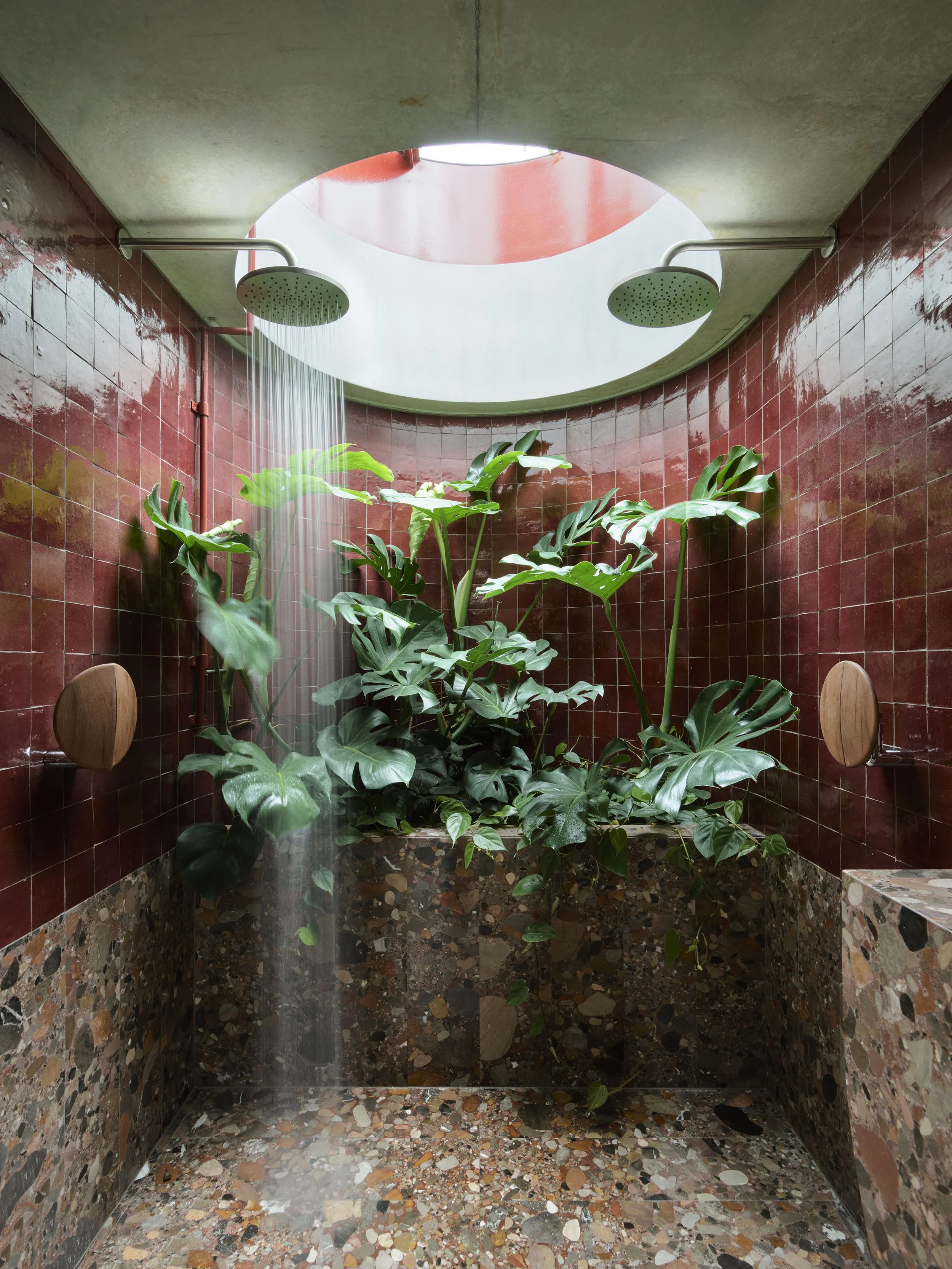 The breathtaking shower – complete with two shower heads, planter box and a skylight! Photo: Anson Smart