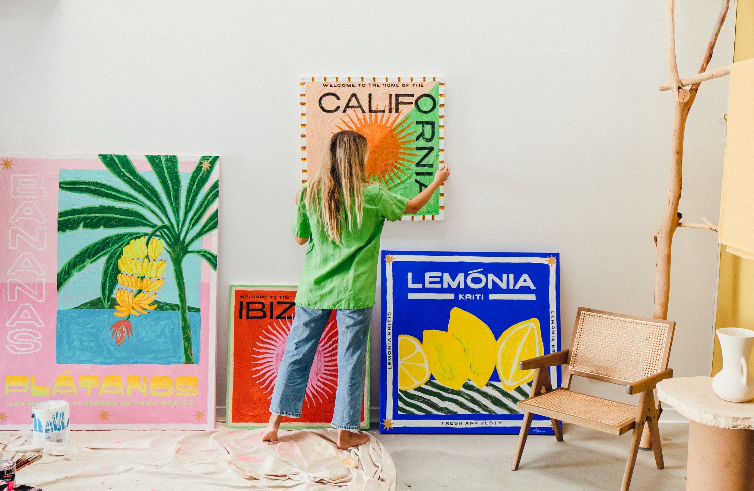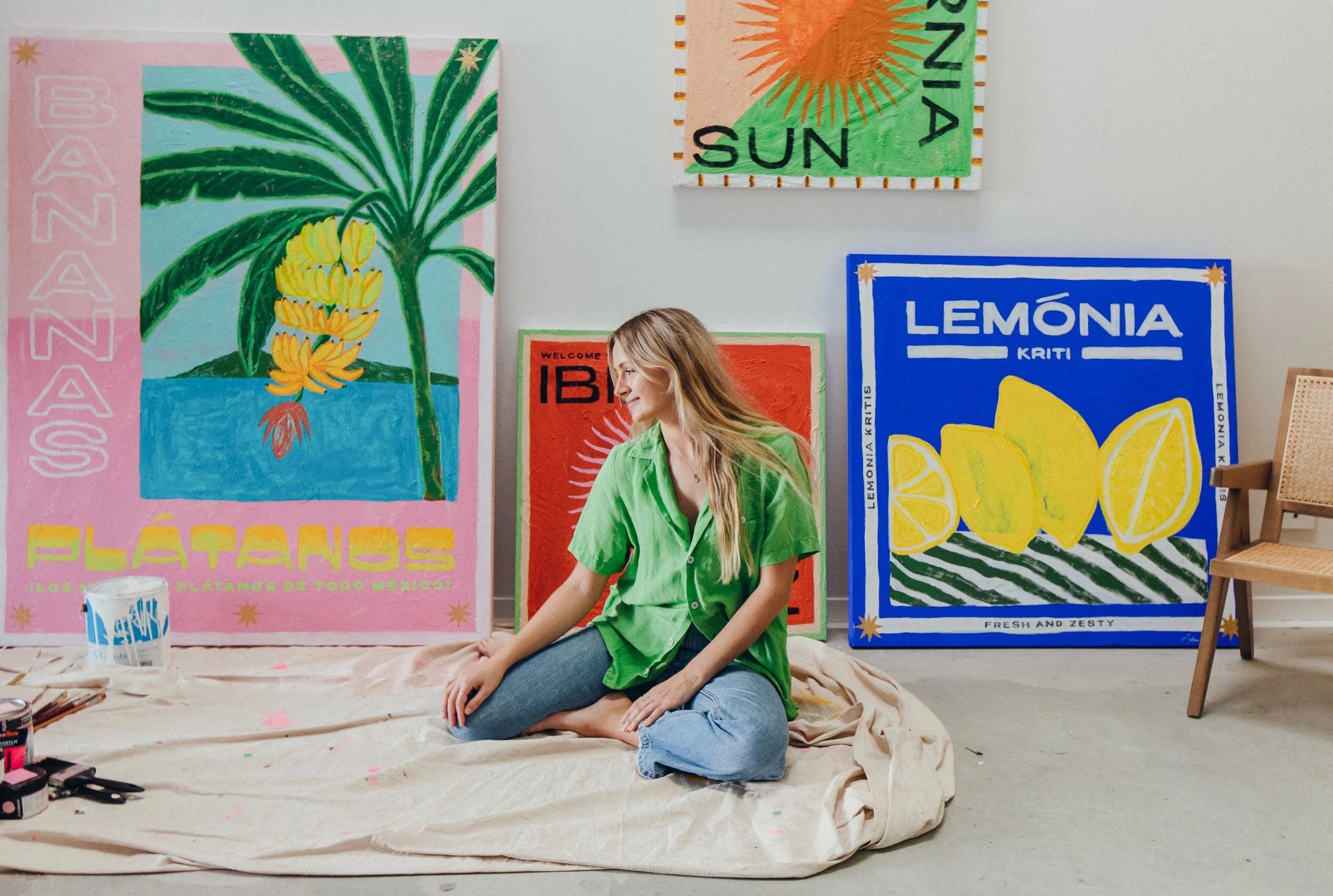 Splashing her canvas with bold, bright colours, Adrianne paints the colours of the rainbow using high vibrancy pigments in her vintage-vibe artworks.