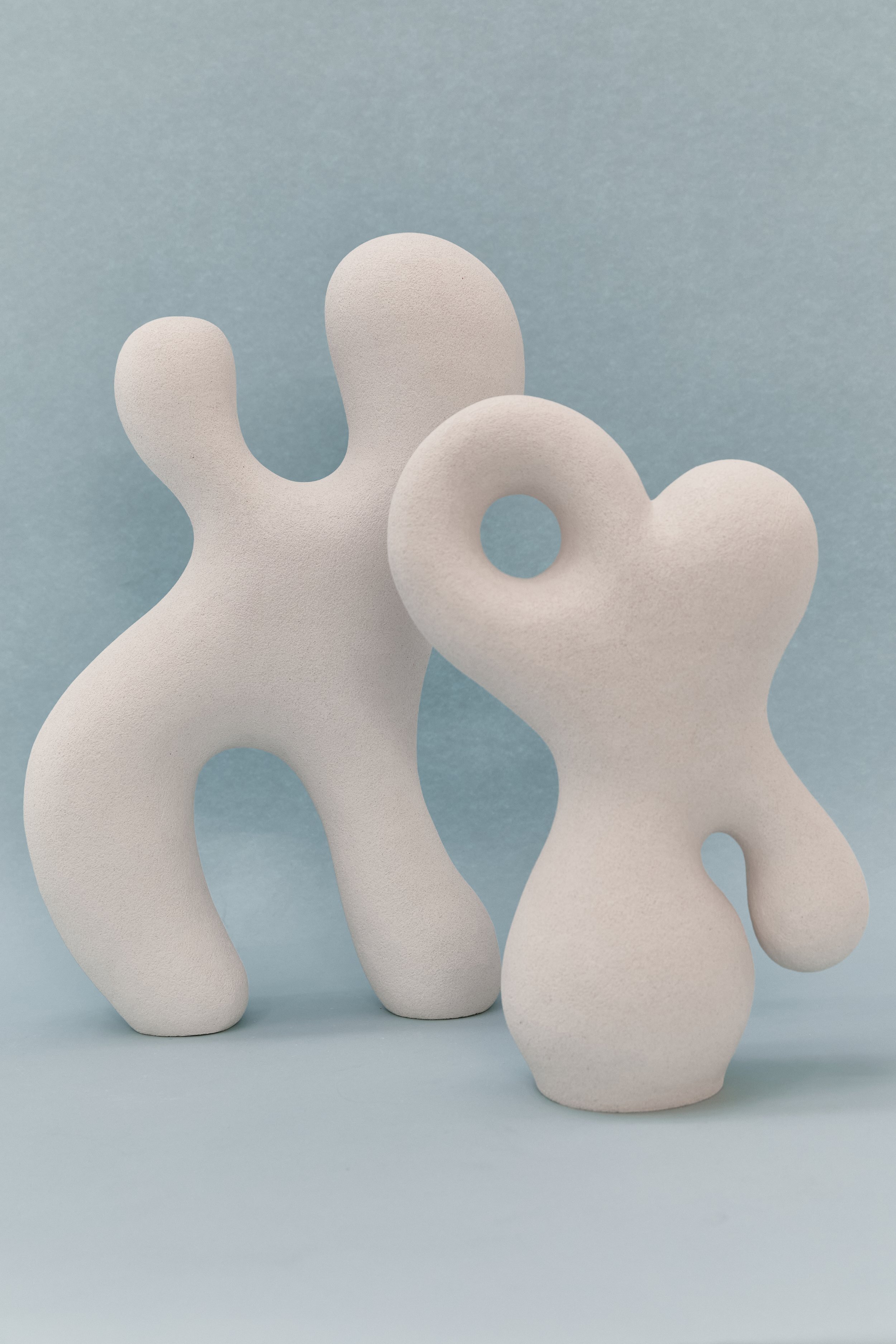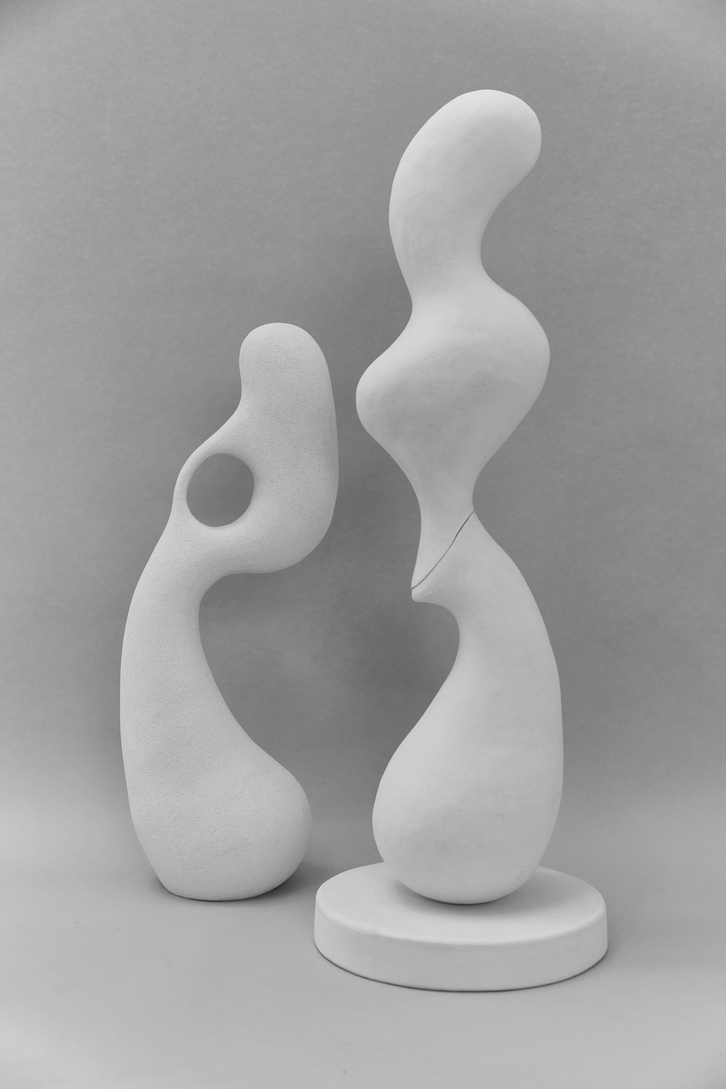 Moved by the biomorphic sculptors of the mid 20th century, she creates dramatic but utilitarian objects. Finding the form and balance of figurative sculptures is a fine-tuned process – making the weight of the organic and delicate forms to sustain itself can take days with additional days to refine texture, contours, and negative space.