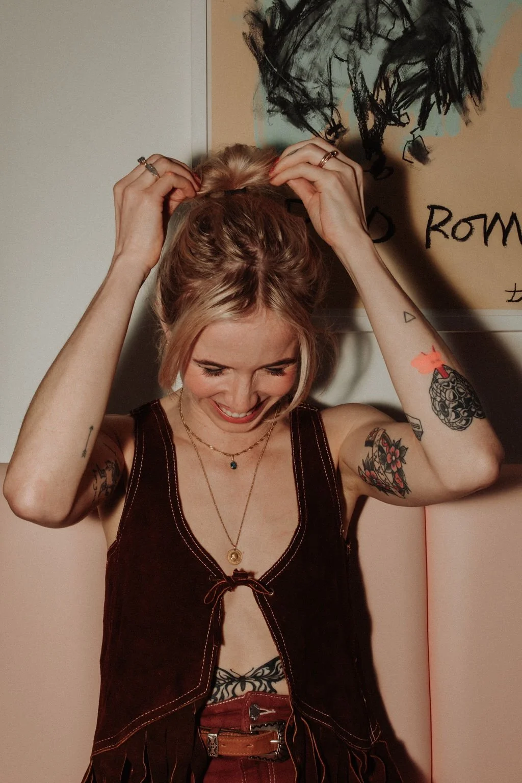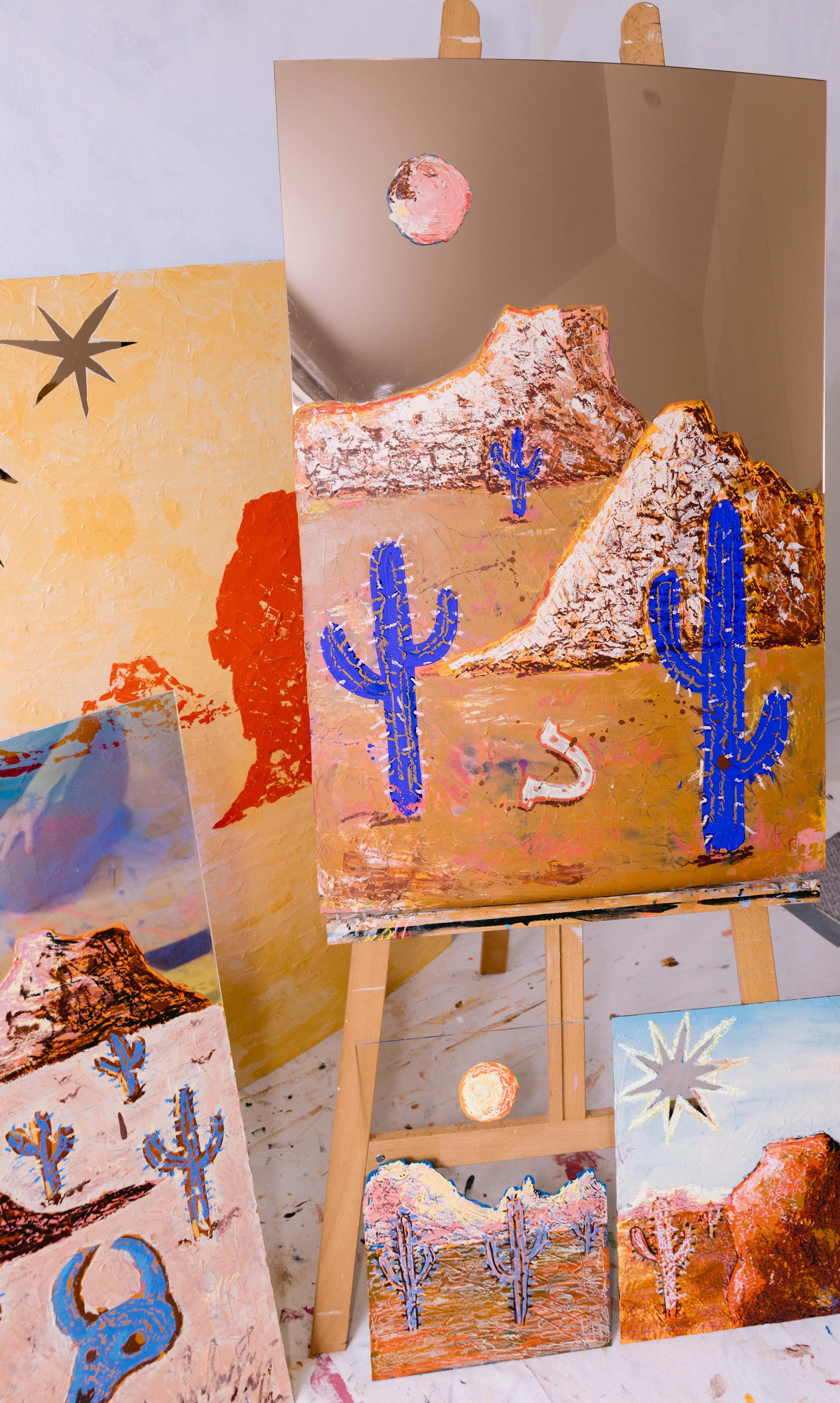 Emily Handlin work conjures desert landscapes, where memory and mirage converge. Through reflective surfaces and scorched tones, she explores the tension between illusion and perception.