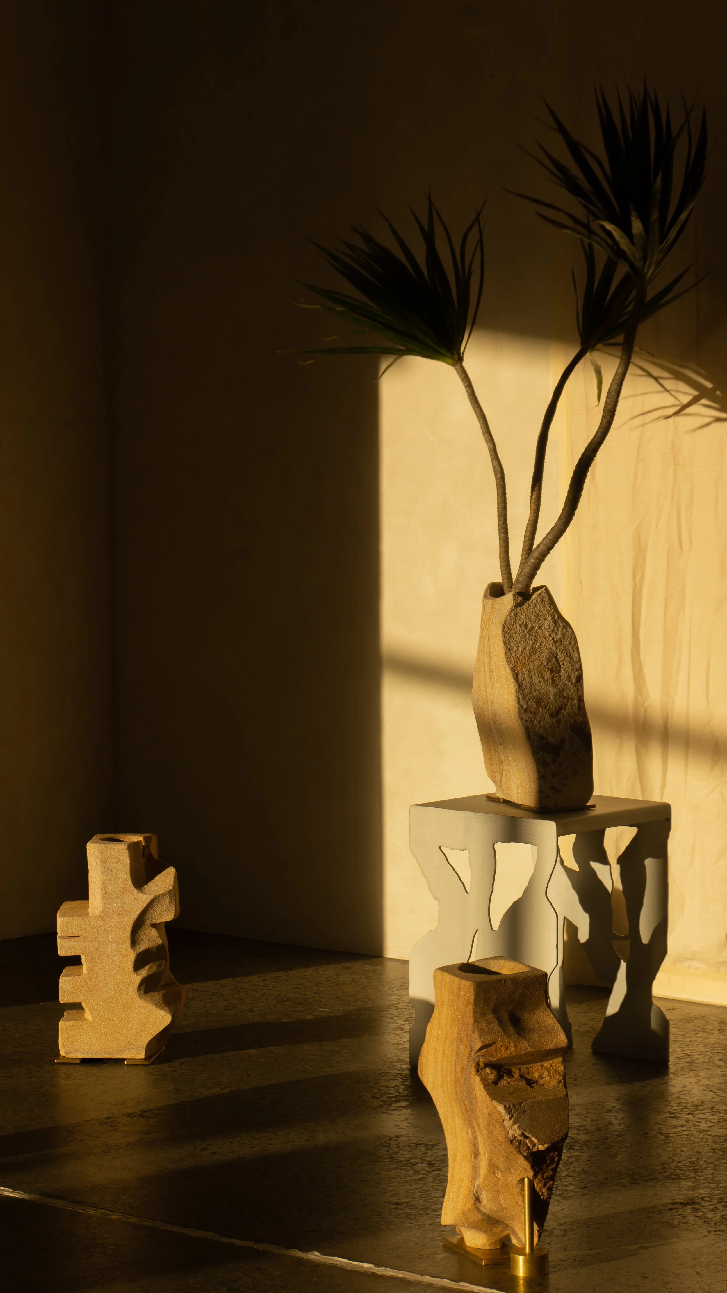 ‘Curation for me is about world‑building,’ Claudia shares. ‘I don’t want people to passively view; I want them to feel a shift in their body, their perspective, their mood.’ That sensibility meets the site’s cathedral‑like proportions—soaring ceilings and barn doors, dramatic yet grounding—allowing nature and structure, movement and stillness, translucency and solidity to play against one another. With only three artists, the dialogue is precise. Tom’s chiselled ridges rhyme with Emily’s desert topographies; his vessel‑like forms could cradle Lauren’s arrangements. Lauren’s Australian natives and sand carry a desert cadence that speaks to Emily’s painted horizons. Across ground, air and wall, their practices weave into a single sculptural field.