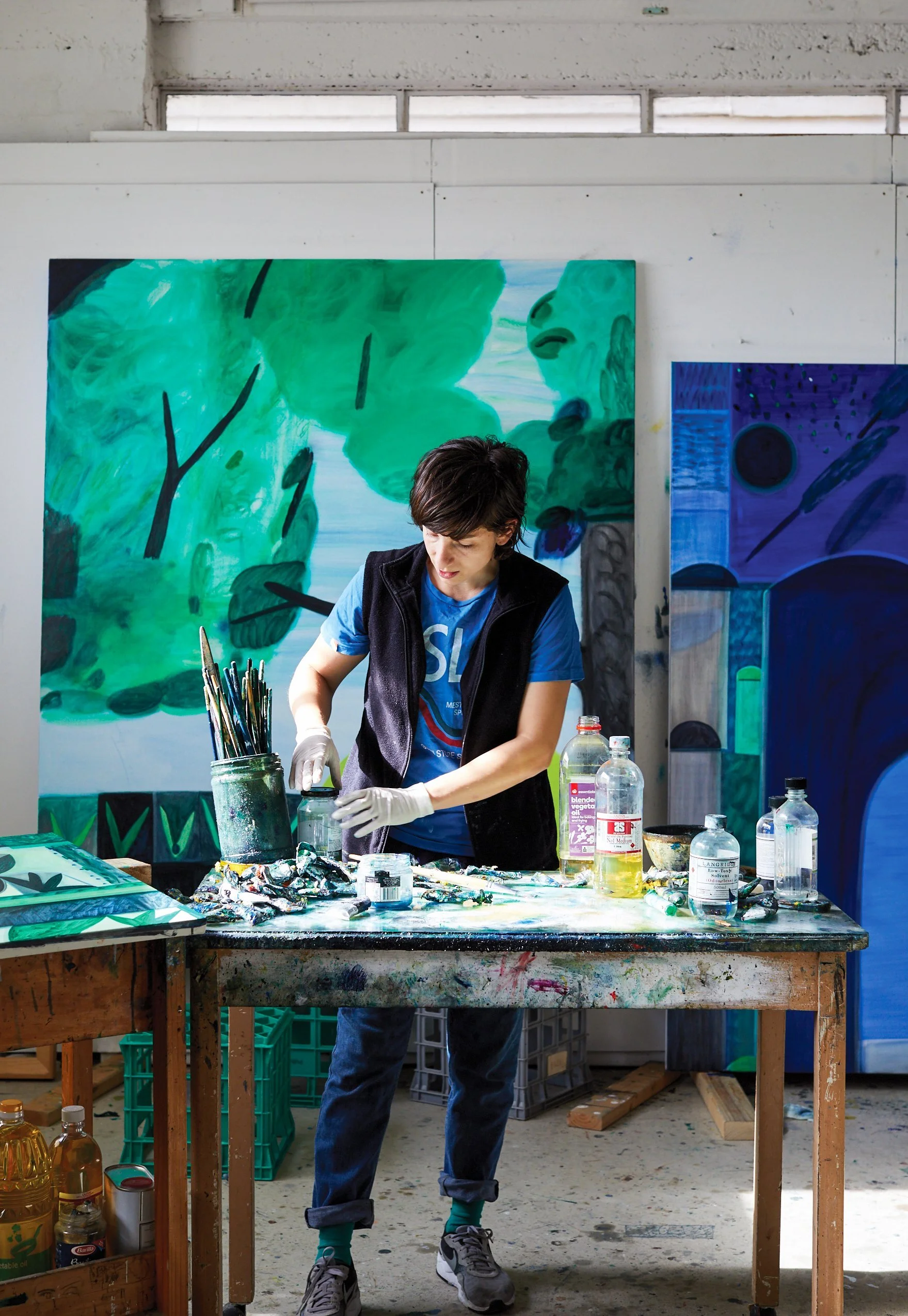 Accidental colour shifts are an important part of Emily’s picture-making, and she has been known to use a lot of greens and blues, although recently has been incorporating yellow and certain hotter hues like reds into the mix. ‘I mix my colours very intuitively and am not the sort of painter who is prescriptive on premixed colours. Quite the opposite,’ she attests. ‘I like to start off with a few colours and mix them together to see what I can come up with.’