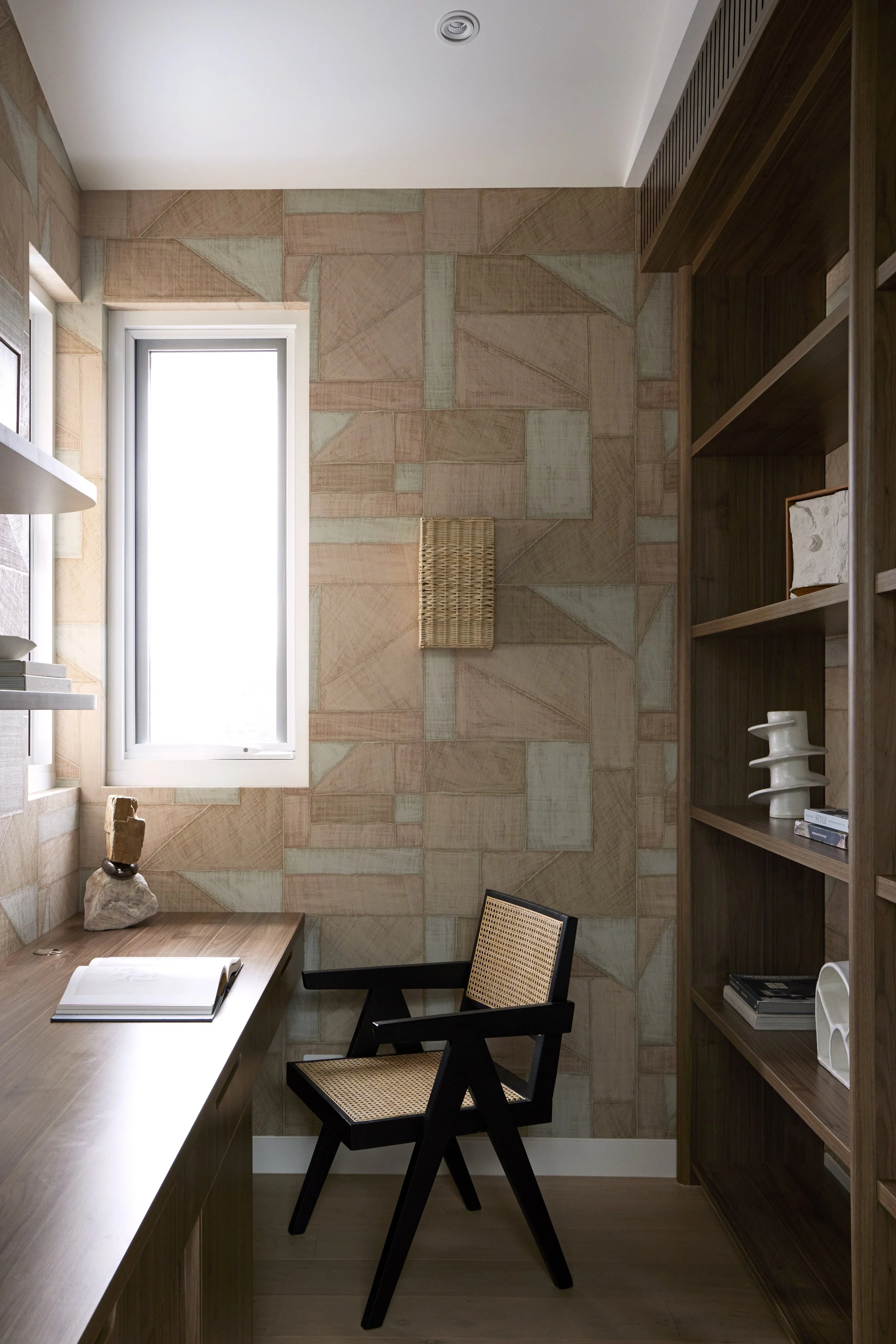 Wallpaper by French designer Élitis features in the study and powder room.