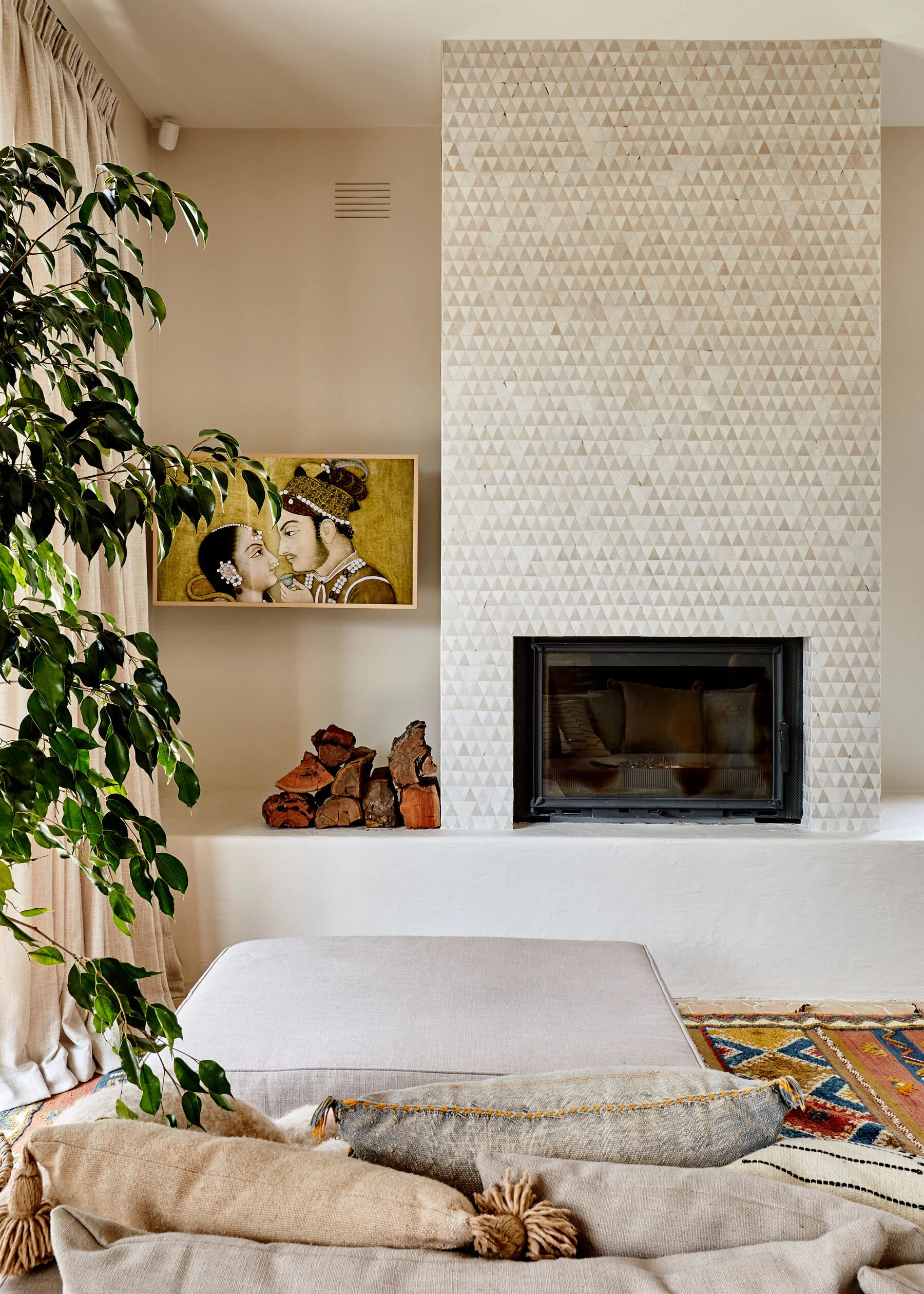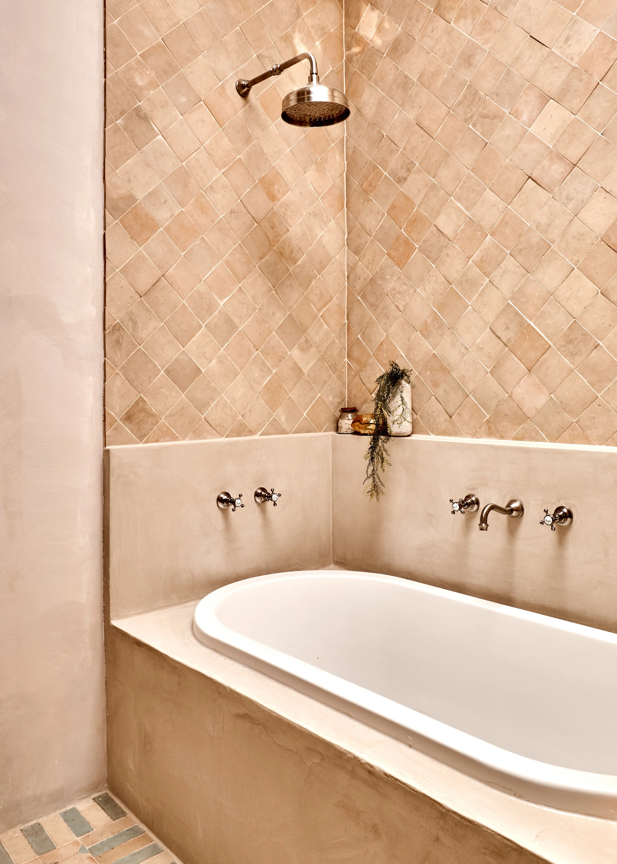 For Georgia’s colour palette she mirrored her own studio’s tiles — especially one called EZR -0187. “It’s one of my mosaic tiles, and they’re all one glaze, they’ve got this beautifully soft, clay pinky tone to them and so everything was fed off the floor,” Georgia adds.