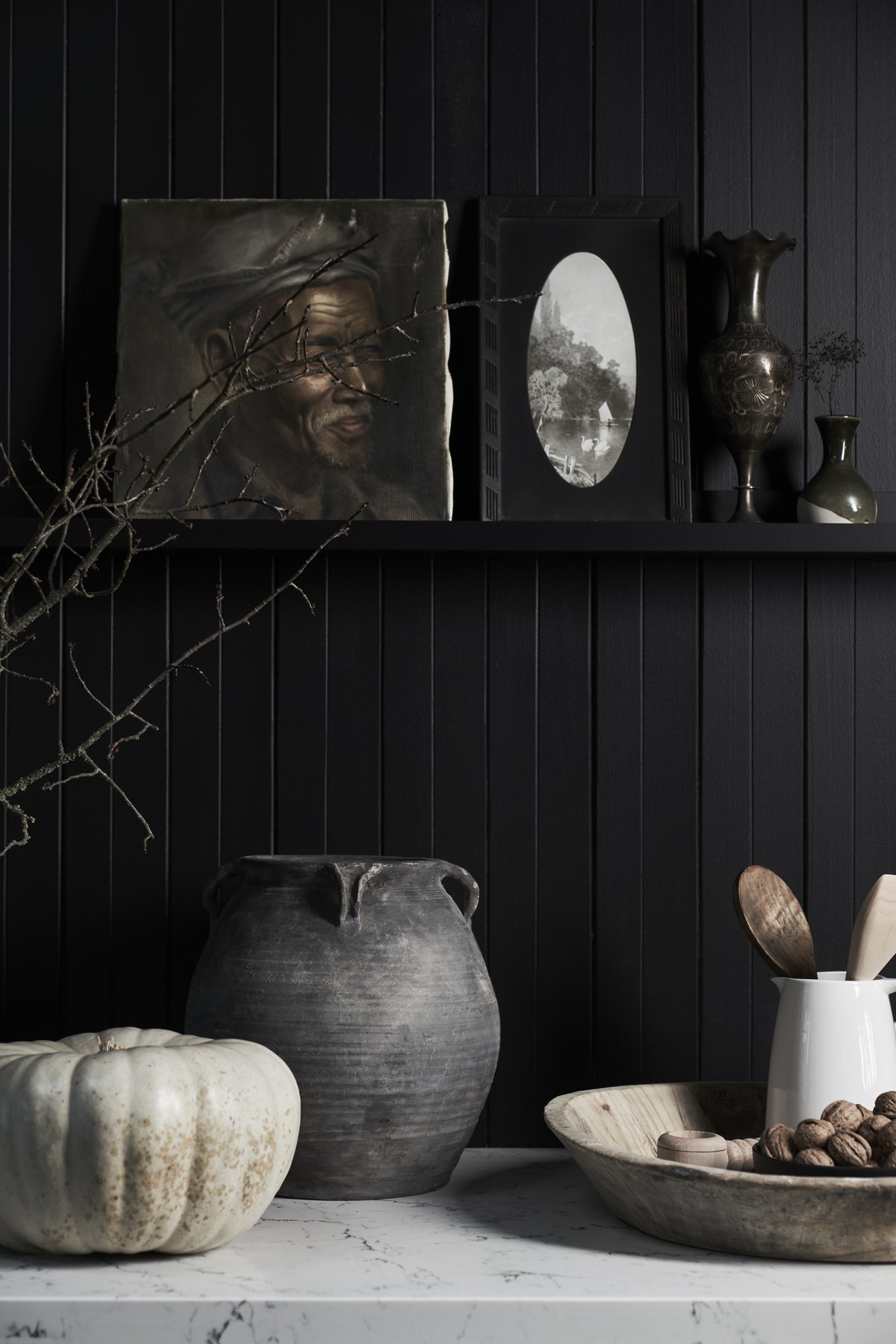 The existing ambience and atmosphere of the room. I notice layers of lighting (or lack of), the walls—are they painted or raw, and also the artwork.