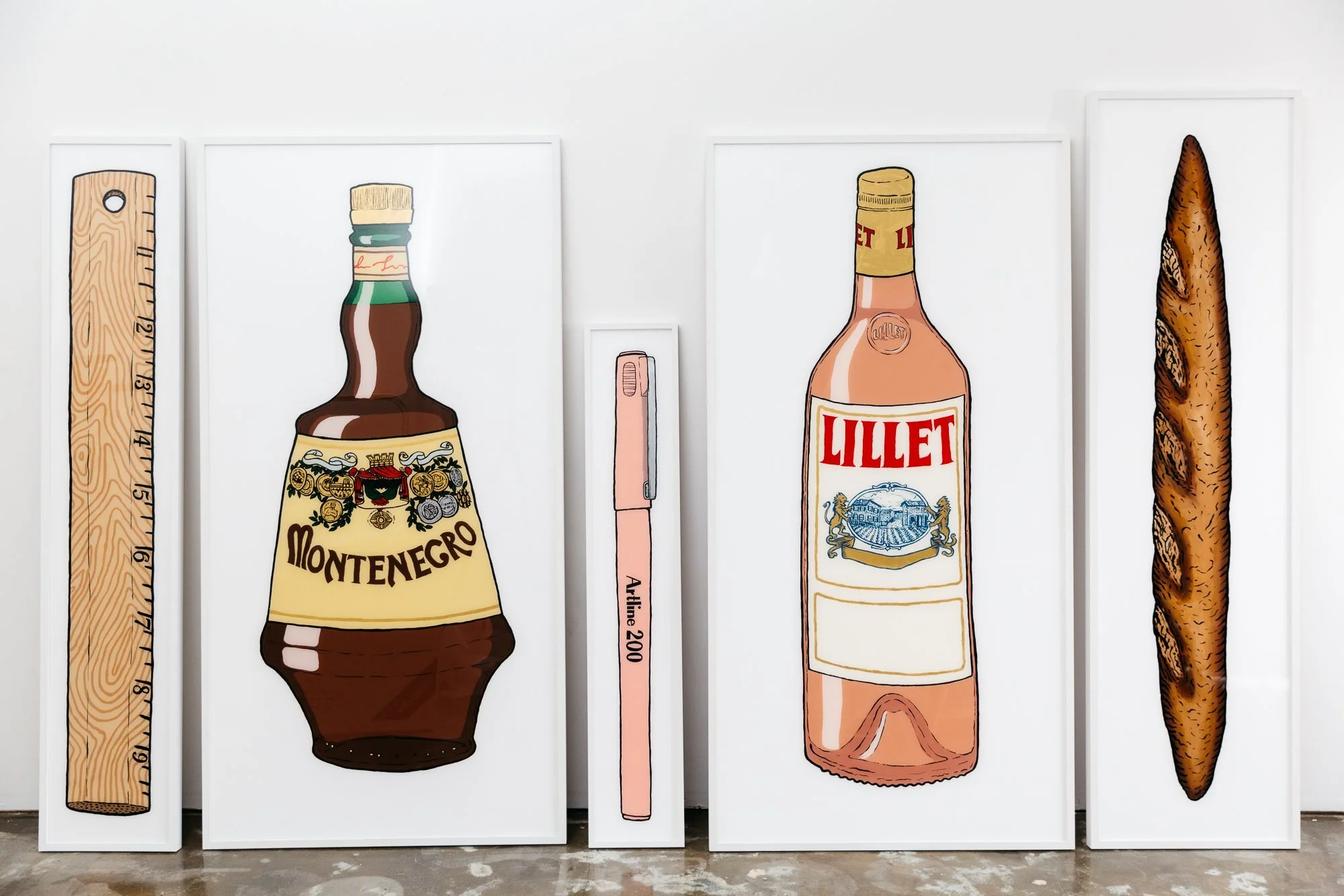 Her work has been seen at solos at Modern Times, Melbourne (such as the BIG SHOW featuring oversized bottles of Lillet and Montenegro alongside baguettes and Derwent pencils), Fenton and Fenton online, and a recent exhibition at Newmarch Gallery in Adelaide.