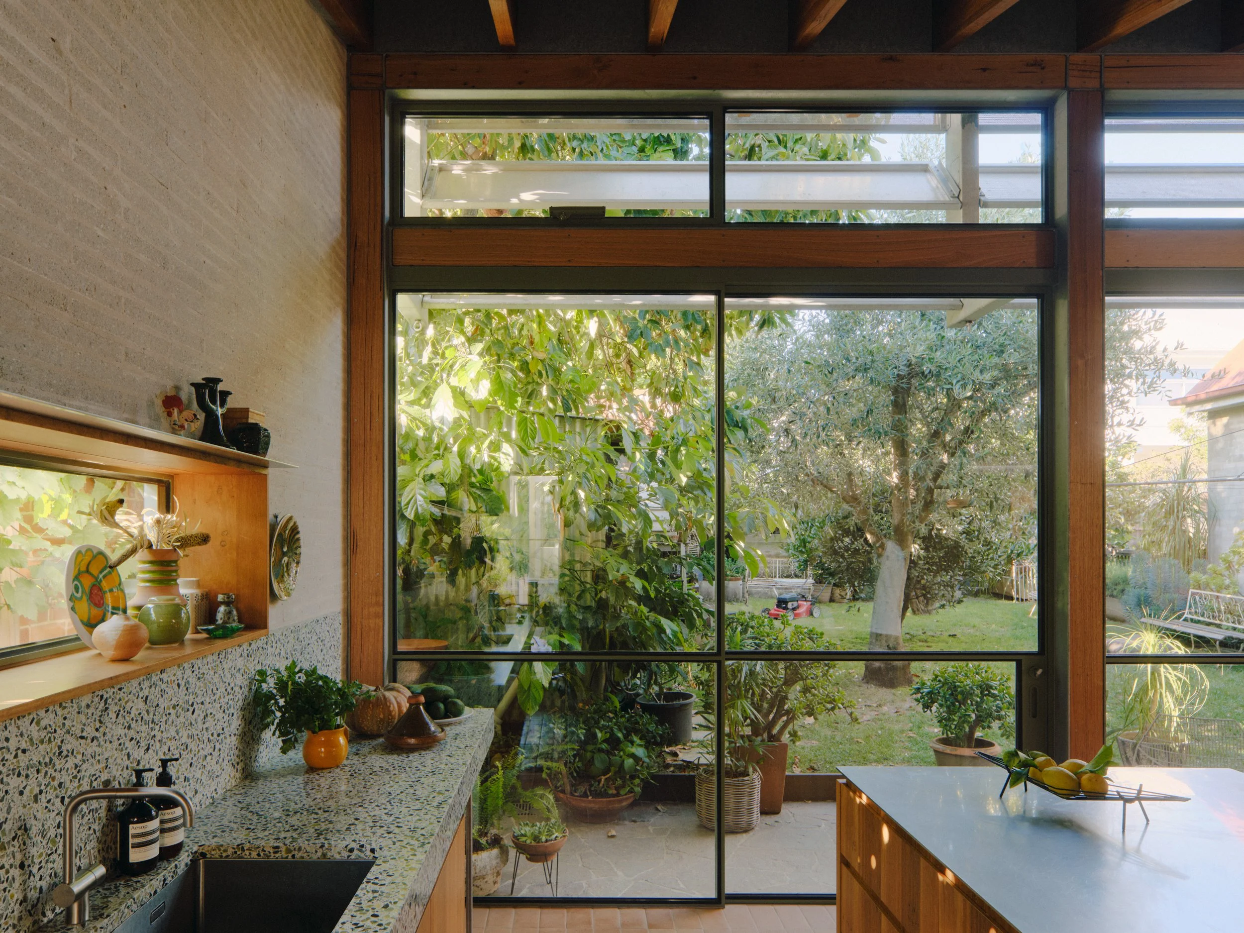 Beneath the detailing lies a rigorous, sustainability-led approach. The extension was deliberately scaled to a modest footprint to suit its occupants’ lifestyle, keeping embodied energy and material use to a minimum. By limiting the building envelope, the project preserved an established edible garden of lemon, avocado and olive trees, along with a productive vegetable patch—each element an extension of the clients’ daily rituals.