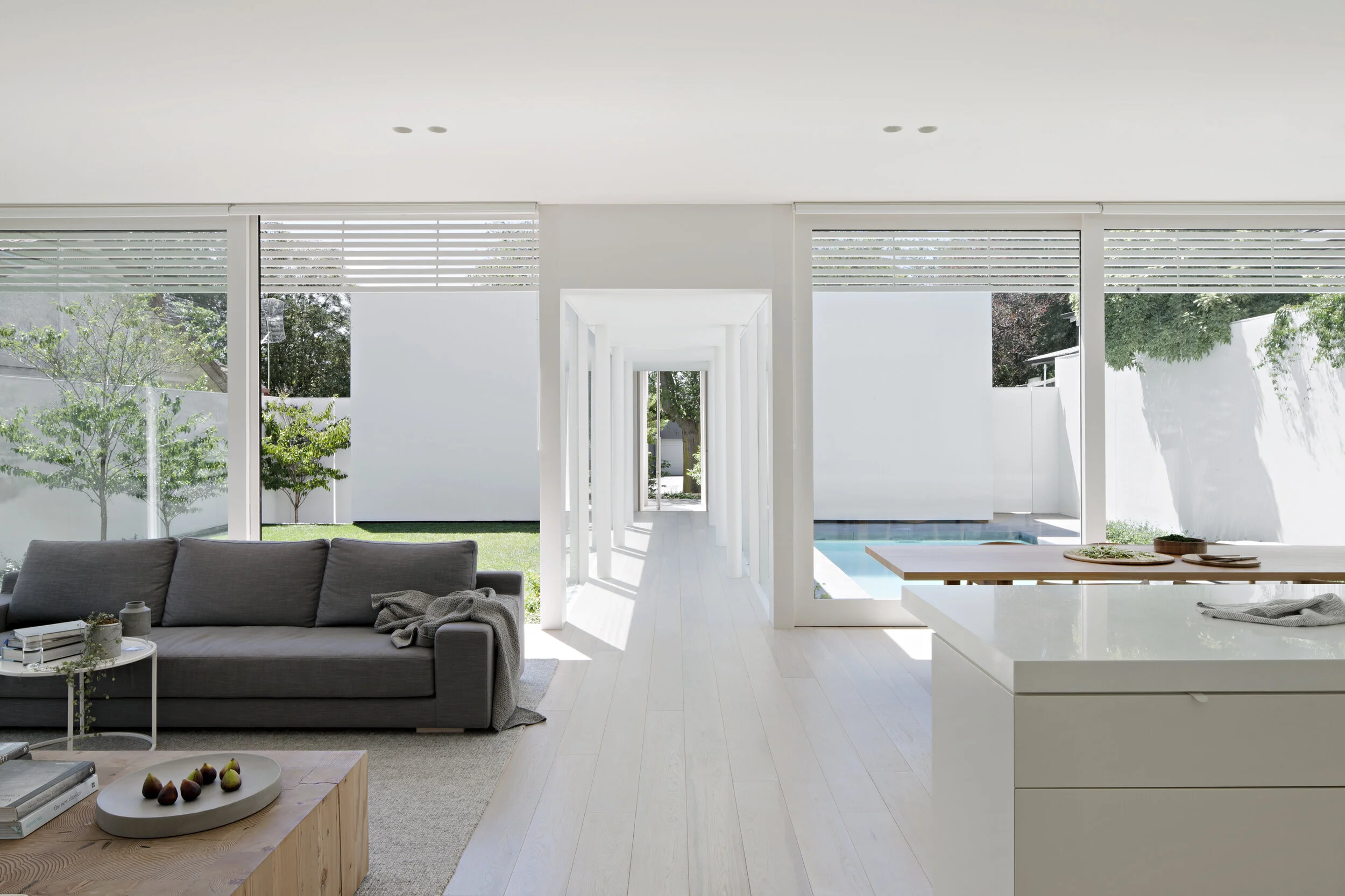 Bourne Road Residence, designed by Studiofour, is a family home which aims to frame the outdoor space with the architecture becoming the backdrop. Located in the leafy suburban of Glen Iris in Melbourne, the home is a feat in simplicity with white rendered planes, focusing on the totality of the site and the value of its connection to the exterior landscape.