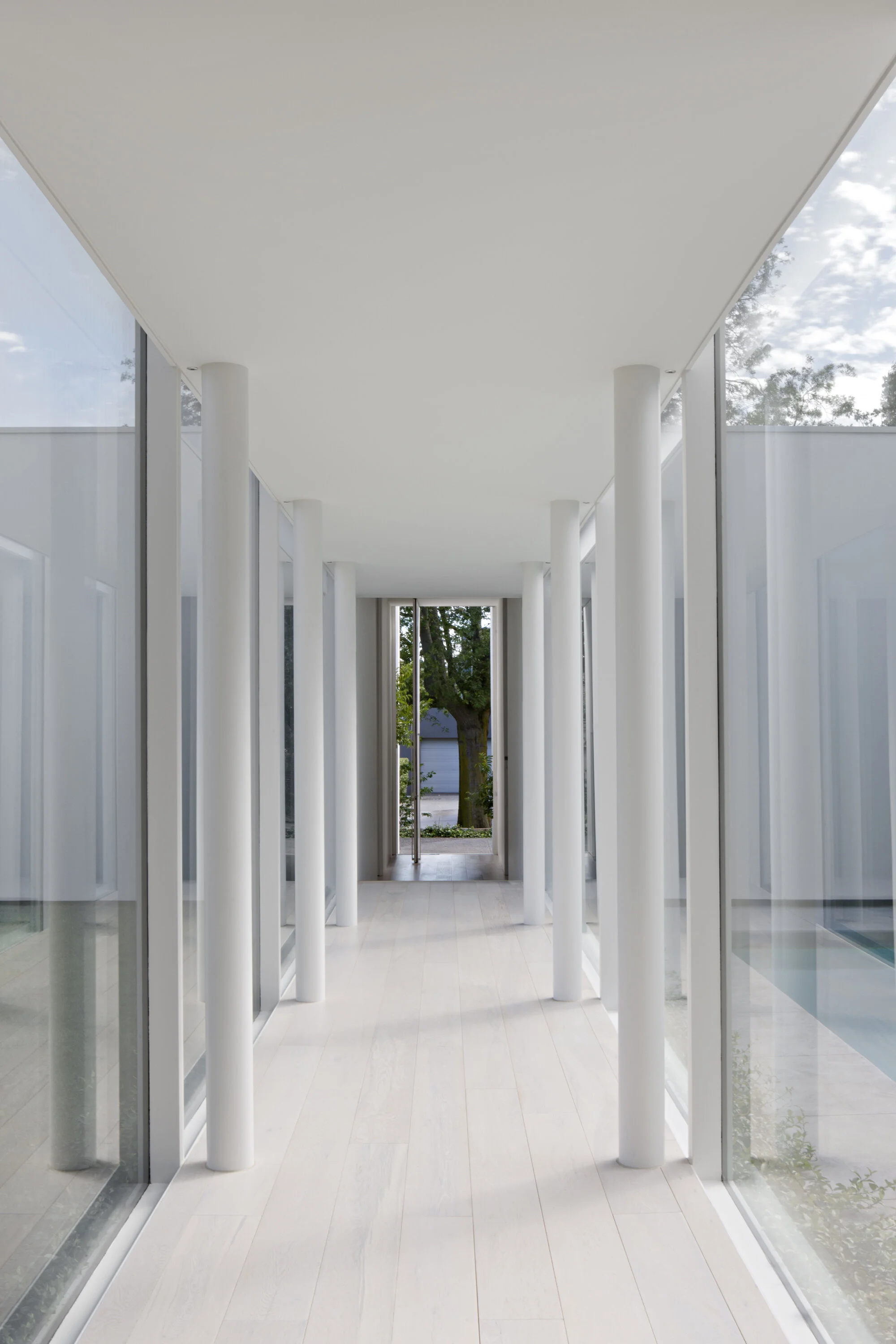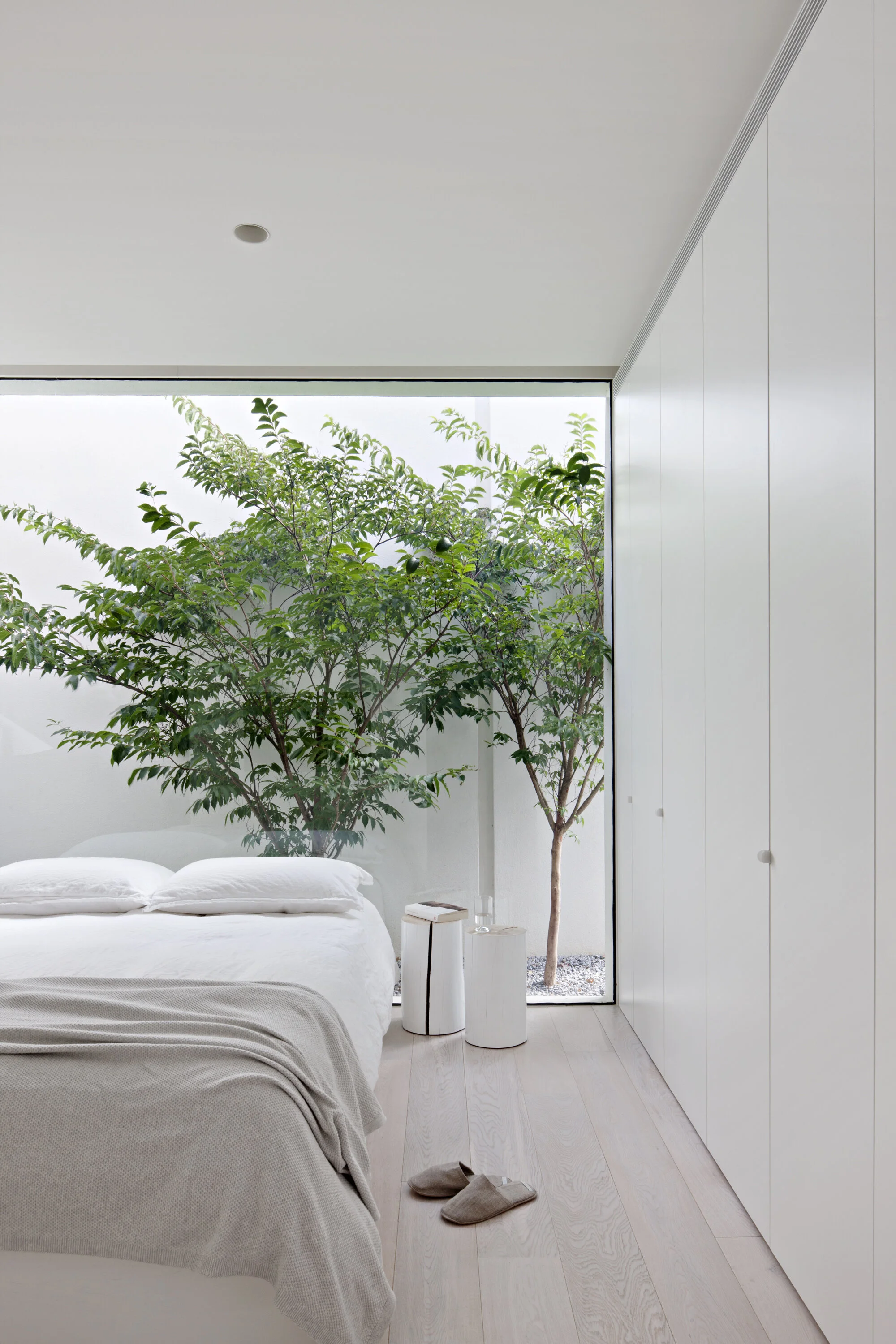 Within, the interior spaces are divided into two zones, with the living area and private areas of sleeping and bathing to one side and the adjacent side of the home housing the master bedroom space and ensuite. An internal garden is located within the core of the house, acting as a link between the two areas, which must be passed through to reach either side of the spaces.