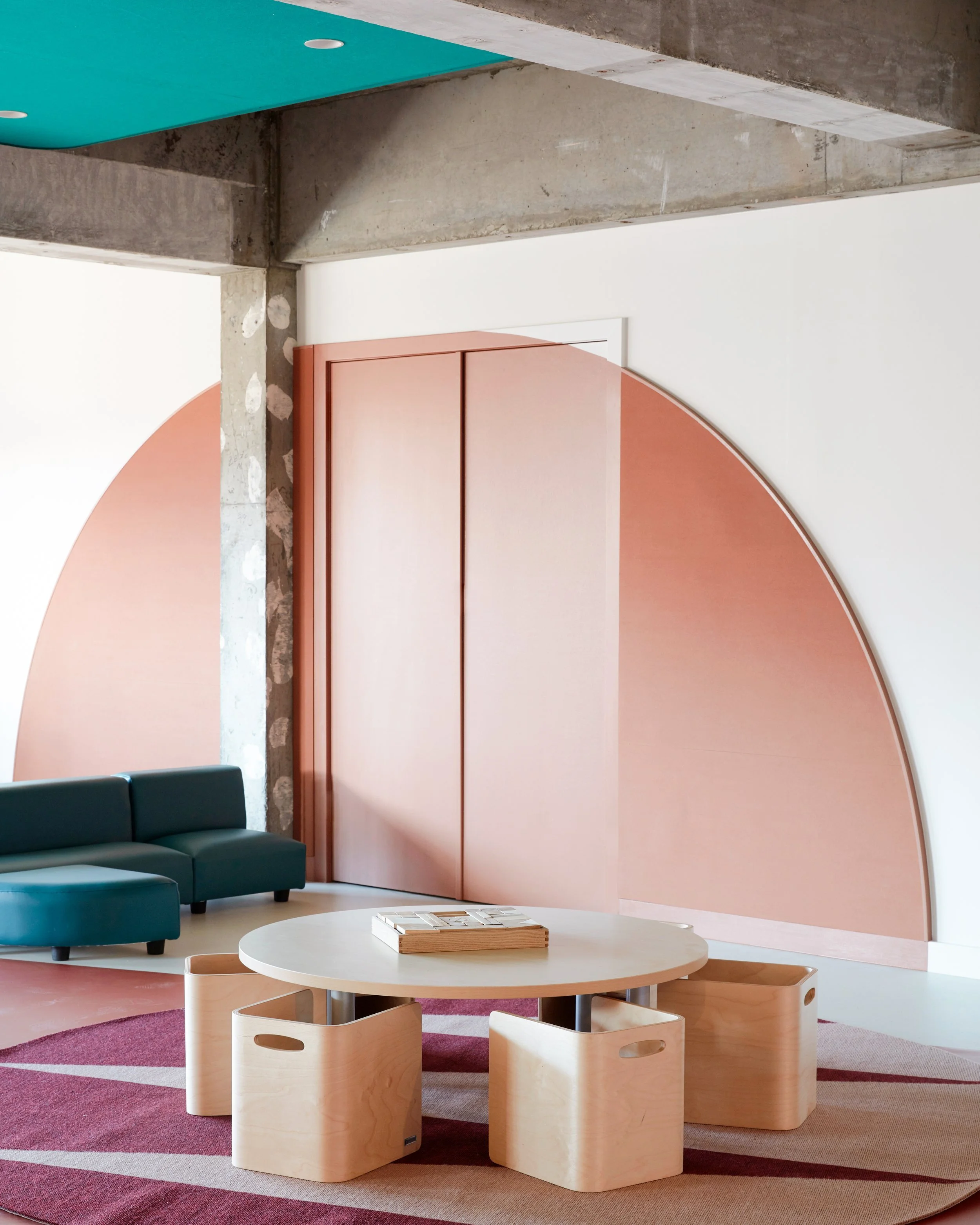 Located in Inner city Melbourne in the suburb of Cremorne, this previously brutalist building was repurposed by Perkins Architecture into an inspiring education centre for young children. Designer Danielle Brustman created a series of soft spaces painted in a defused rainbow palette, creating complex and colourful visuals that please the eye.