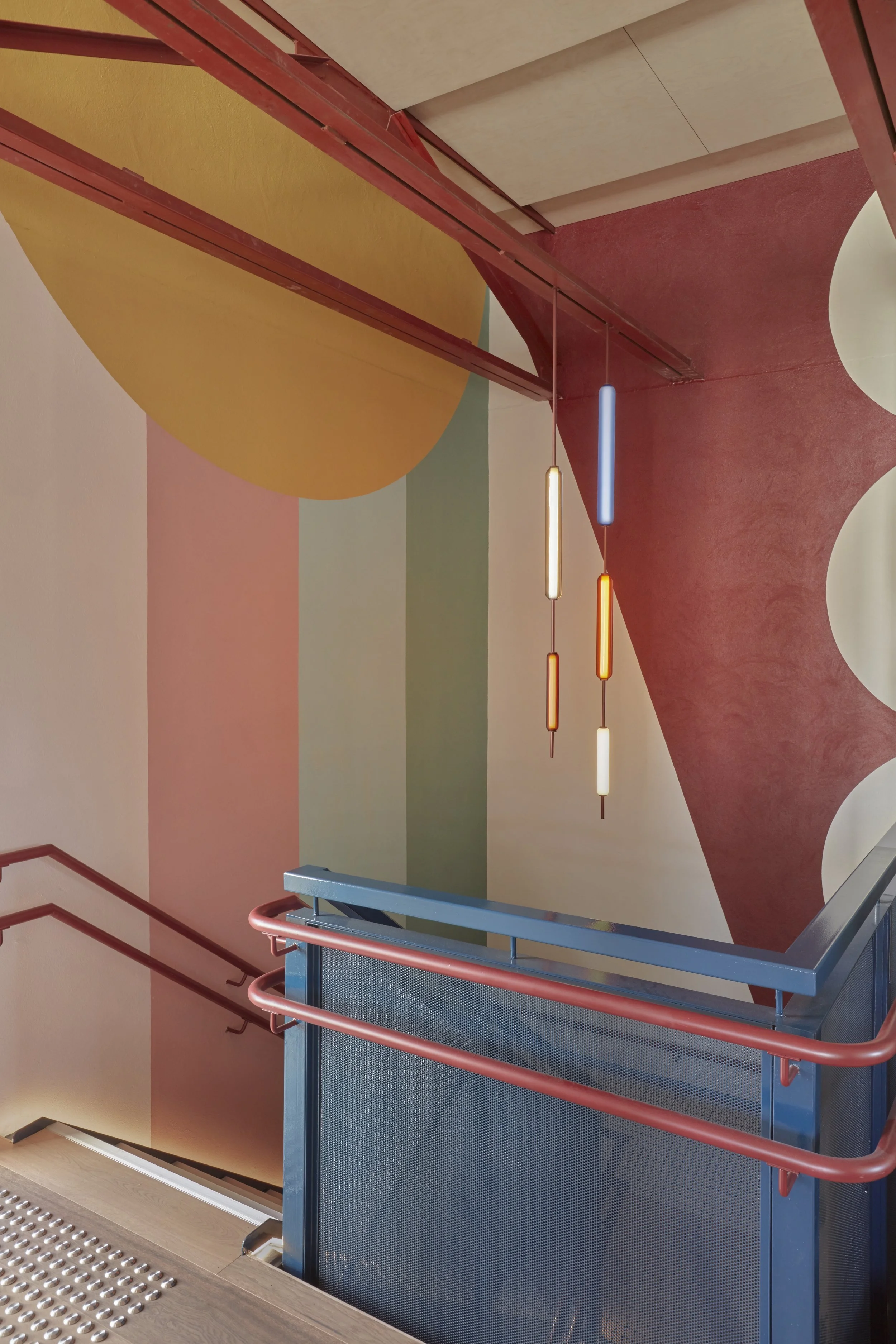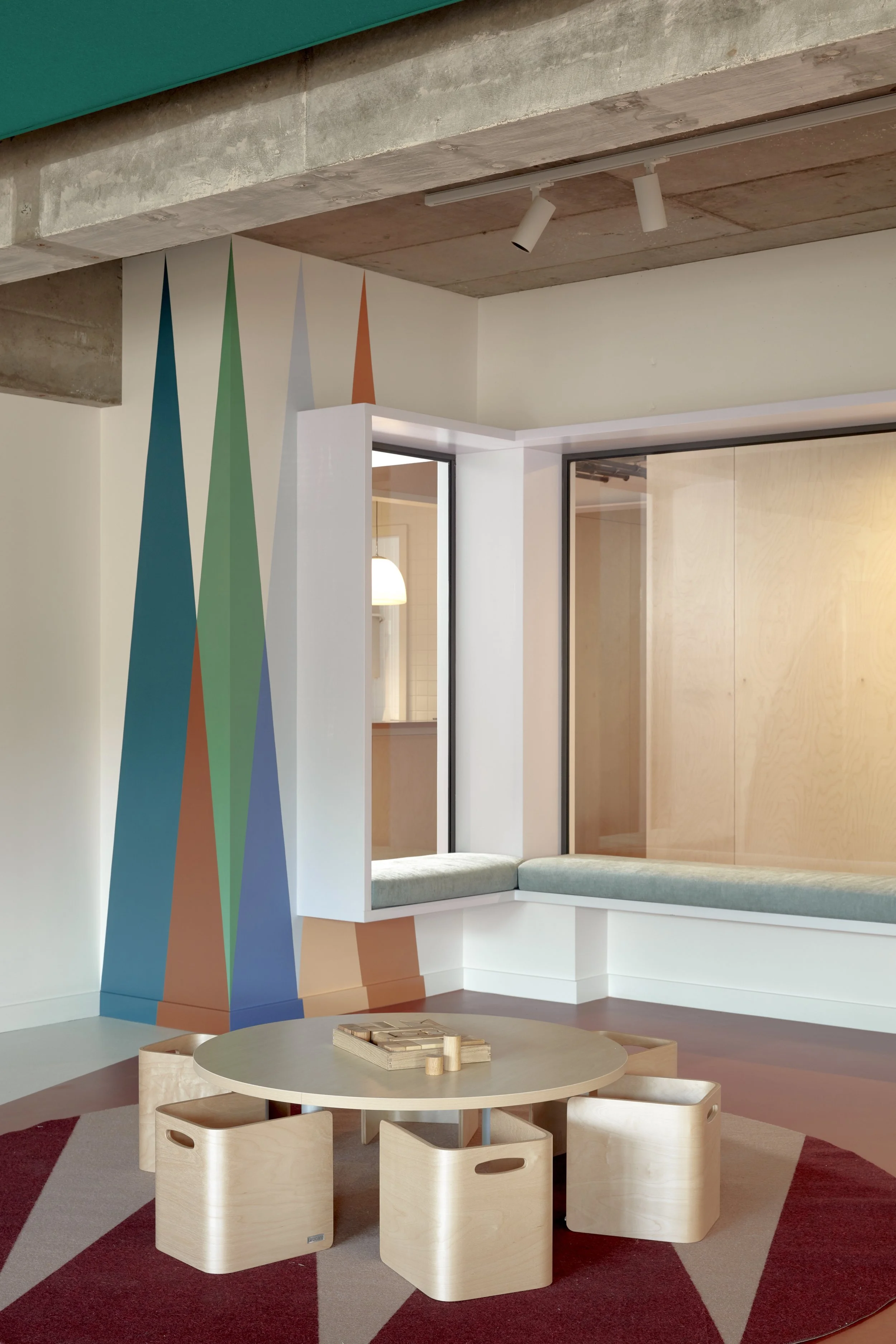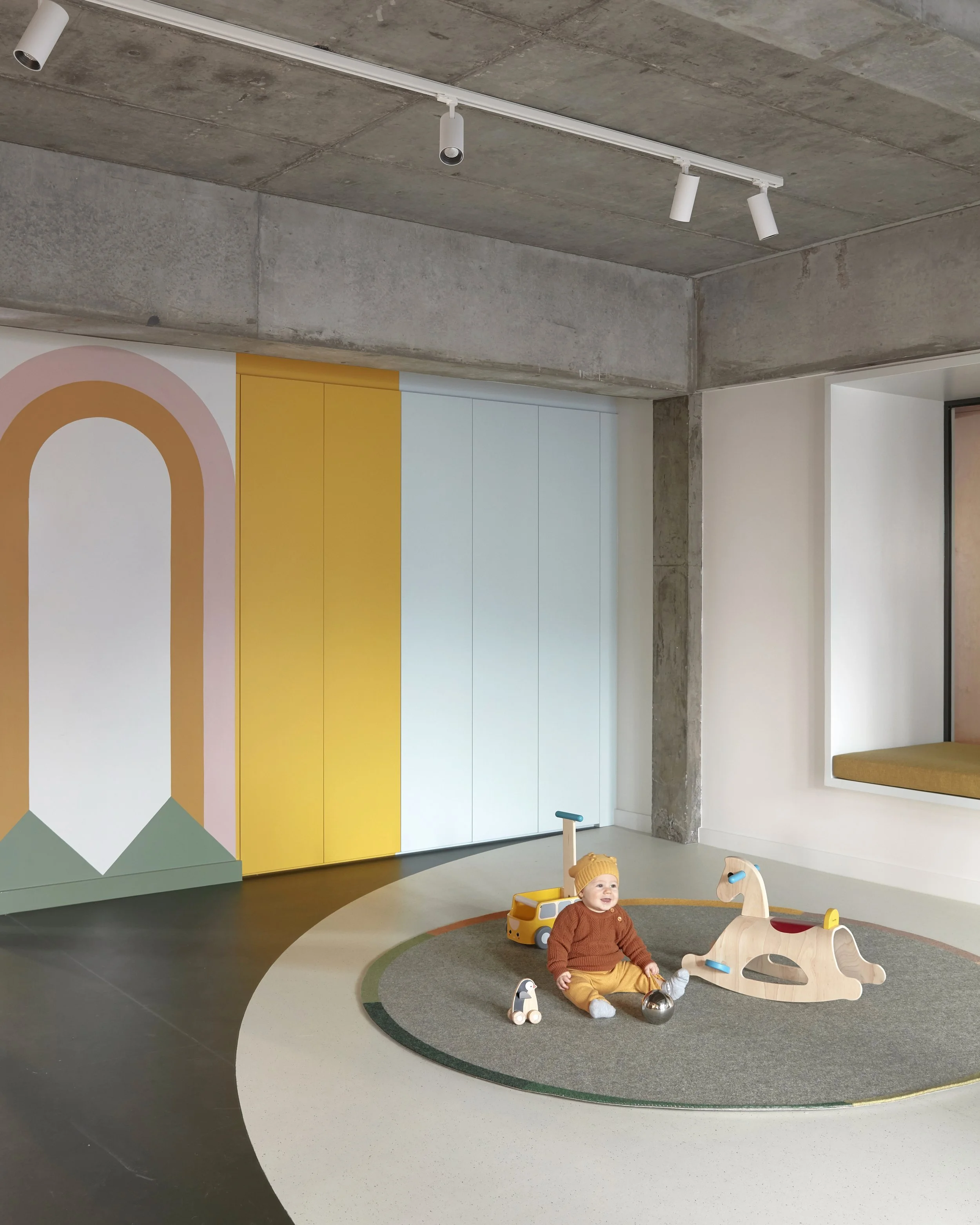 In the reimagining of the brutalist interior, each wall, surface and material was treated with a new range of colour blends of varying hue and materiality. Each space shows off its own delicately hand-painted murals by artist Ben Maitland, with every playroom following its own motif as a source of inspiration and creativity for the kids, including river, lake, meadow, forest, star, sun and cloud room.