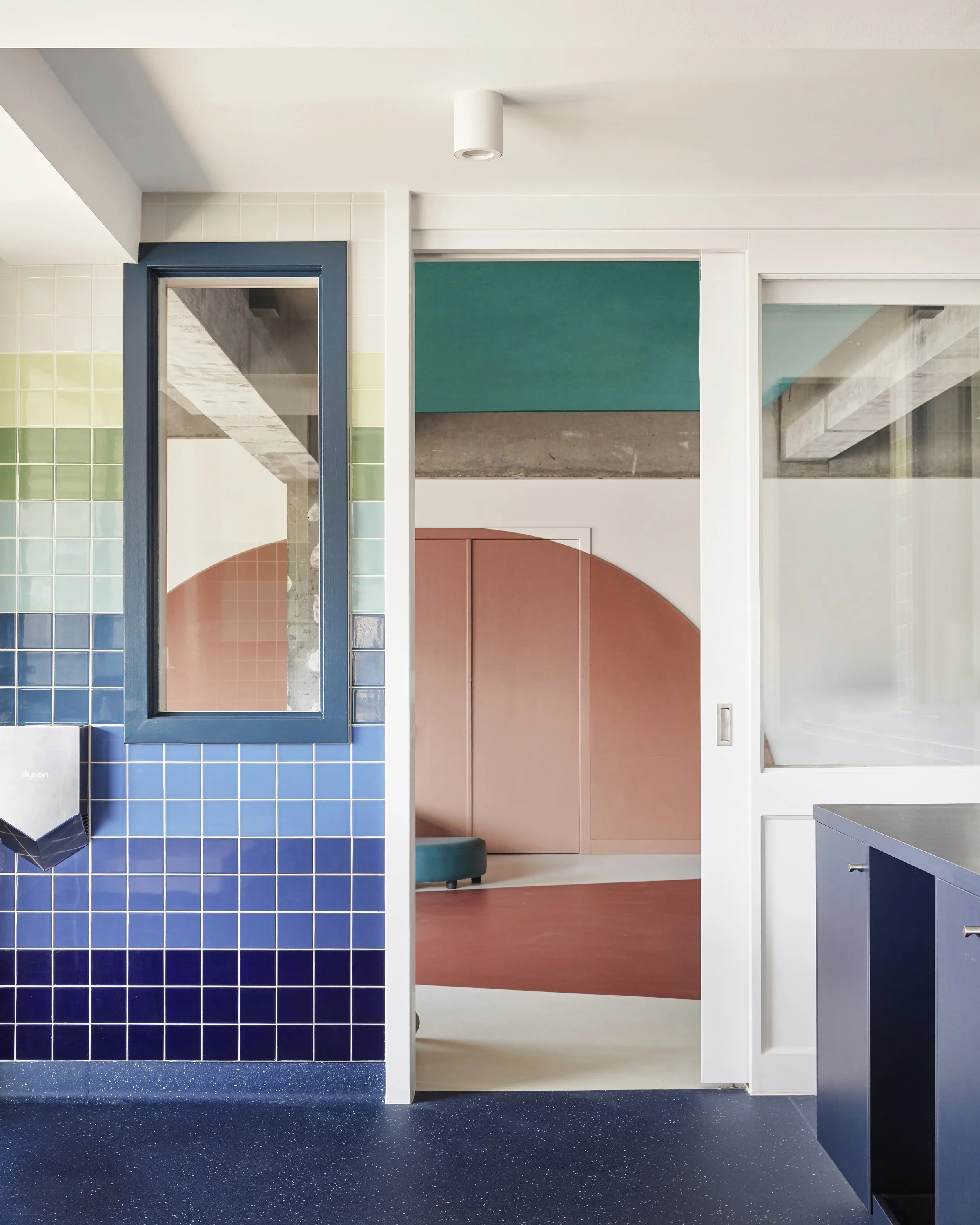 In the reimagining of the brutalist interior, each wall, surface and material was treated with a new range of colour blends of varying hue and materiality.