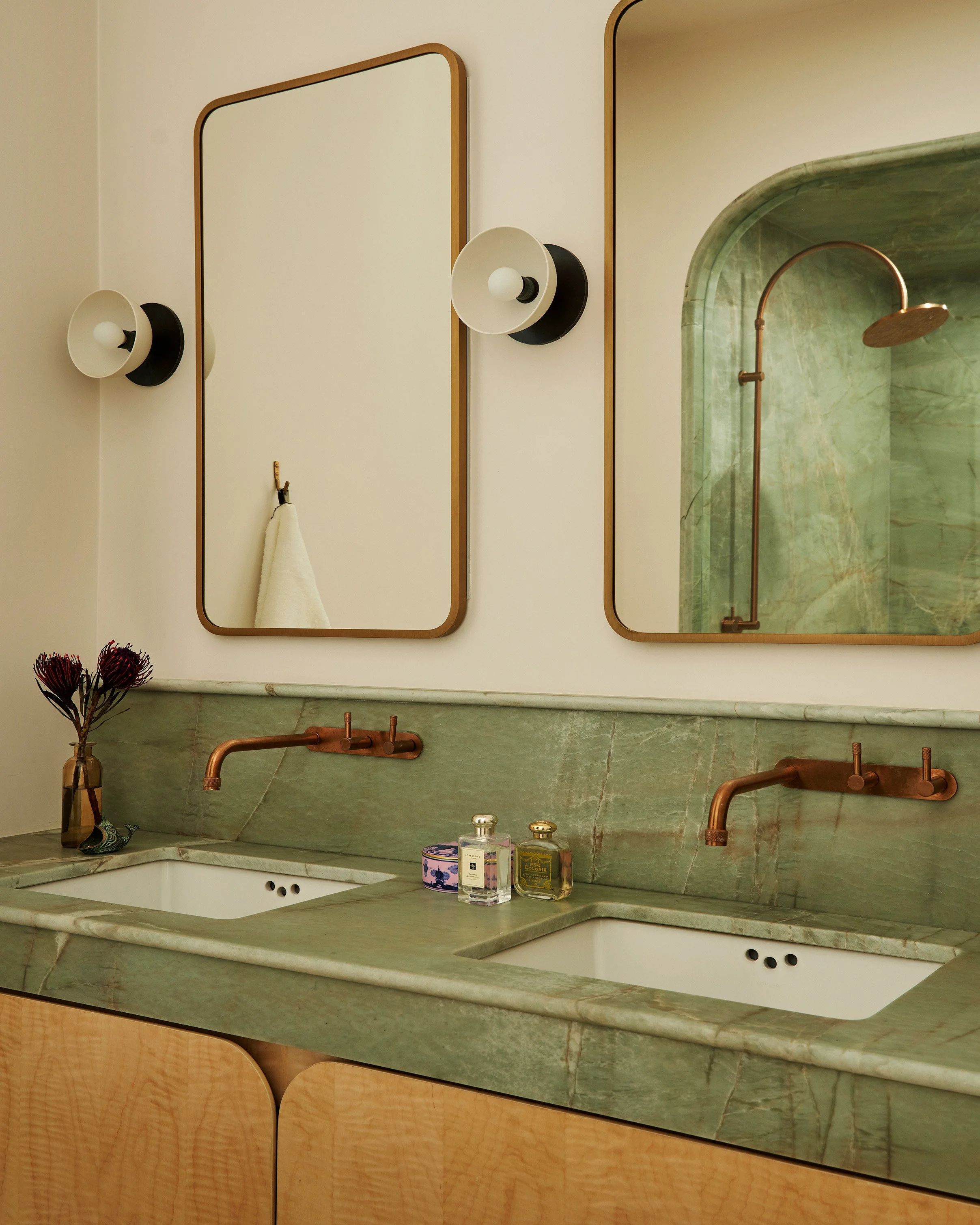 Colour does the zoning within the home. In the main bedroom, blush tones and natural greens soften light and temper scale, bringing a quiet, restorative mood to both bedroom and bath. In the children’s rooms and play spaces, the palette brightens—vibrant, buoyant hues that invite invention without tipping into noise. Throughout, finishes are chosen to sit comfortably alongside one another: polished with matte, veined with plain, solids with subtle pattern—each choice reinforcing the home’s measured rhythm.