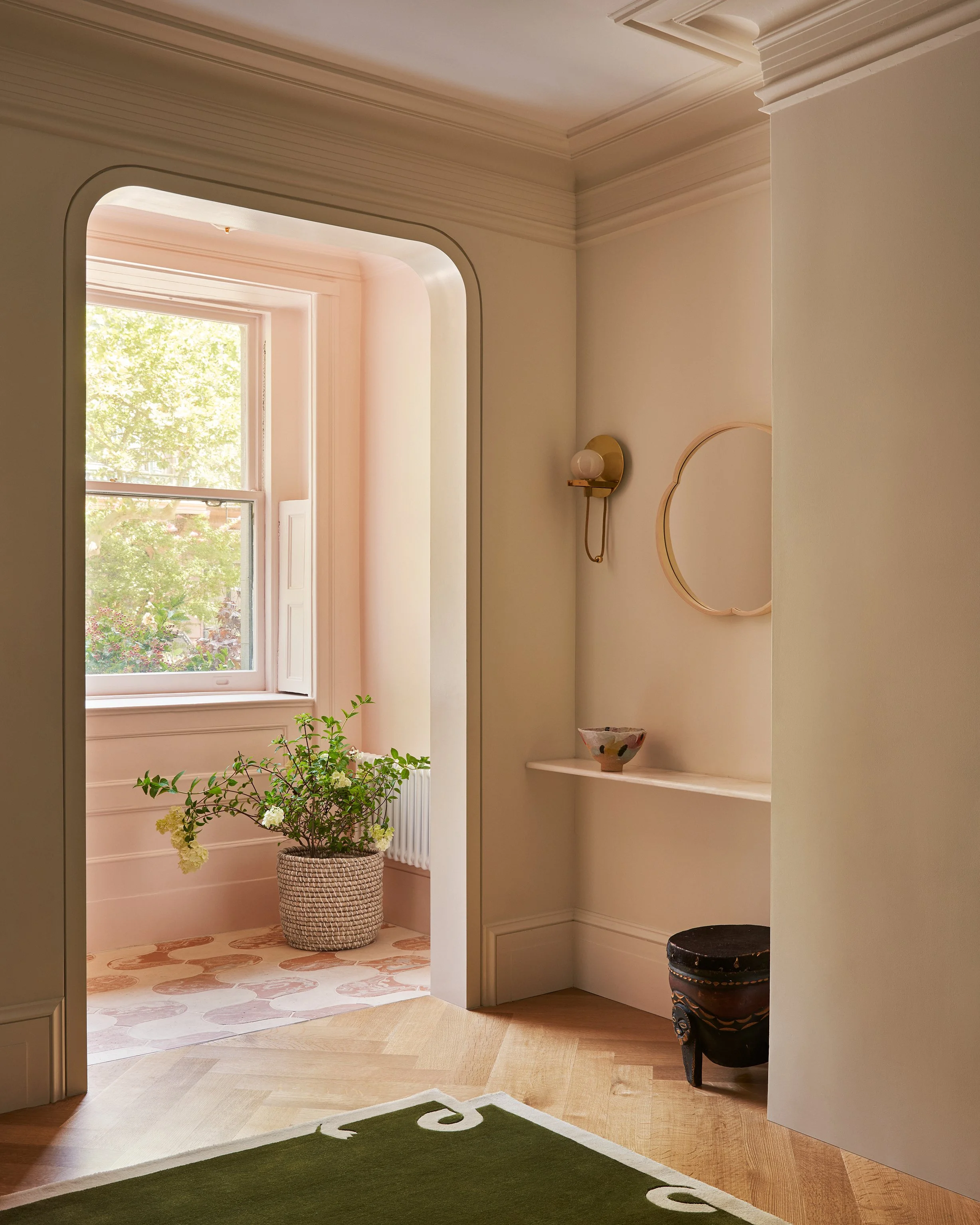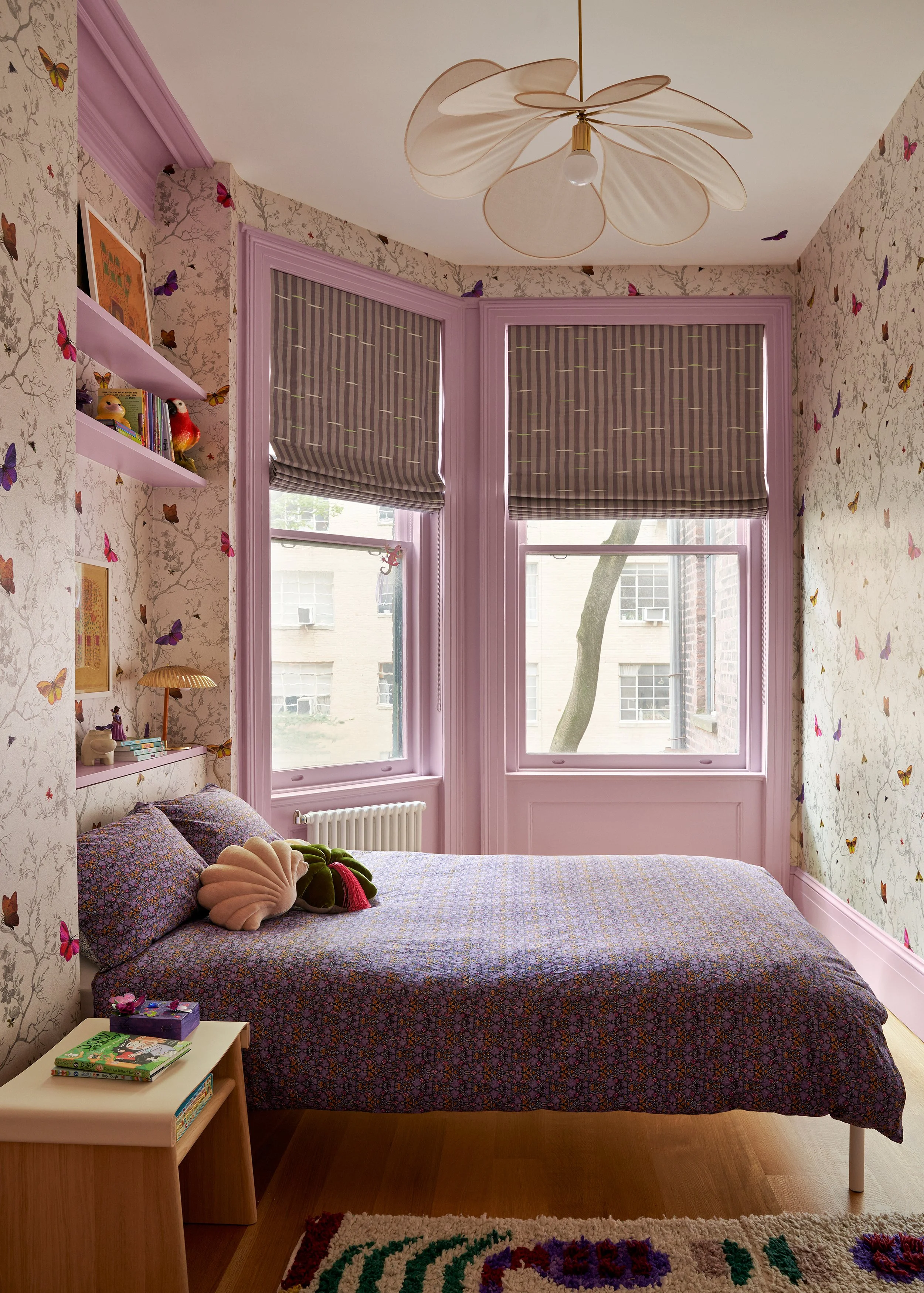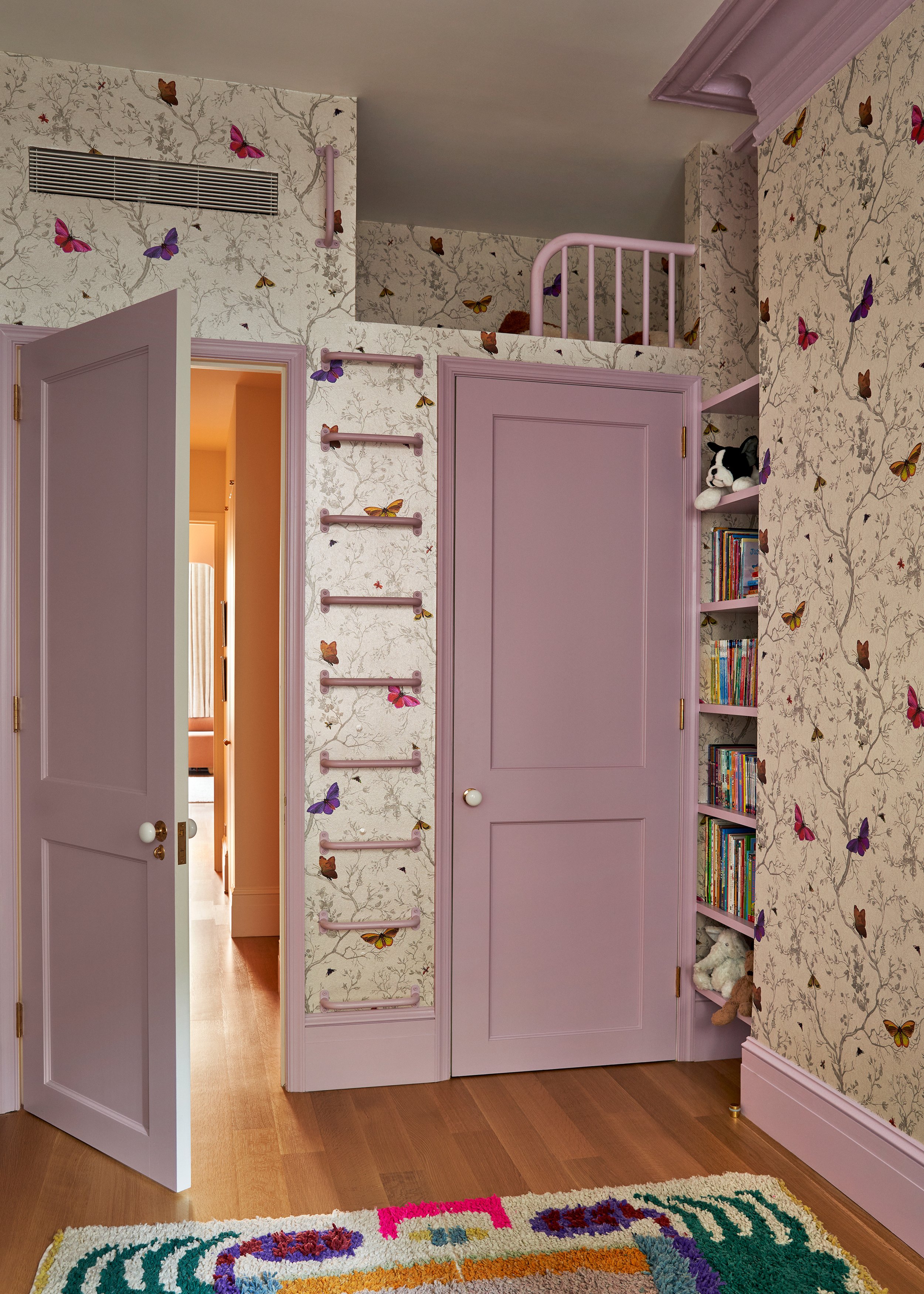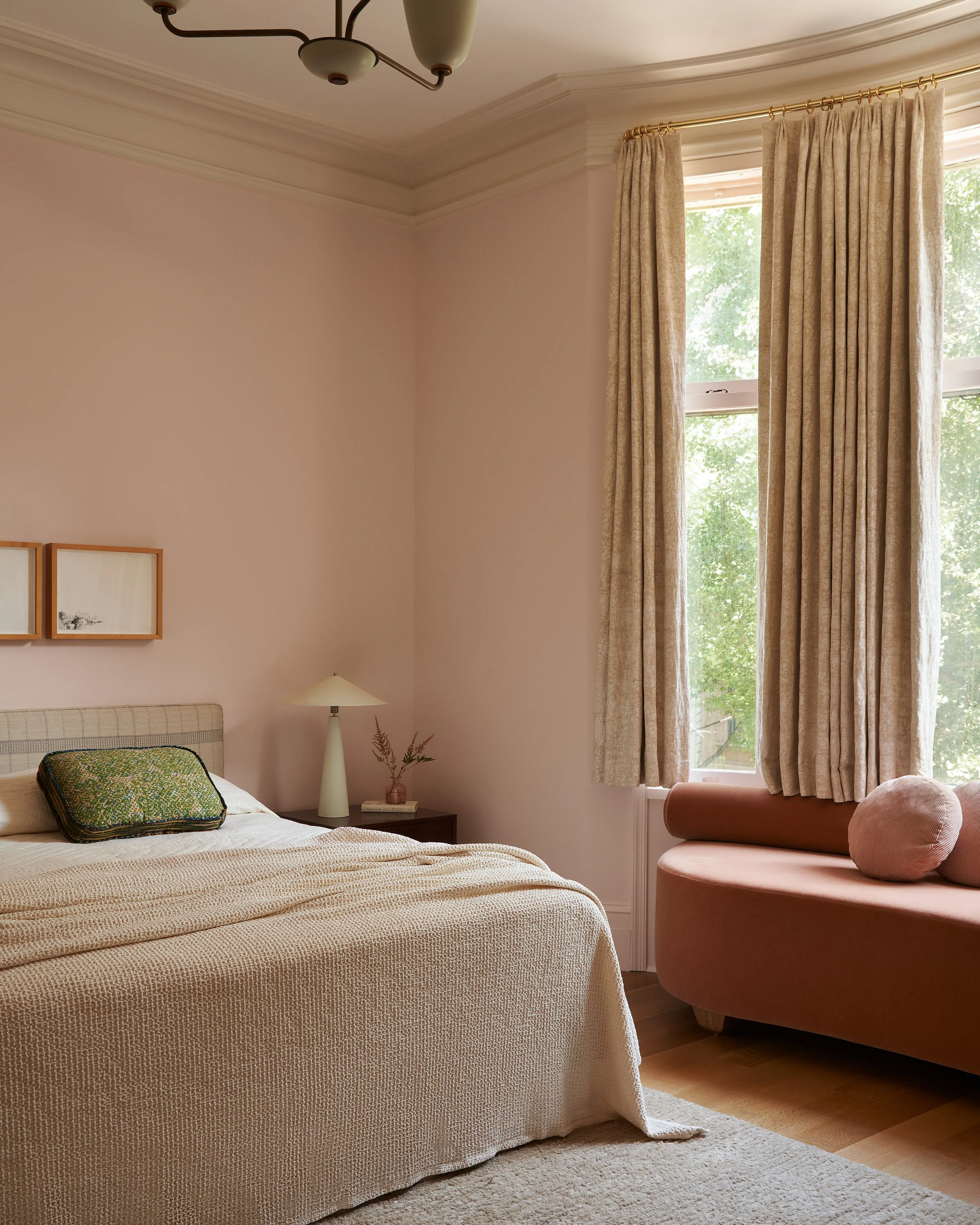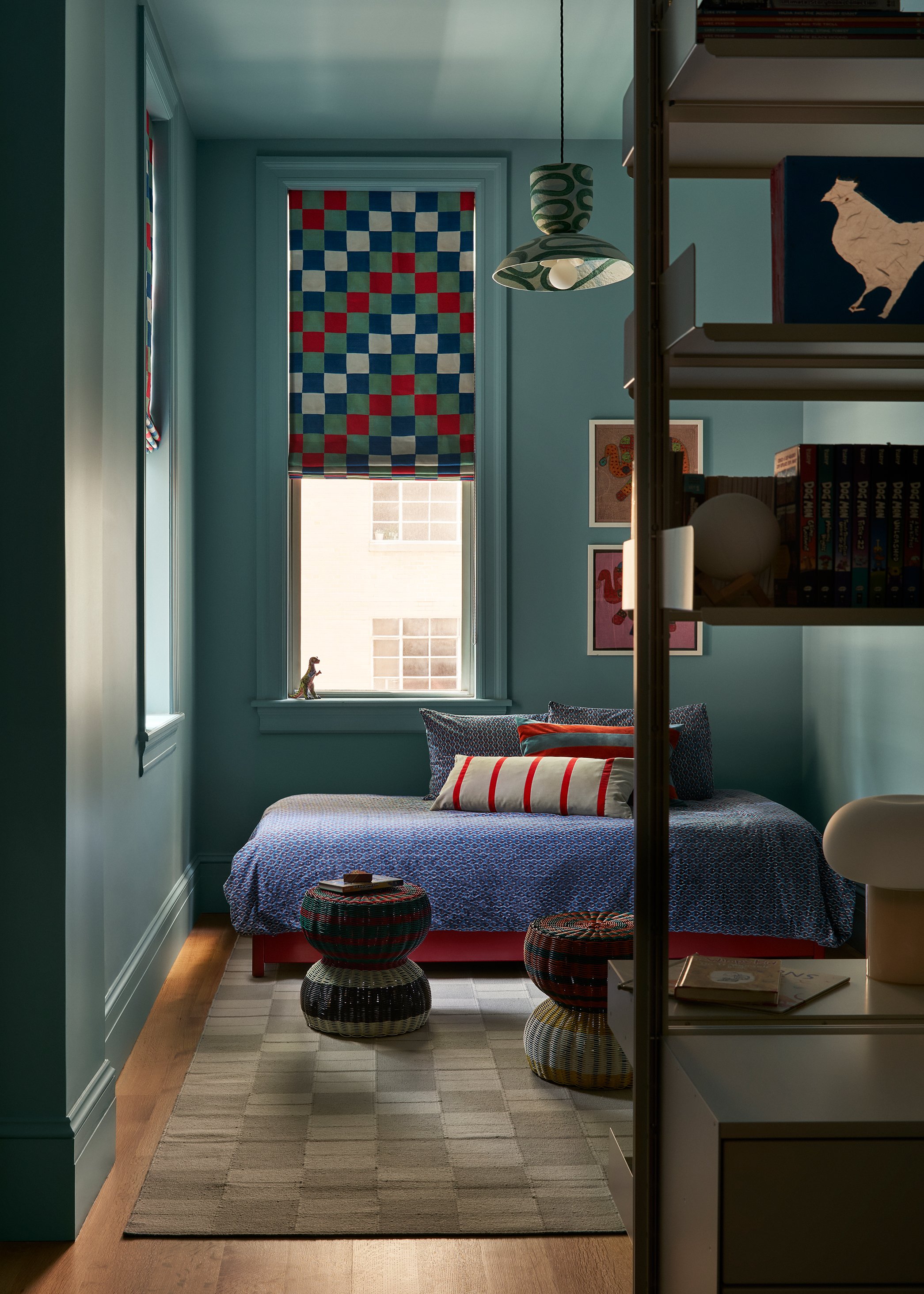 Upstairs, every bedroom lives on one level; the two children’s rooms are small but lifted by colour, texture and pattern.