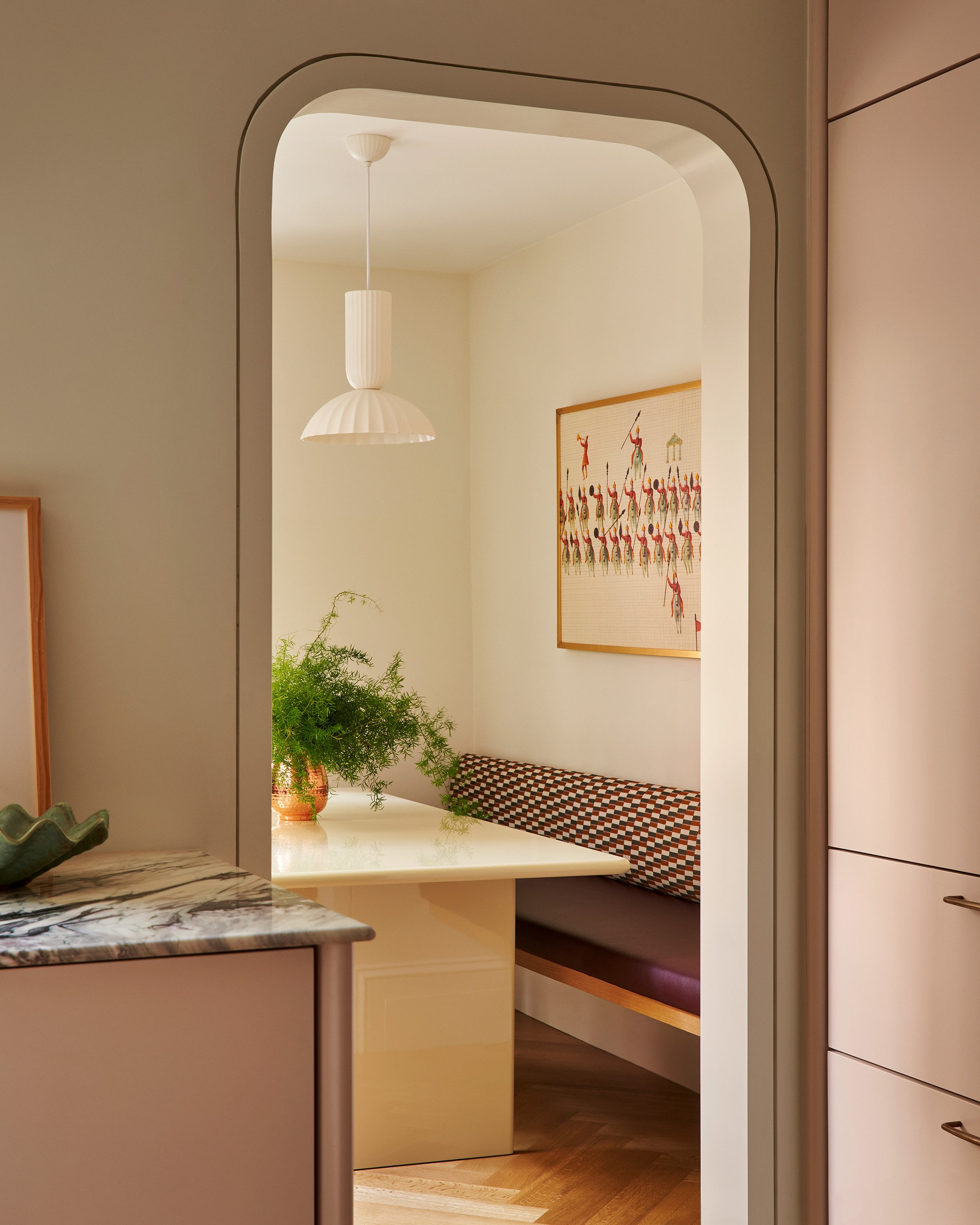 The dining nook beyond the arched doorway features a custom upholstered banquette seat, designed to save space.
