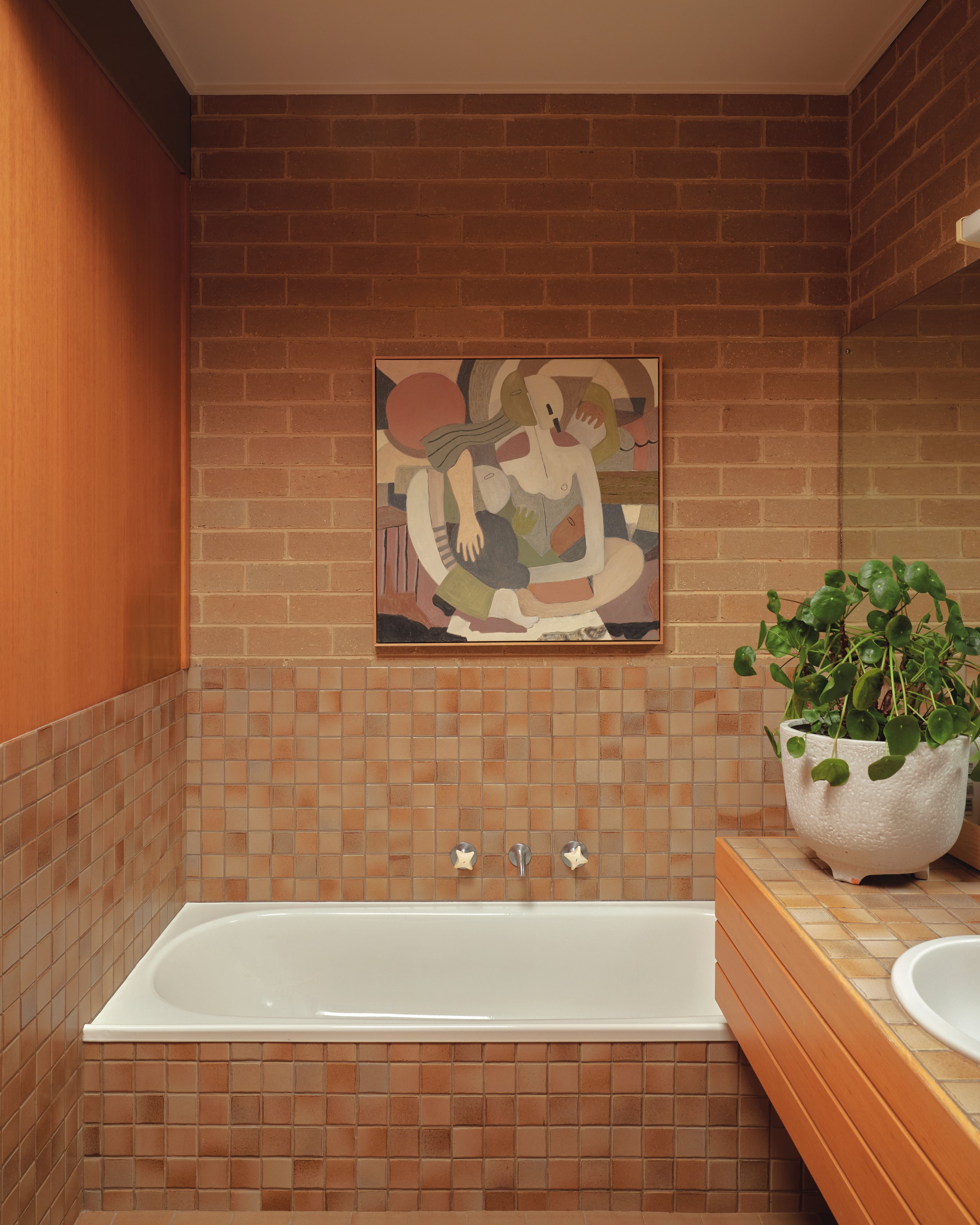 The main bathroom, with its original mosaic tiles and timber joinery, is a testament to the quality of the home craftmanship. Artwork by Charlotte Swiden.