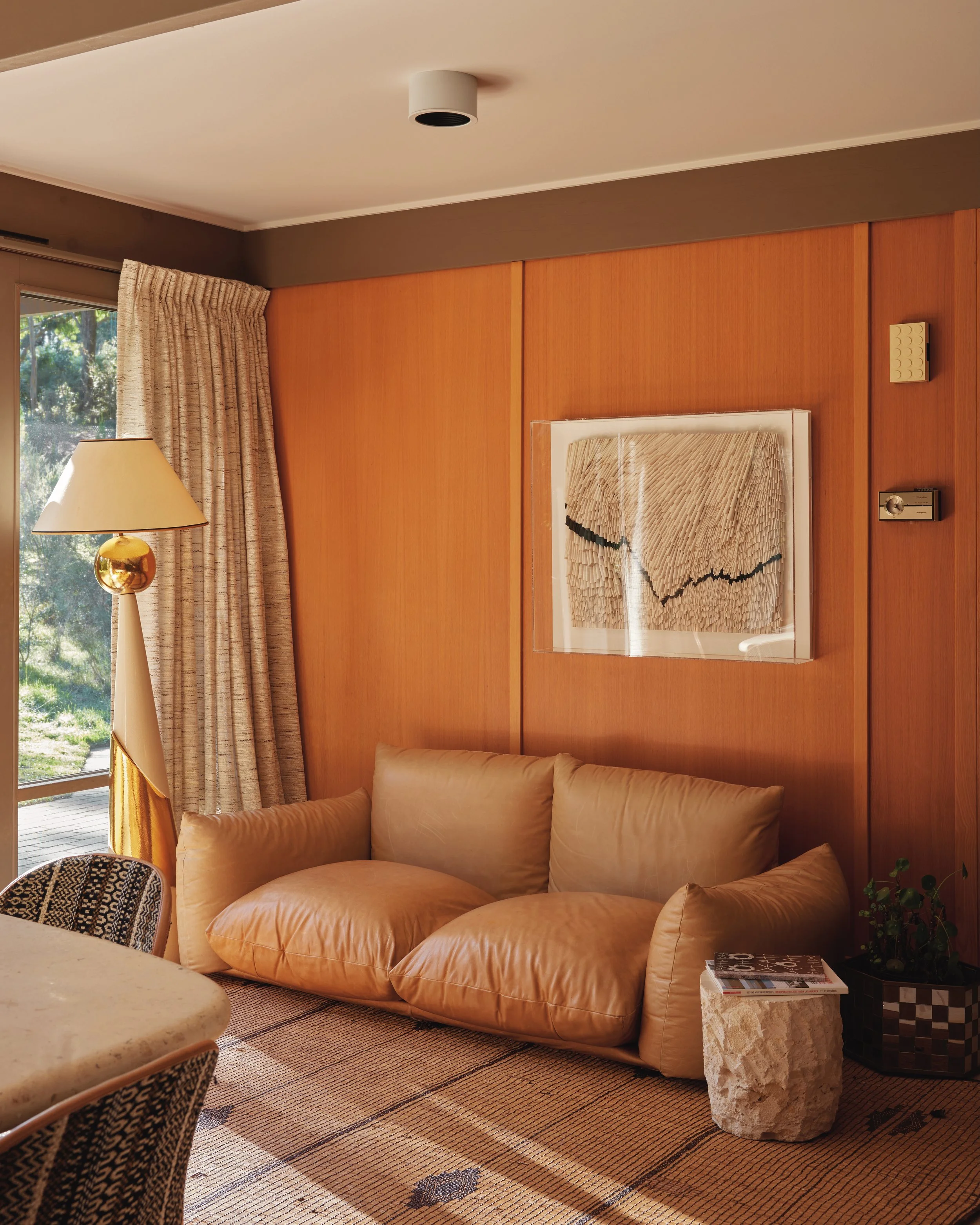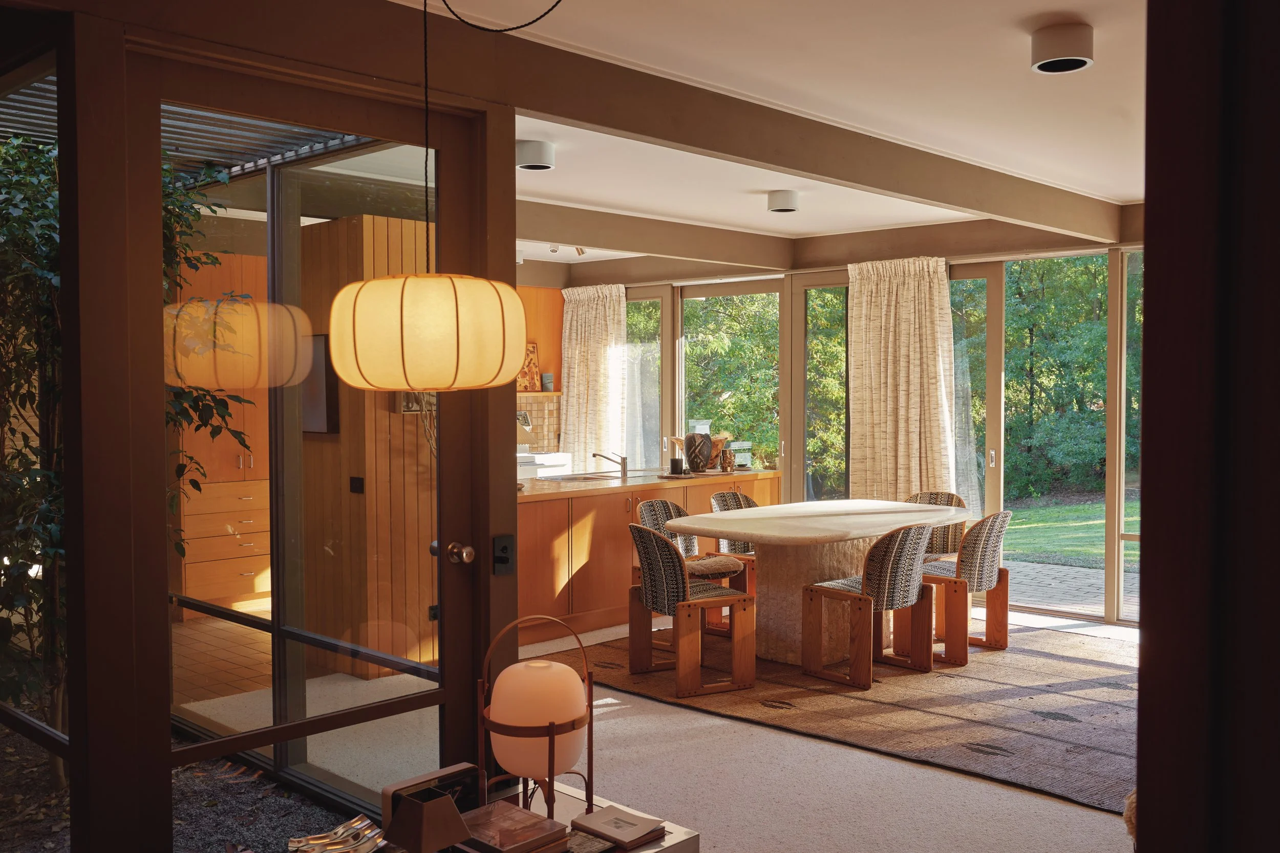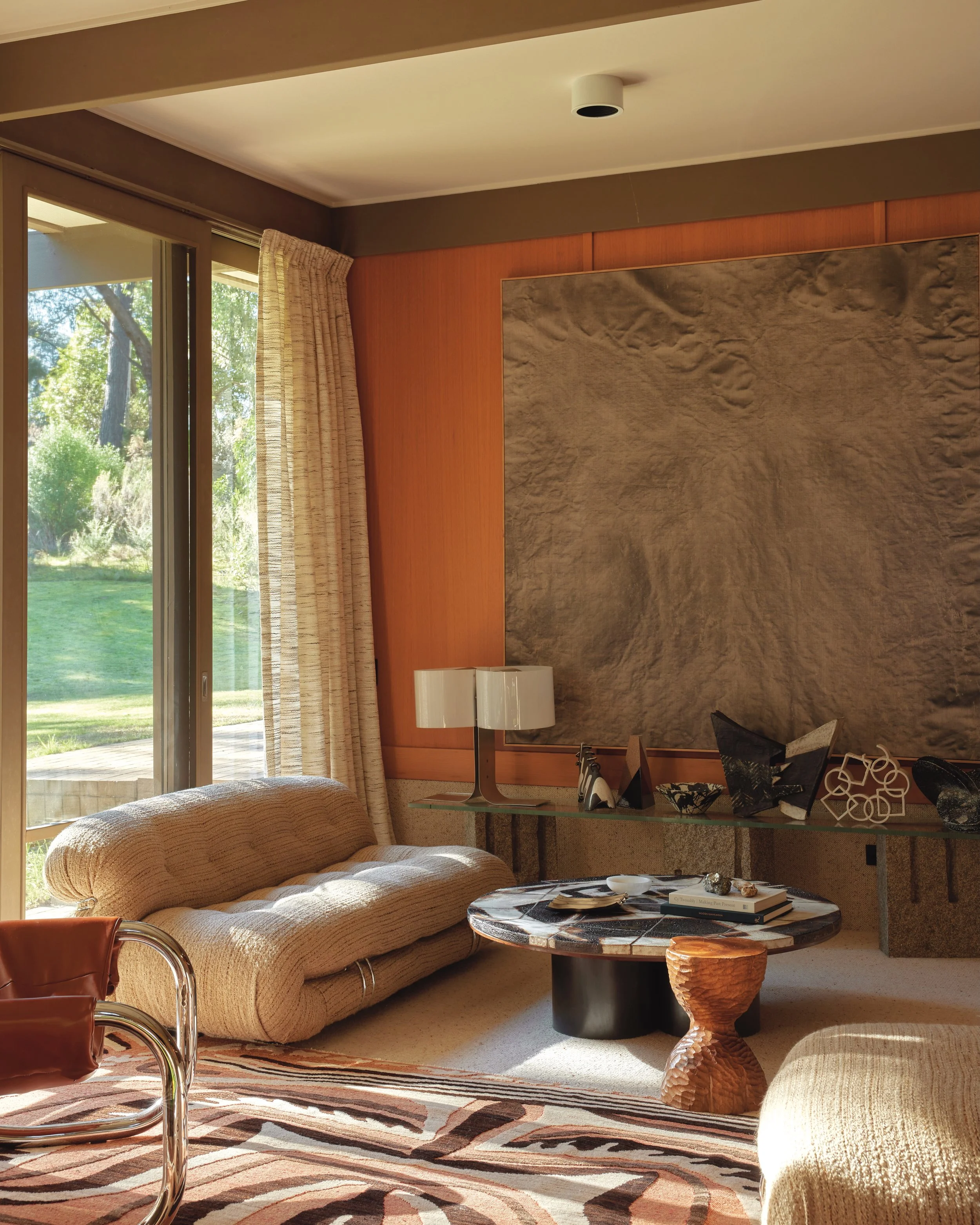 The current owner of Light Well House, interior decorator Simone Haag, has for many years cultivated a love of classic mid-century design. Already on the lookout for a home in the area, she and husband Rhys chanced upon Light Well during a family walk through the nature reserve. Clearly unoccupied, the house captured the couple’s imagination, sparking a mission to make it their own. After a lengthy but ultimately successful campaign, they moved in with their three daughters—and Simone’s impressive collection of vintage furniture, ceramics, rugs and artwork.