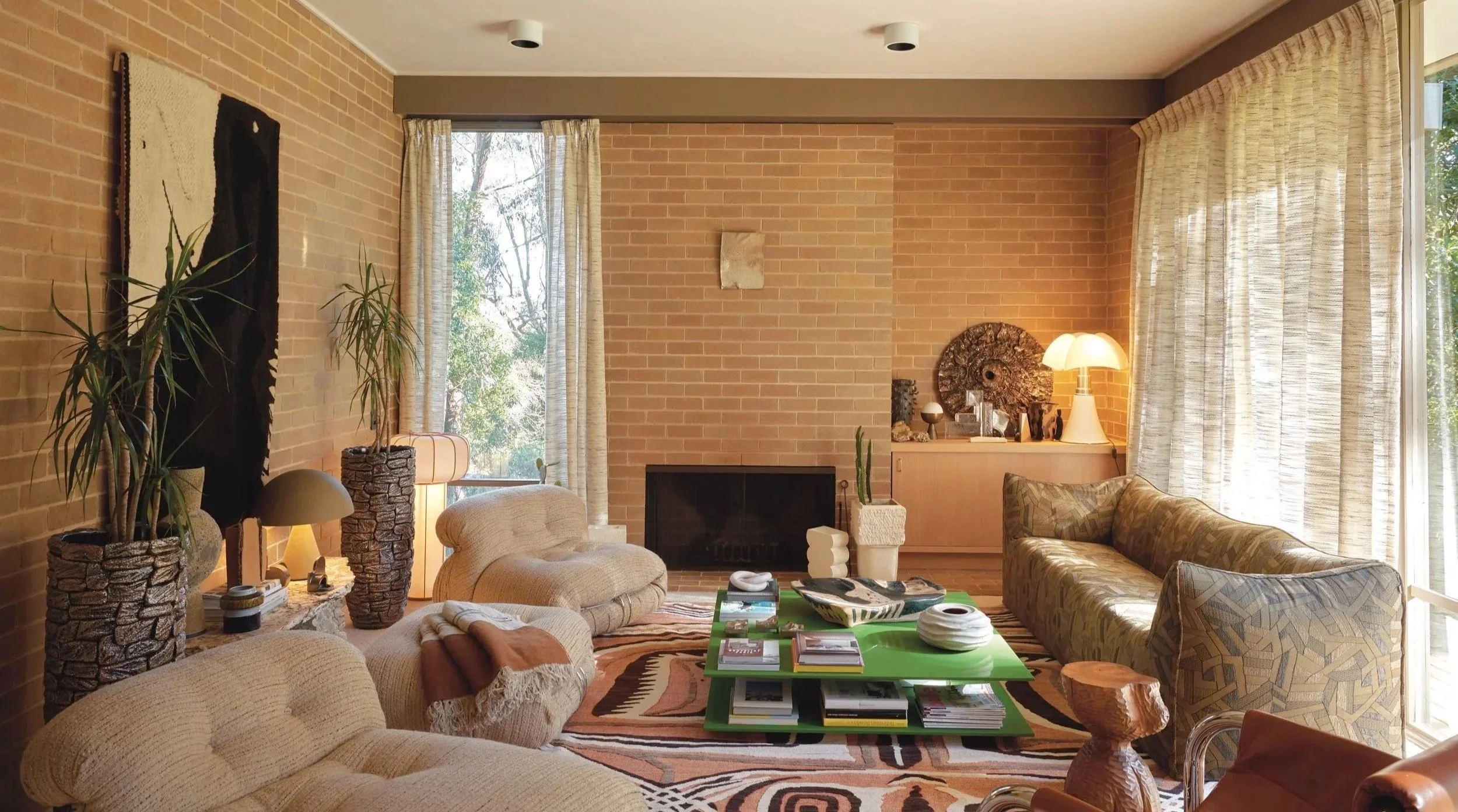 “The emphasis on textural layering is bold yet tonally harmonious, with the shapely 70s Italian furniture adding a playful touch.”