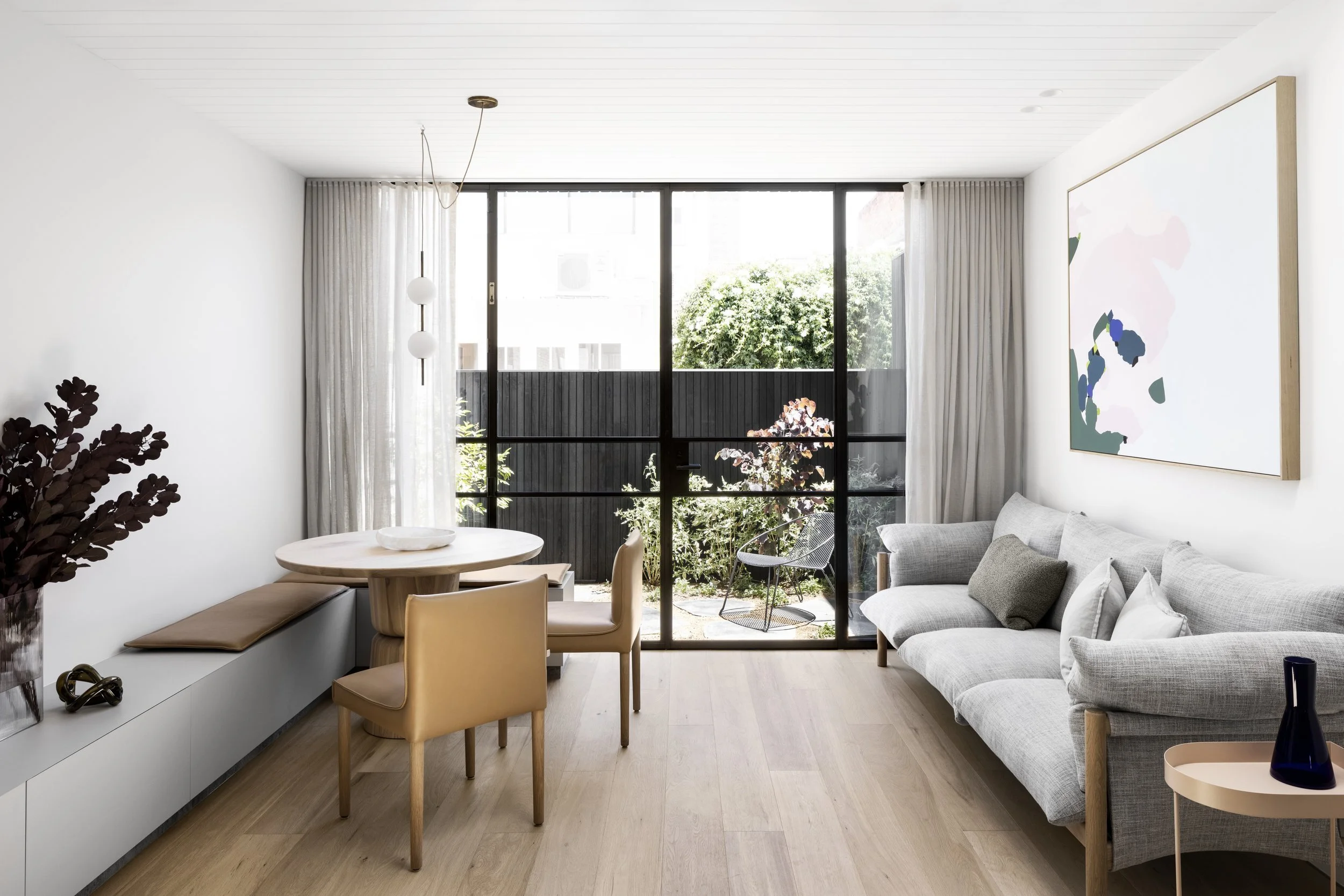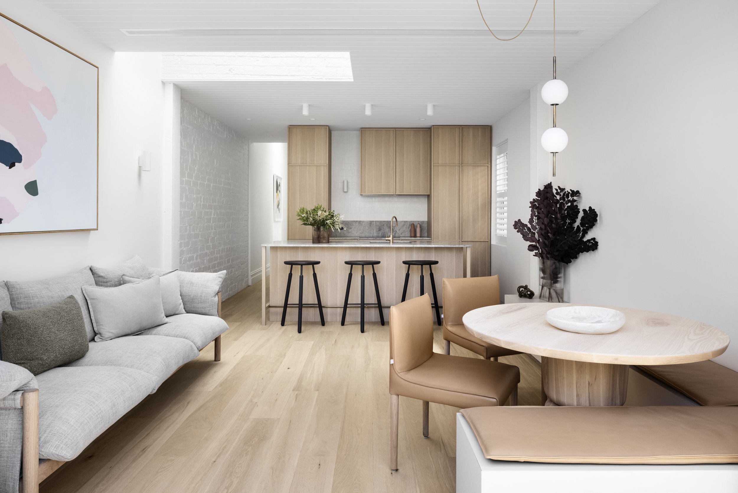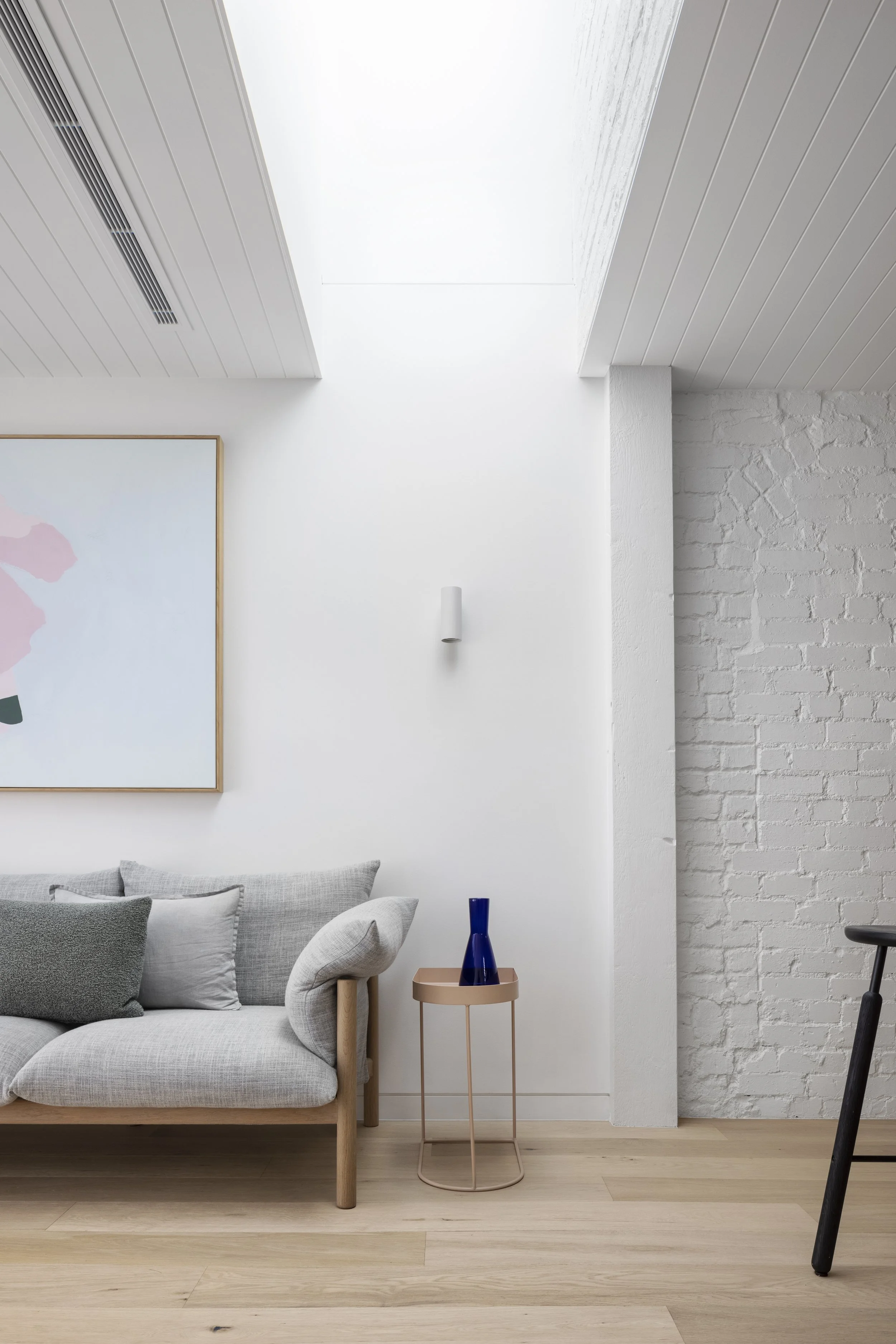 The main original room at the rear of the dwelling featured an unusual lowered ceiling and second storey, which was refreshed and rebuilt to comply with the BCA and extended to the rear, creating an open plan living space connected to the small courtyard.