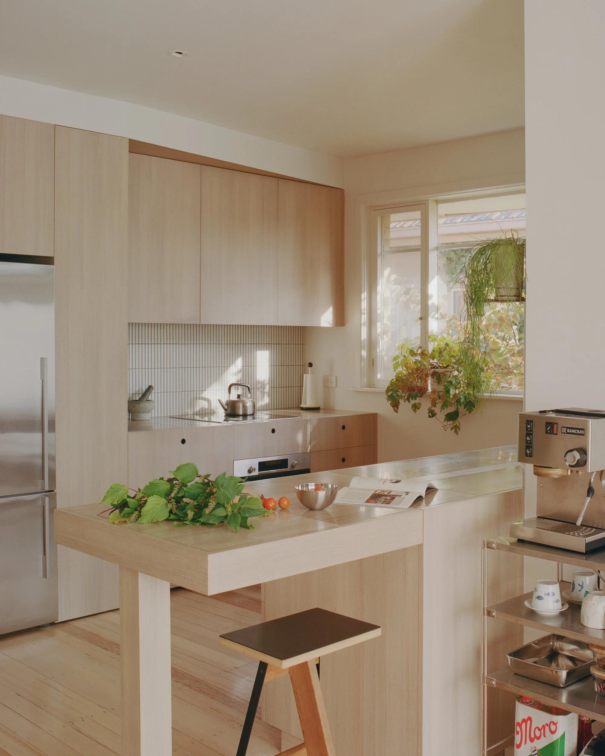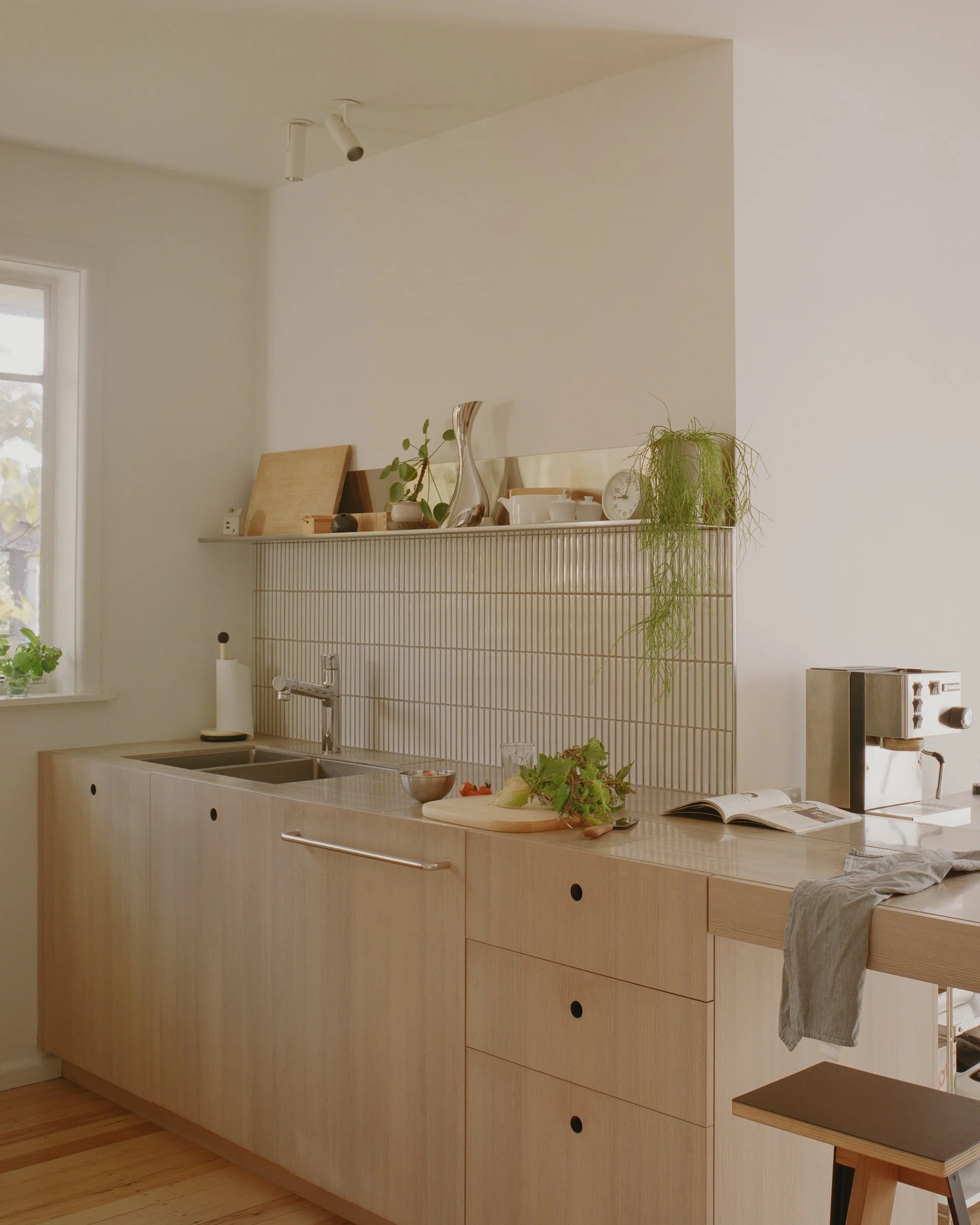 A restrained palette of whitewashed veneer, travertine benchtops, and Japanese finger tiles gives the kitchen a refined, harmonious quality, balancing materiality.