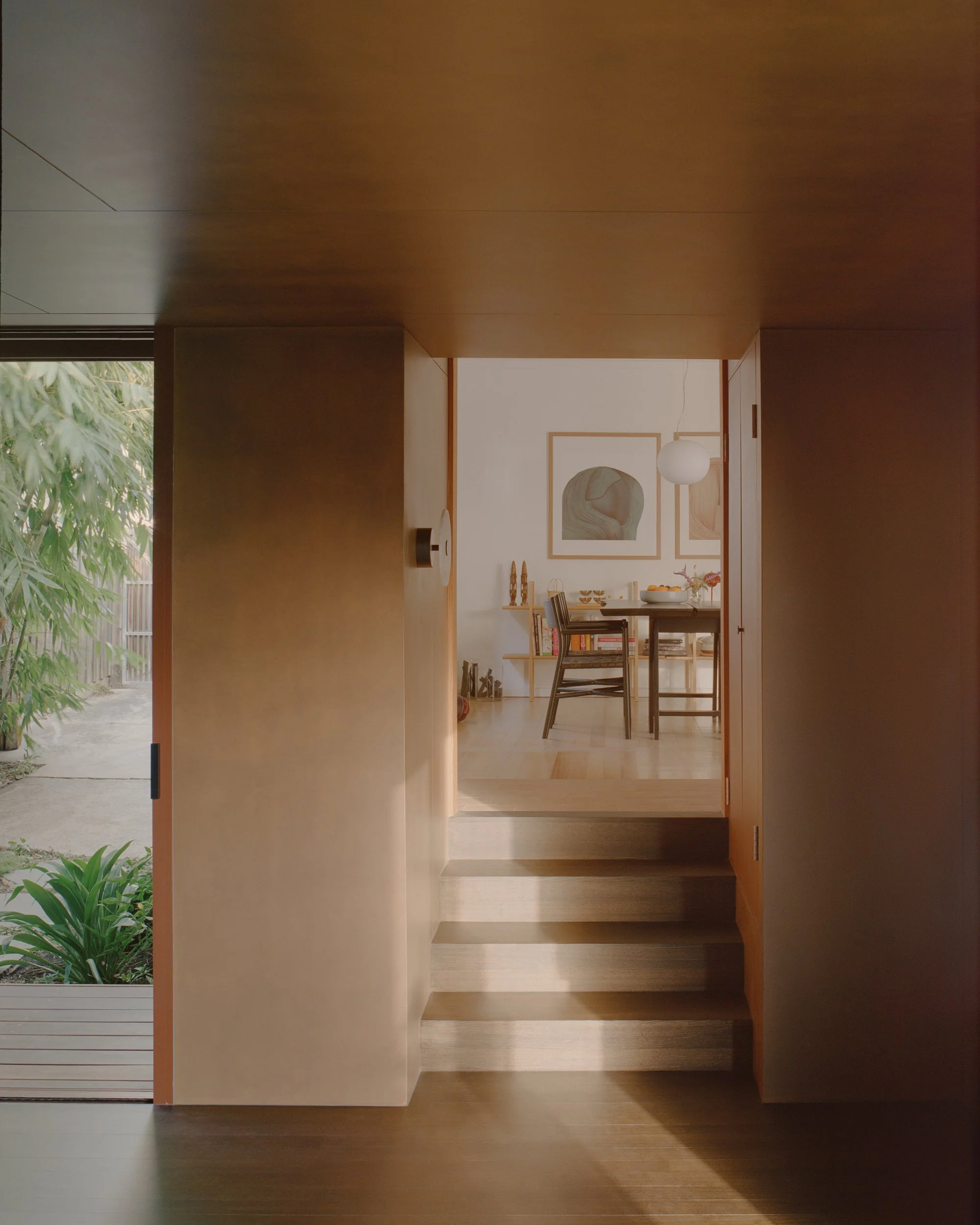 Rather than reshaping the site entirely, the design works with the existing land, which is sunken slightly below street level. Subtle level changes move through the house, guiding circulation and creating a sense of flow between spaces. Steps, plinths and sunken zones introduce moments of pause, softening transitions while reinforcing the connection to the garden. At the front, the bedrooms sit below street level, overlooking a planted garden where an established eucalypt provides shade and respite from the summer sun.