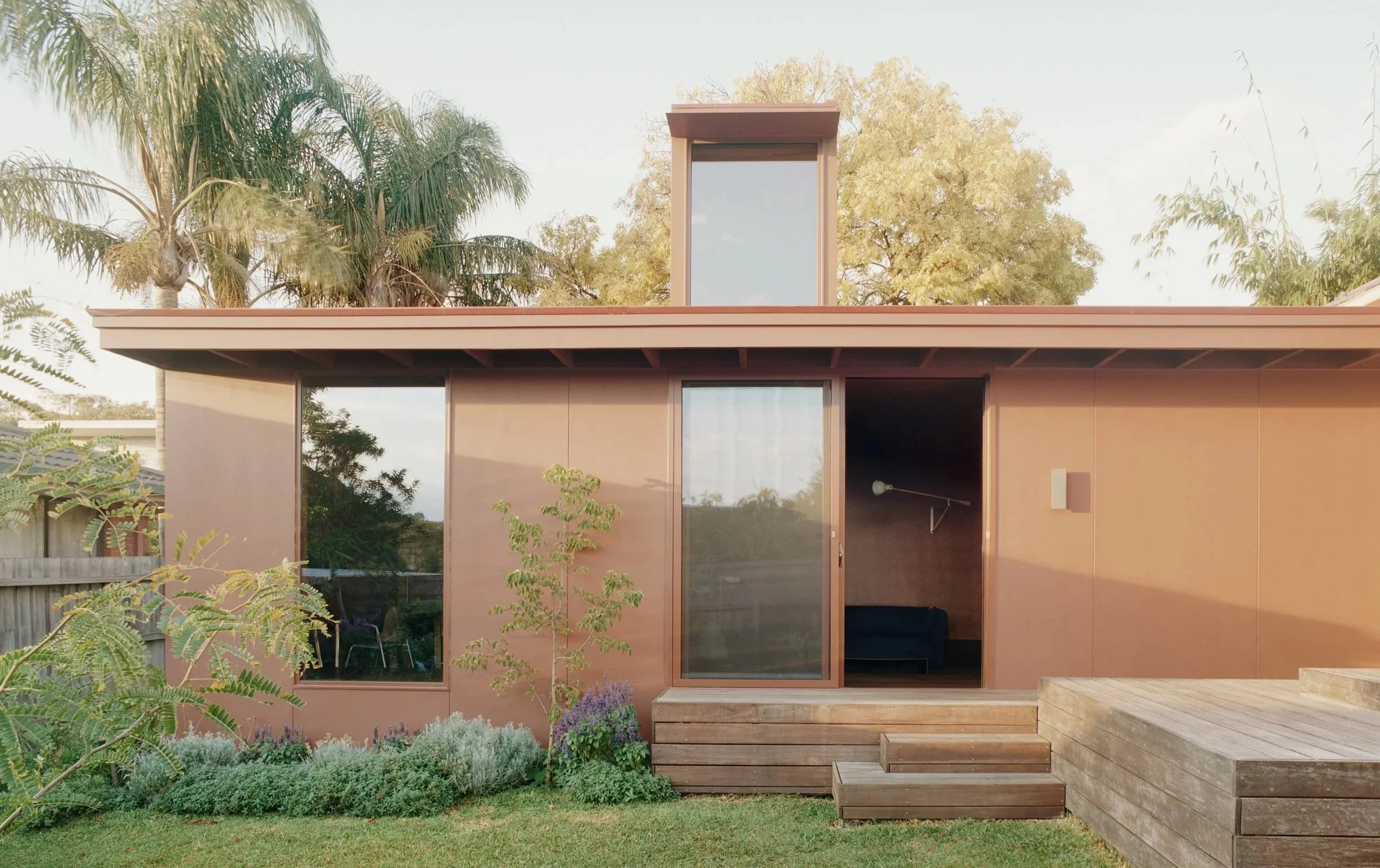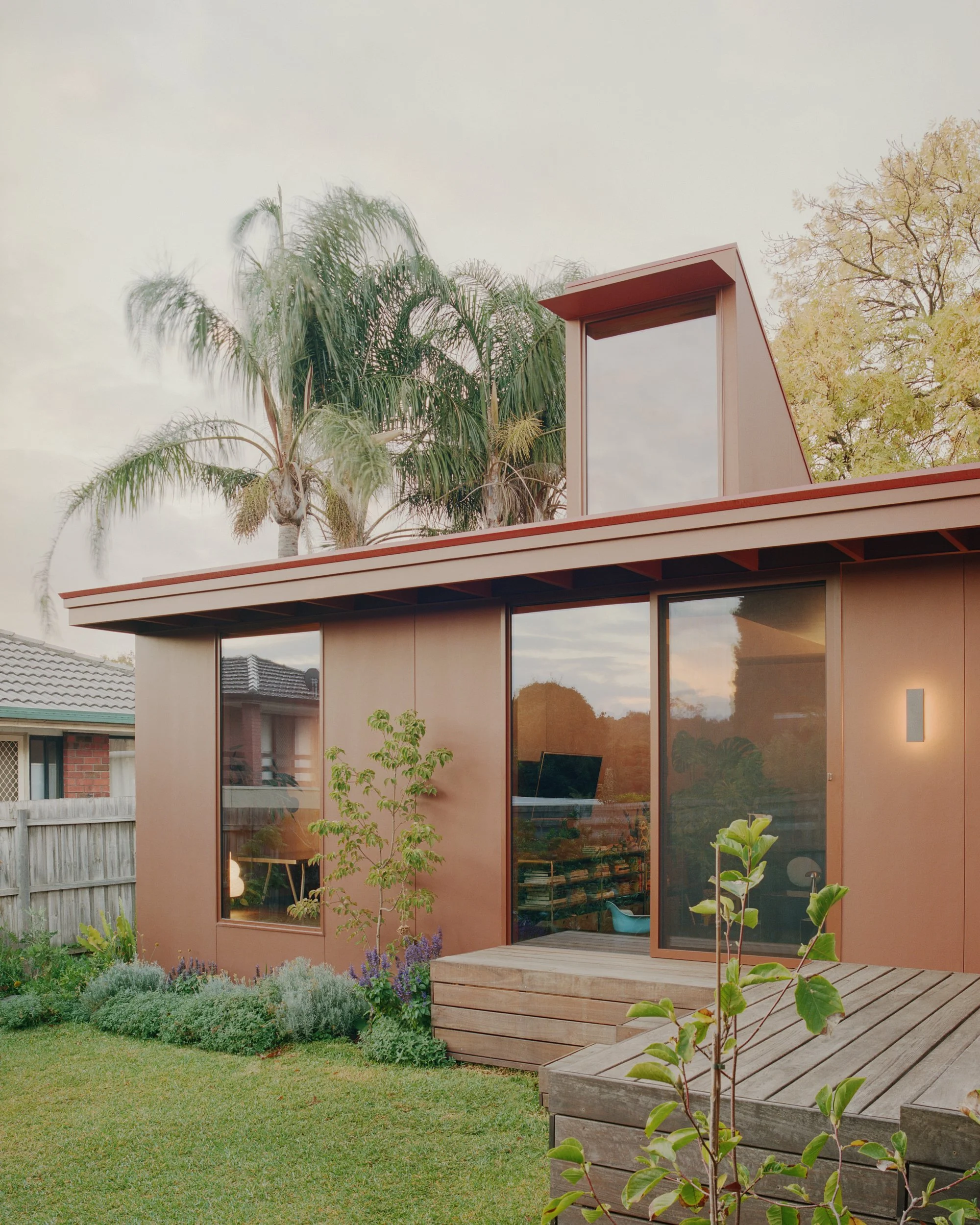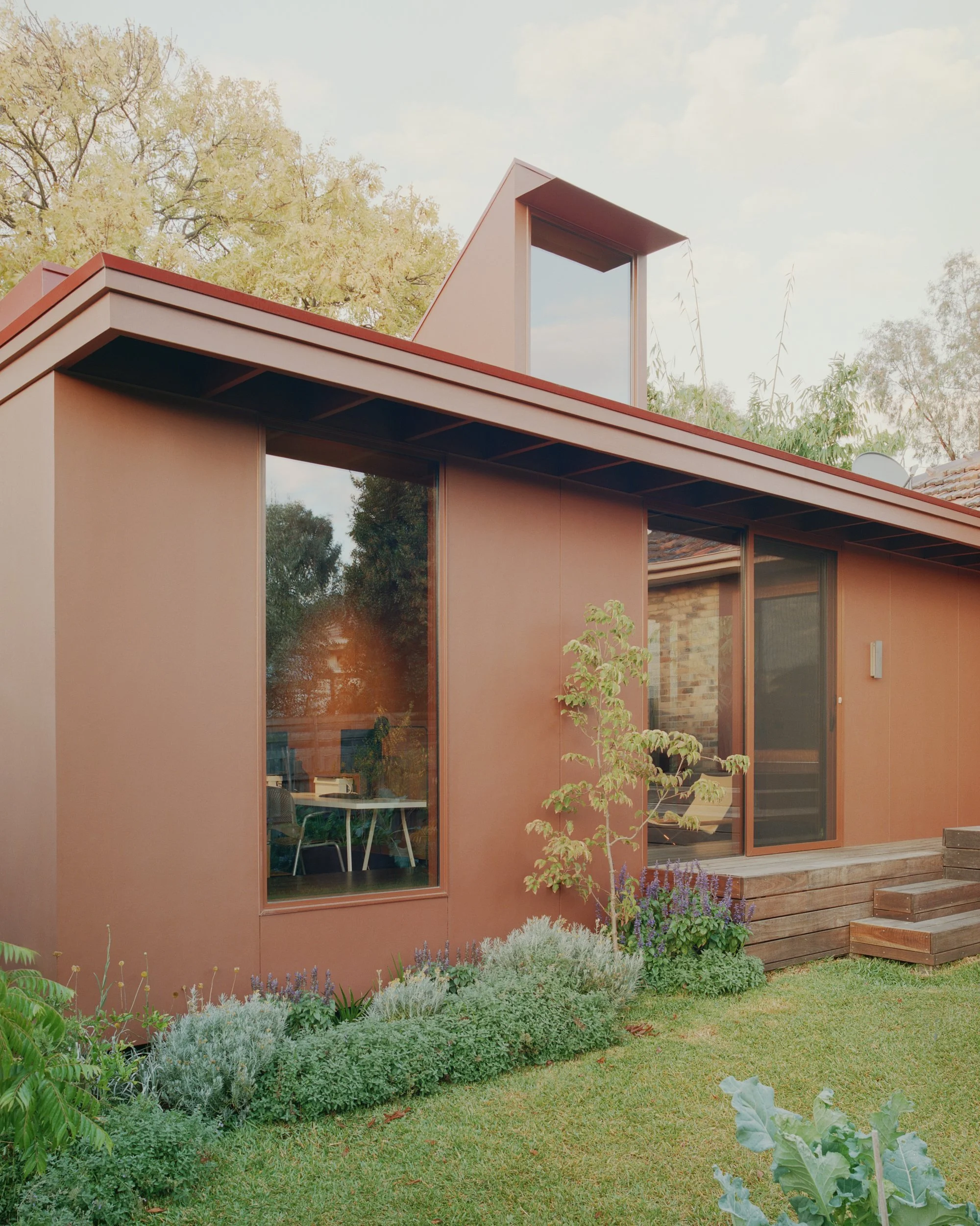 Materiality and finishes maintain continuity between old and new. Original rooms remain light and airy, retaining their post-war character, while new spaces adopt warmer, earthy tones that reference the surrounding clay-rich soil. Inside the addition, grooved MDF panels stained to a bronze hue echo the terracotta-painted cement panels outside, providing texture and a subtle backdrop for the garden to shine. Victorian Ash flooring is finished in contrasting tones, whitewashed in the original house, darker in the new spaces — unifying the interiors with a quiet rhythm.