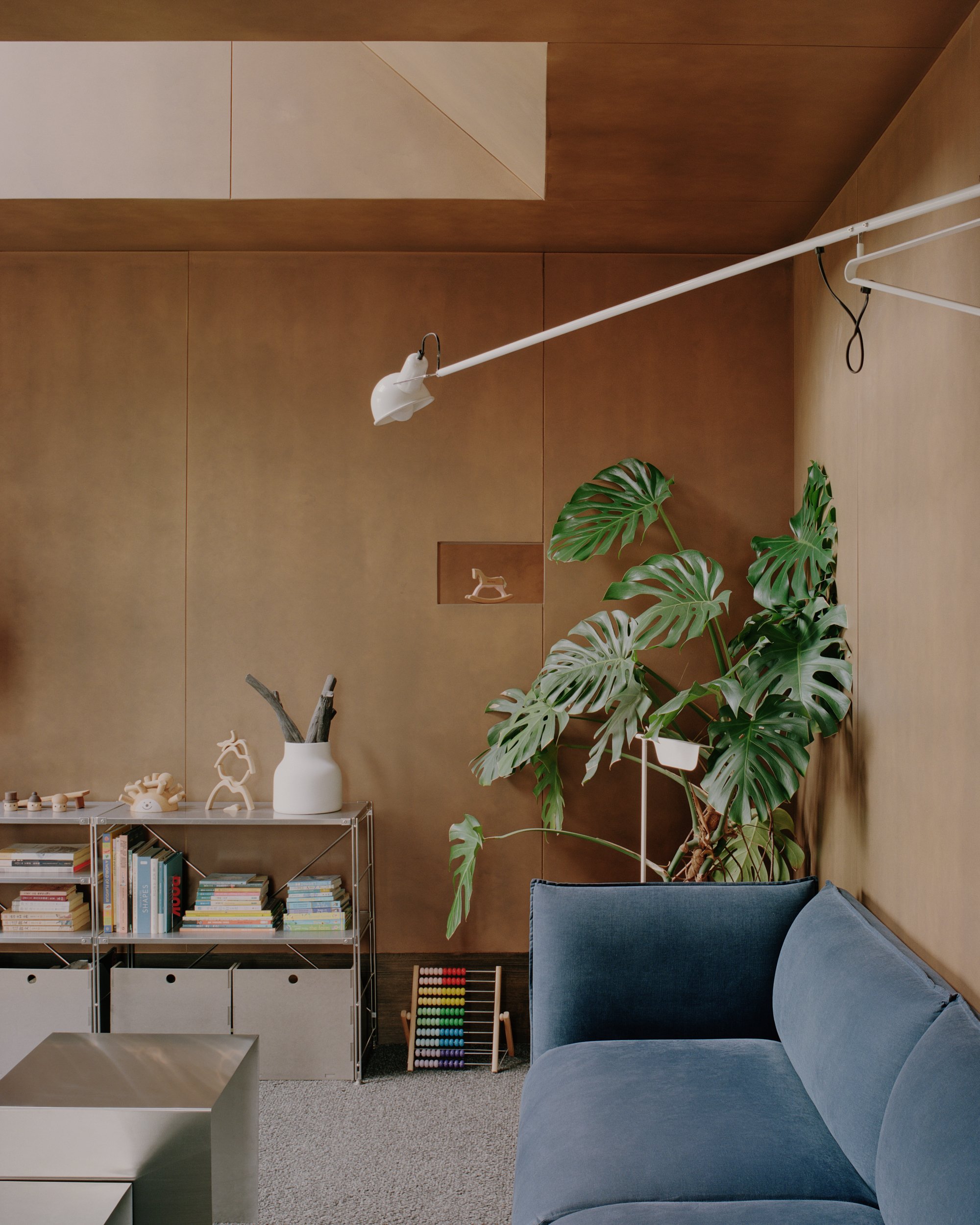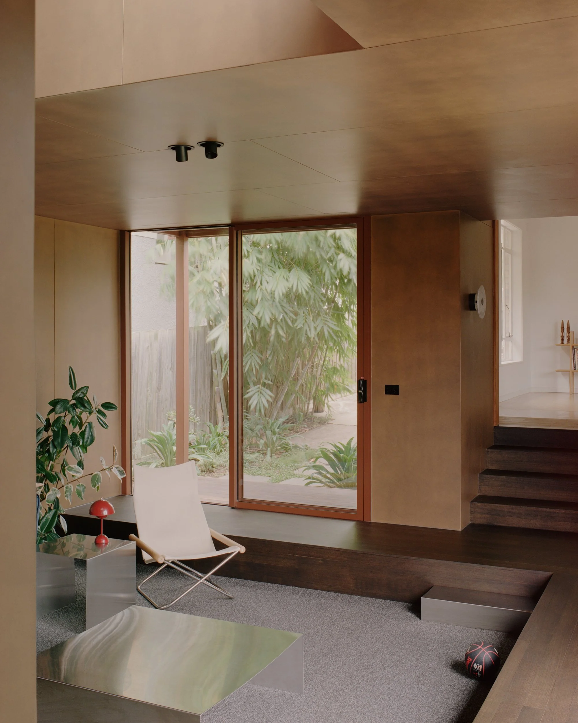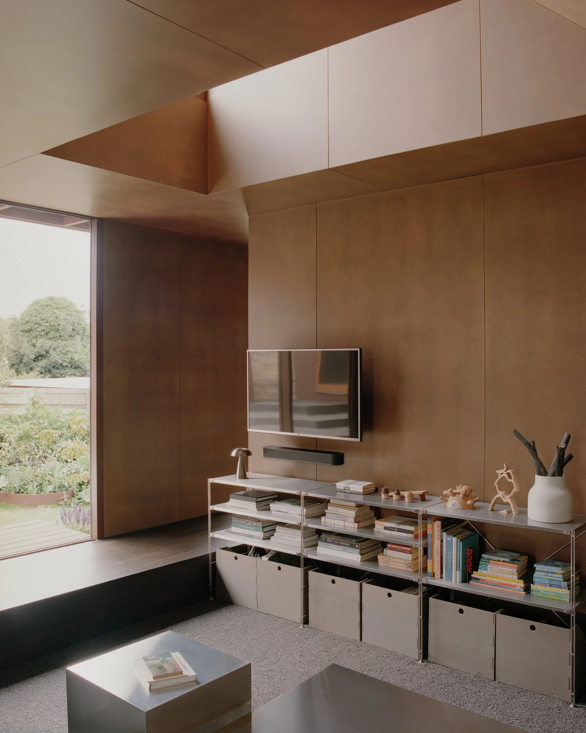 Inside the addition, grooved MDF panels in a warm bronze tone mirror the terracotta-painted exterior, adding texture while letting the garden take centre stage.