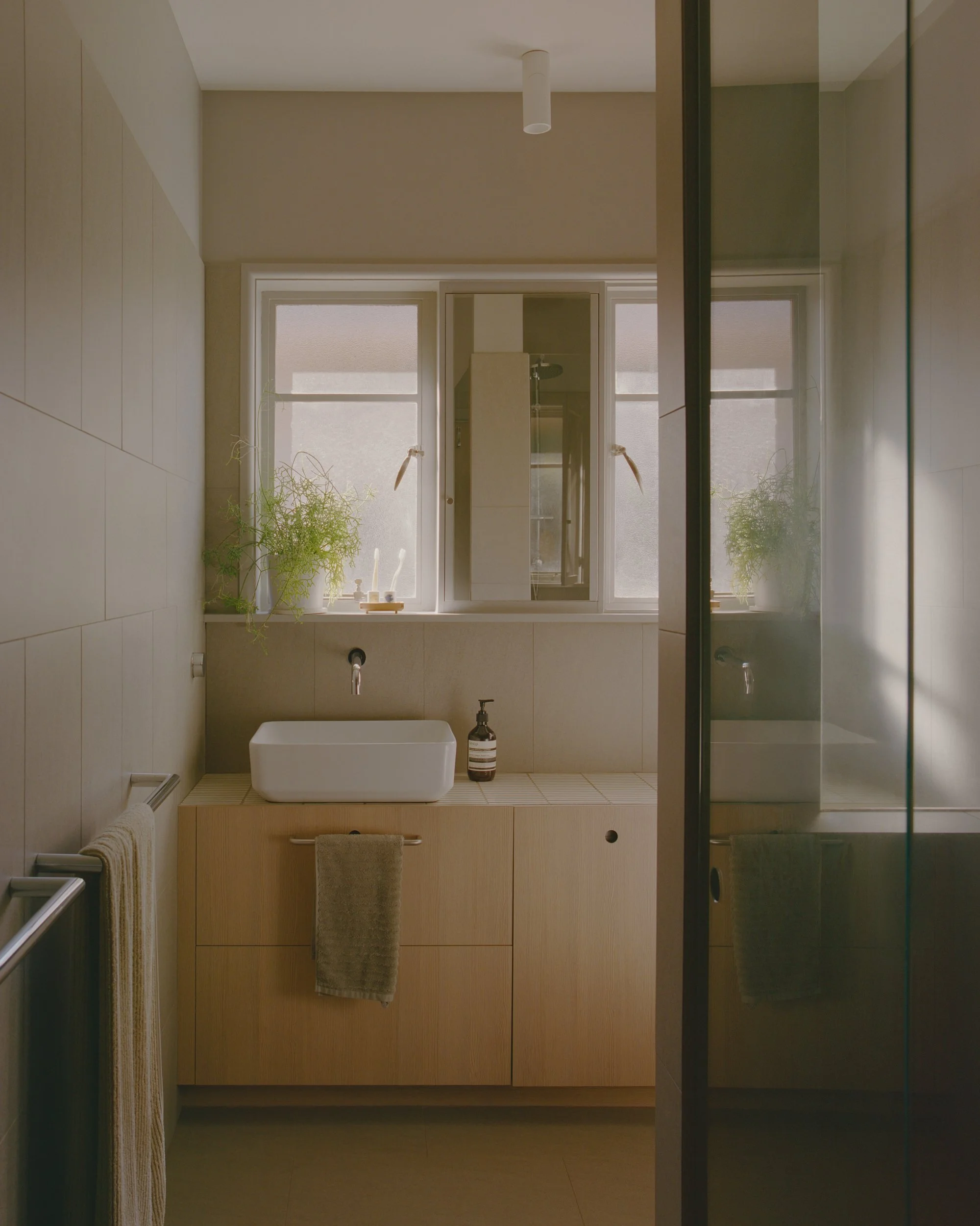 A sense of simplicity and humble material choices runs through every space, including the bathroom.