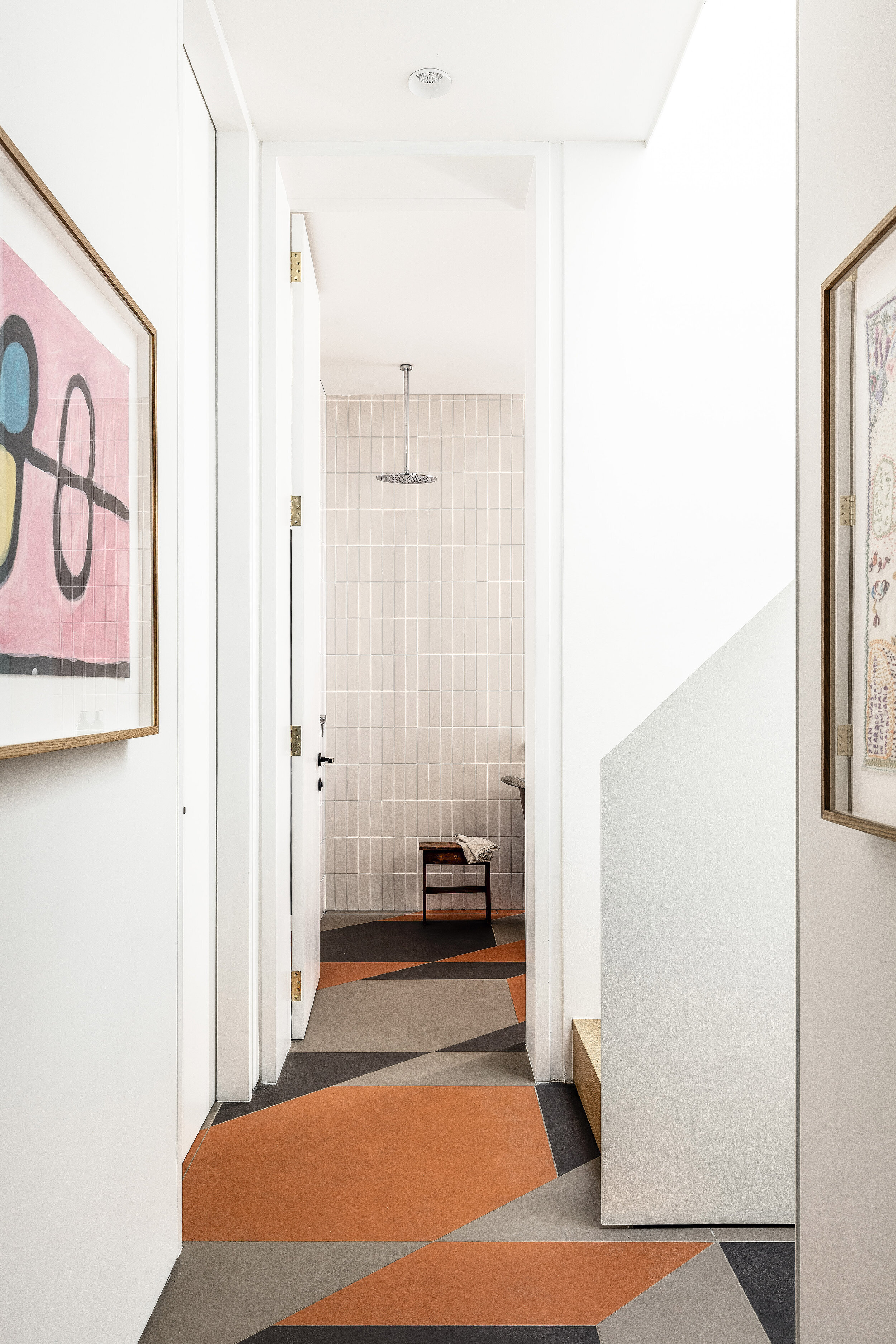 In the main bathroom, an antique bathtub takes centre stage upon graphic tilling which continues into the hallway. “The inclusion of the bold graphic porcelain tiles … [is] an intentional break from this palette —adding a certain drama to the most active and dynamic part of the home— helping to unify the spaces and granting the illusion of expanding space,” Emma adds. “This motif is subtly referenced upon the perforated design of the façade which also alludes to the pitched rows of the neighbourhood’s terraced rows.”