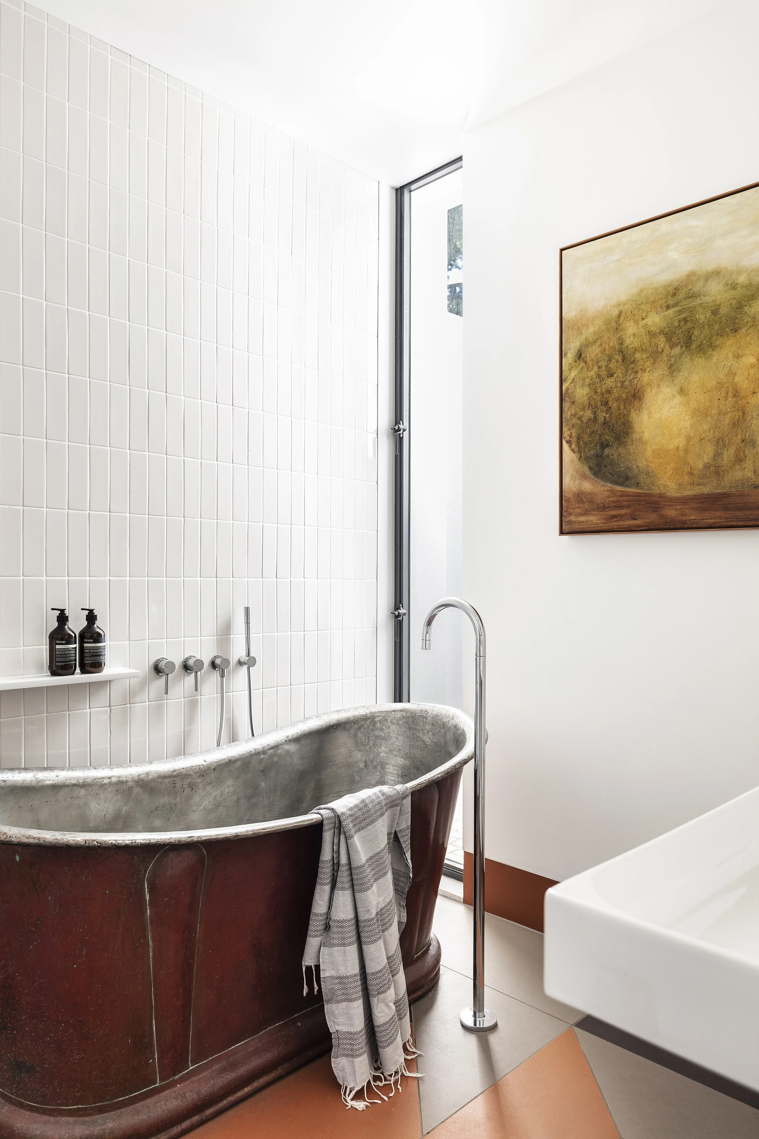 An antique bathtub takes centre stage upon graphic tilling which continues into the hallway. Photo - Tom Ferguson.
