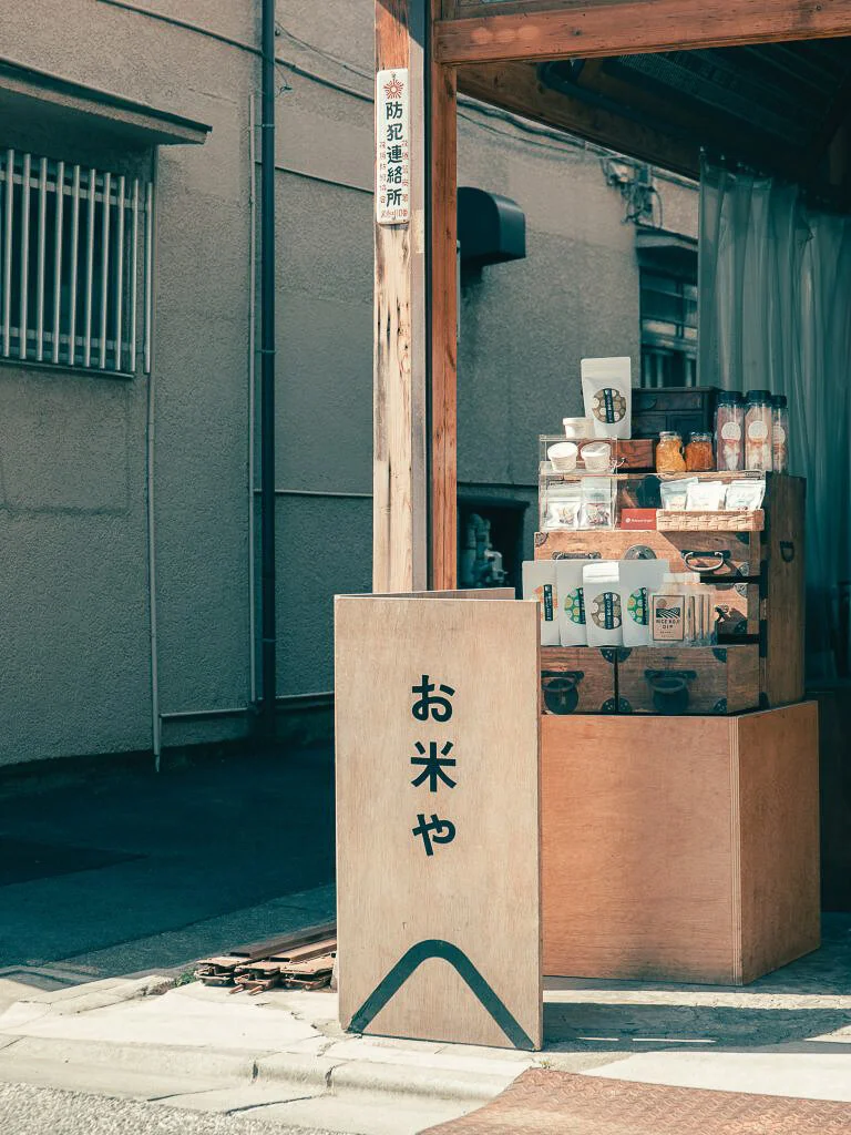 Bags of rice and bottled condiments are displayed on simple plywood units inside this former Tokyo greengrocers that has been converted into a tiny rice shop, cafe and a home for the owner. Located within an old timber-framed building in the Tokyo district of Shinagawa-ku, simplicity reigns supreme at Okomeya.
