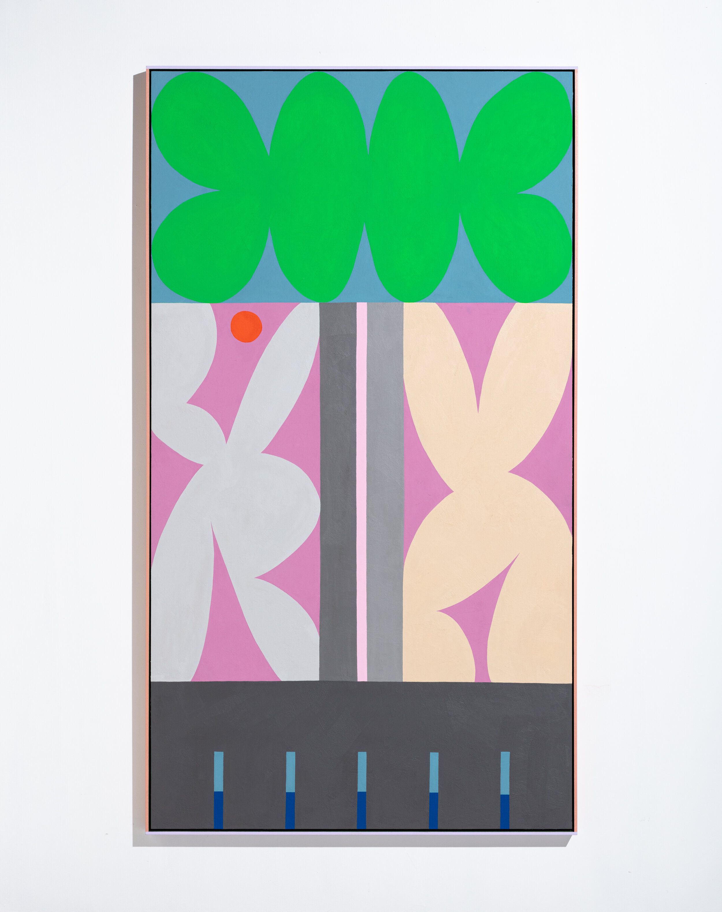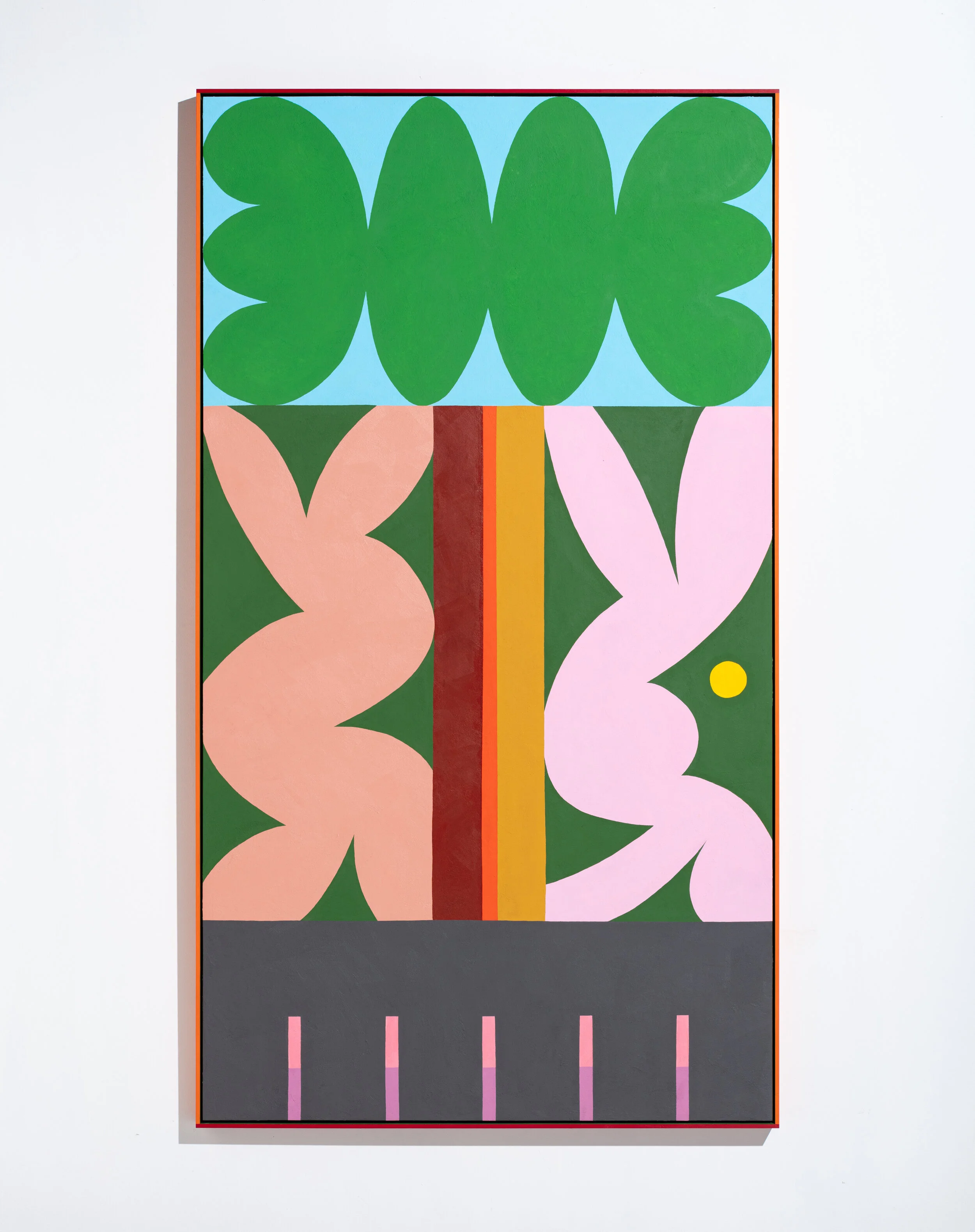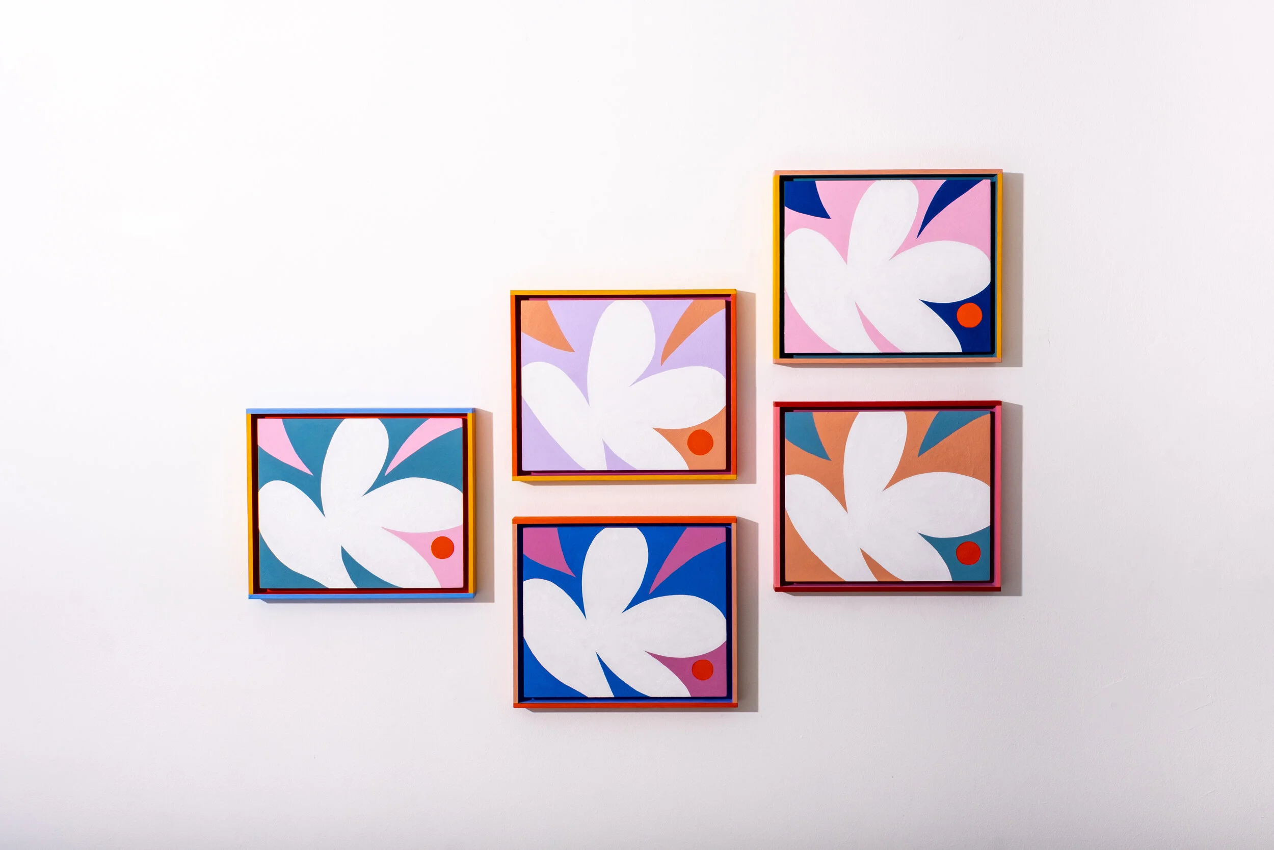 Evi’s paintings explore the sense of being ‘on the road’, as she found herself mesmerised by individual trees and birds found in the vast landscape. And as ever, the geometric shapes appear in her distinct colour palette; she adds, ‘the colours are interpretations of colours found in nature, but with a positivity spun into it.’