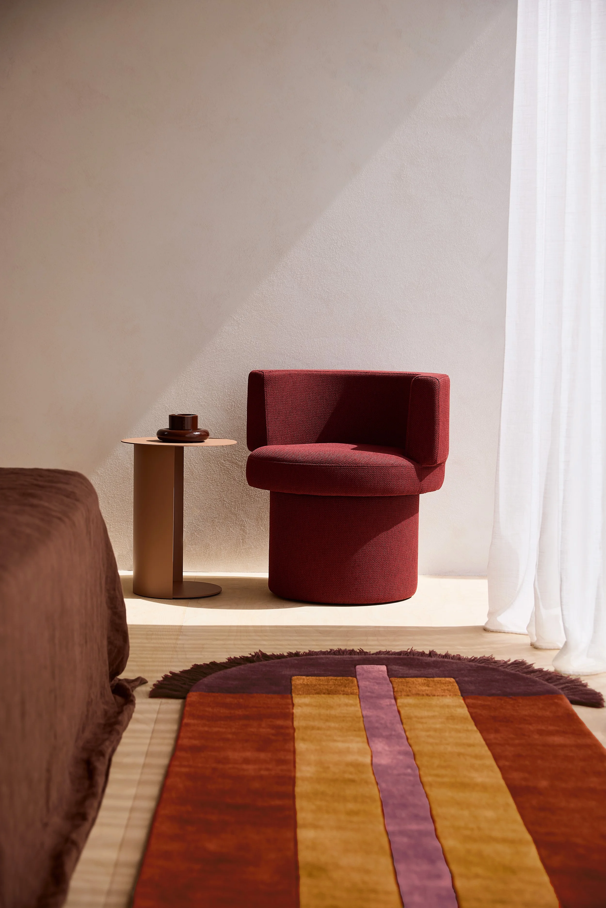 The Confetti Armchair and Pillar Round Side Table in Nutmeg designed by Gibson Karlo with the Overlay Rug designed by Danielah Martinez from DesignByThem.