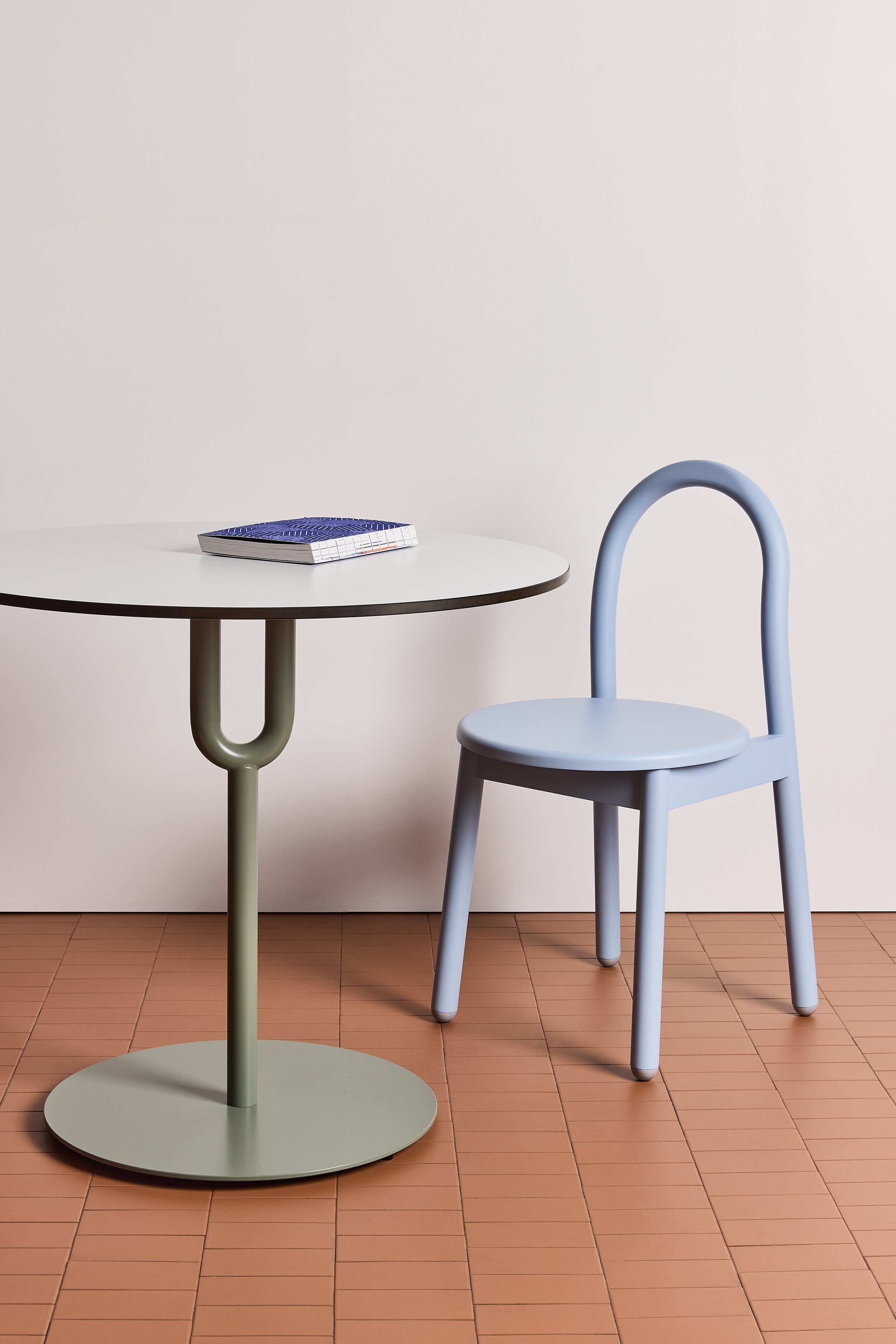 The Twill Chair in Rust Red and Pillar Round Side Table in Chalk Blue, designed by Gibson Karlo, with the Overlay Rug designed by Danielah Martinez from DesignByThem.