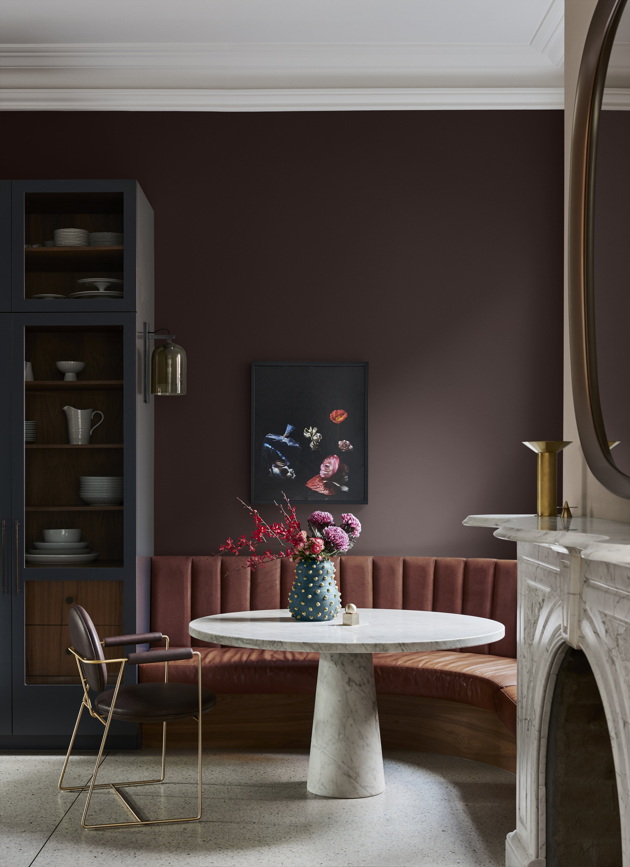 Dulux Colour Forecast 2022 – Flourish palette. Cabinet paint colour: Dulux Dark Door. Wall paint colour: Dulux Deep Leather. Above fireplace paint colour; Dulux Bongo Drum. From left: Baxter Gemma Chair by Draga and Aurel, Space Furniture; Angelo Mangiarotti Dining Table, Artedomus; In Dreams Original Photograph by Lilli Waters, Modern Times; Vase in Dulux Benang & Gold Vintage Gold Effect, Stylist; Balance 03 object, Lightly; (On mantel) Water Tower VII by Kenny Yong-Soo Son, Modern Times; Balance 01 incense holder, Lightly; Mirror, Homeowner. Photo: Lisa Cohen. Styling: Bree Leech