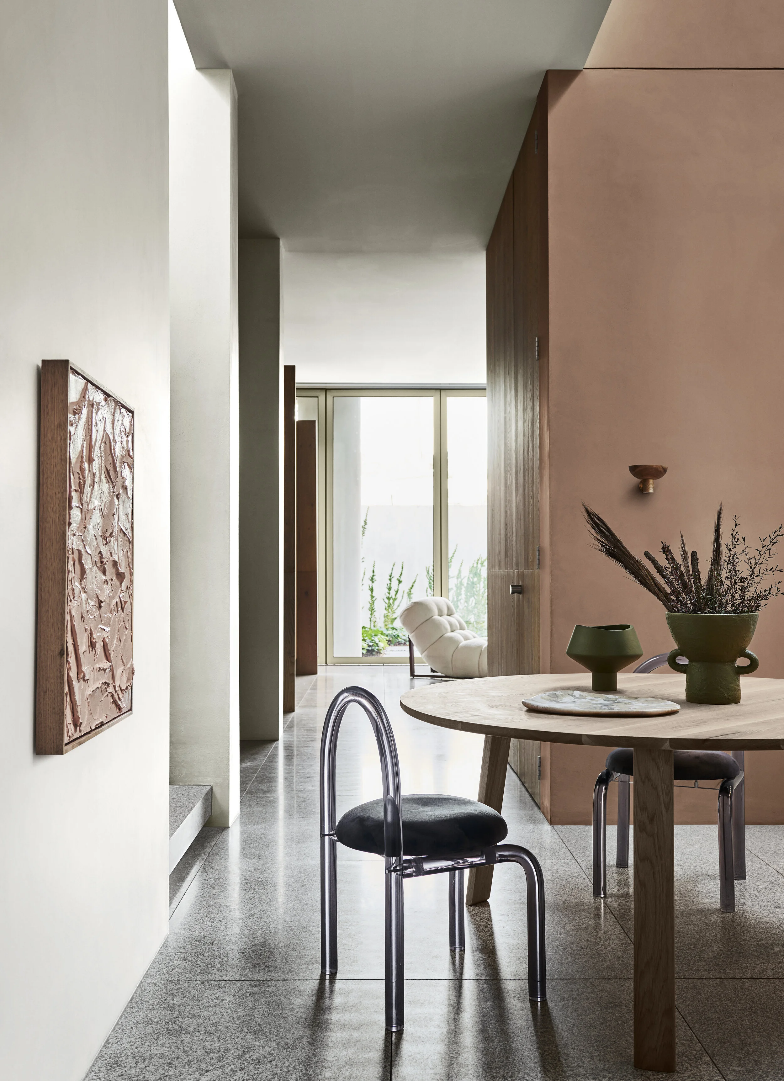 Dulux Colour Forecast 2022 – Restore palette. Paint colours: Dulux Stowe White and New Penny. From left: Blushing Movements Original Artwork by Felicity Lea; Daisy Chair Smokey, En Gold; Waka round dining table, Tide Design; Large Stone Platter by Dinosaur Designs, Jardan; Vessels in Duramax Natural Flora; (On wall) Selene Wall Light in Ash, Marz Design; (At back) Humphrey Cloud Occasional Chair, Globe West. Photo: Lisa Cohen. Styling: Bree Leech
