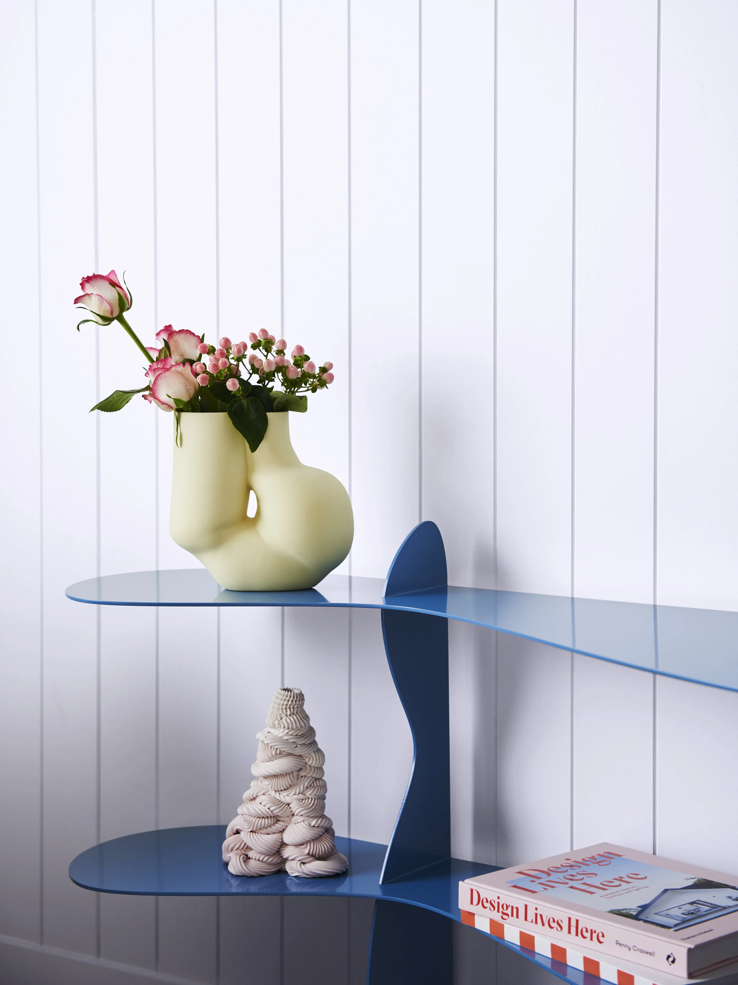 Dulux Colour Forecast 2022 – Wonder palette. Wall paint colour: Dulux Pax. Smooth shelf in Dulux Duralloy Wedgewood, Nicole Lawerence; (On shelf top) W&S chubby vase soft yellow, Makers’ Mrkt; (On shelf middle) Pink Moment by Ebony Russell, Modern Times. Photo: Lisa Cohen. Styling: Bree Leech