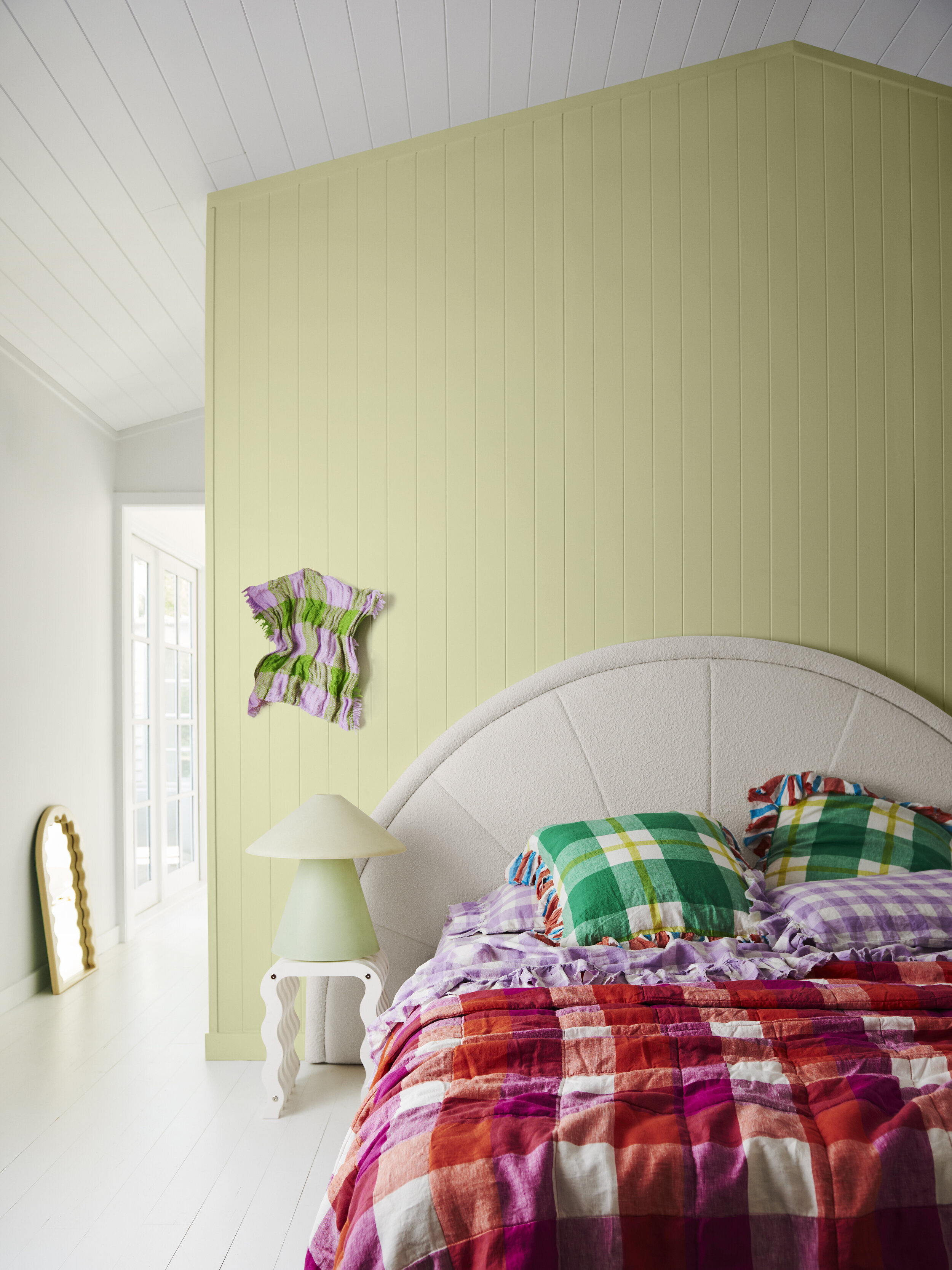 Dulux Colour Forecast 2022 – Wonder palette. Walls & trims paint colour: Dulux Vivid White™, wall behind bed, Dulux Celery Green. Gummy Mirror by Cycl.world, CCSS;Nori Stool by Cycl.world,CCSS;A.D.A Lamp, Stylecraft; Little wall sculpture by Aidan Renata; Disco Bedhead, Love Tree Interiors; Gingham Lilac Sheets and pillows, Zest Check Candy Euros, Sherbert and Lilac Quilt, Society of Wanderers. Photo: Lisa Cohen. Styling: Bree Leech