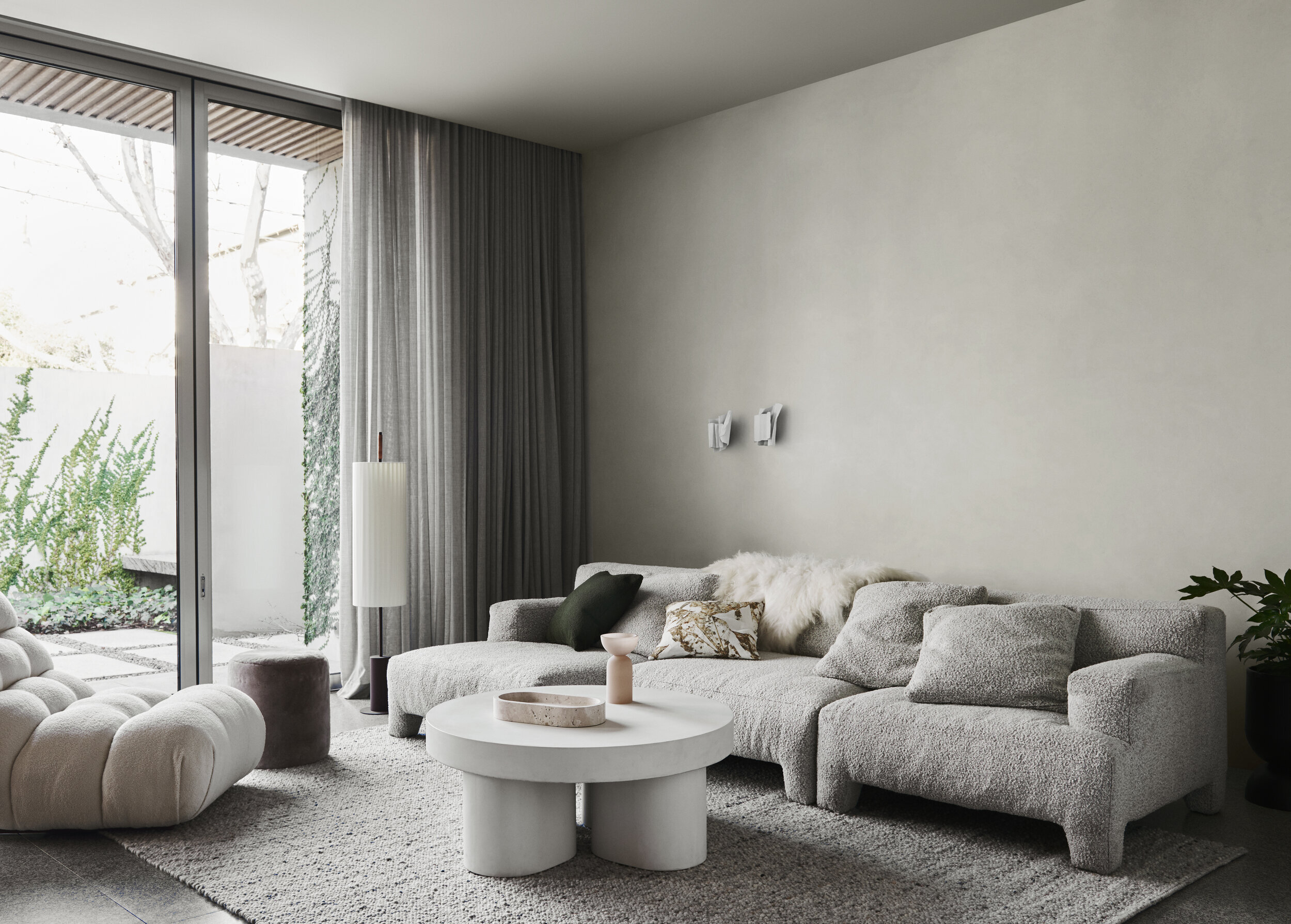 Dulux Colour Forecast 2022 – Restore palette. Walls & ceiling paint colour: Dulux Winter Terrace. From left: Humphrey Cloud Occasional Chair, Globe West; Piazza Modica, Halcyon Lake; Drum Ottoman, Grazia and Co; Dórica Floor Lamp by Jordi Miralbell and Mariona Rabentós, Ajar, Morocco Sofa, Globe West; (On sofa) Velvet ribbon stitch cushion, Zuster, Boucle Cushion, Trit; Sophora Cushion, Penney and Bennett; Slab Coffee Table, Trit; Travertine Tray, Fenton and Fenton; Dual Vase by Kristina Dam, In Good Company; (On wall) Plaster Wall Sculptures, Kelly Larkin. Photo: Lisa Cohen. Styling: Bree Leech