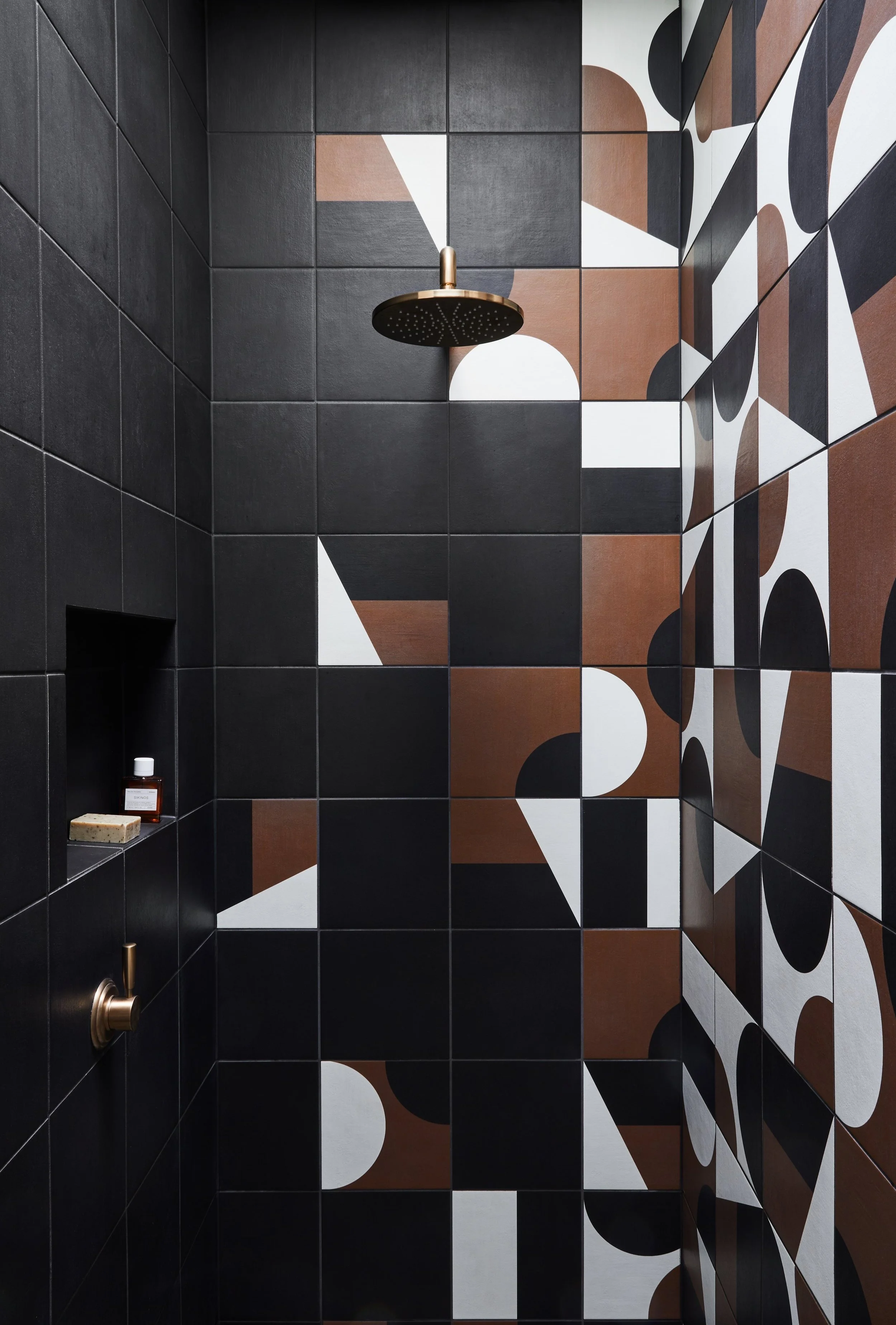 Bold graphic feature tiles have also been applied to the bathroom space.