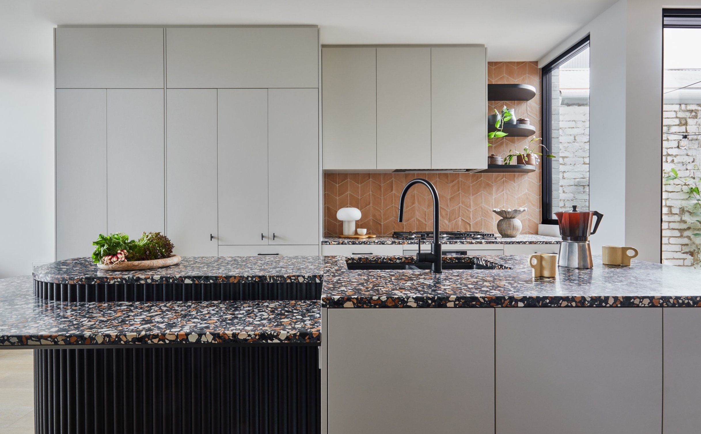 The bold terrazzo applied to the kitchen bench is a feature within the home.