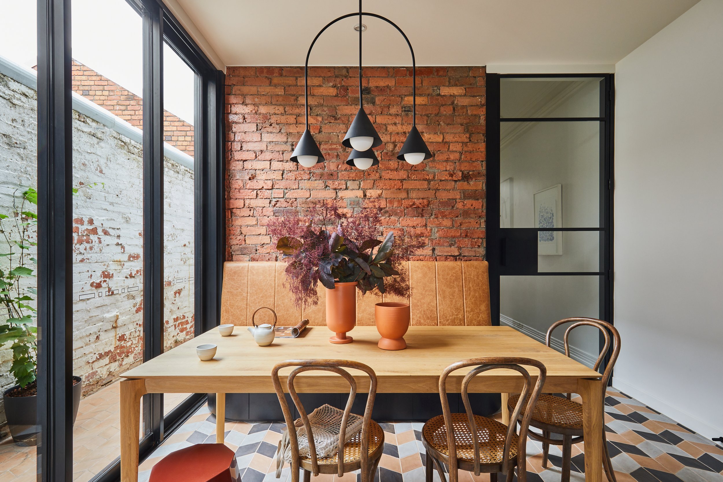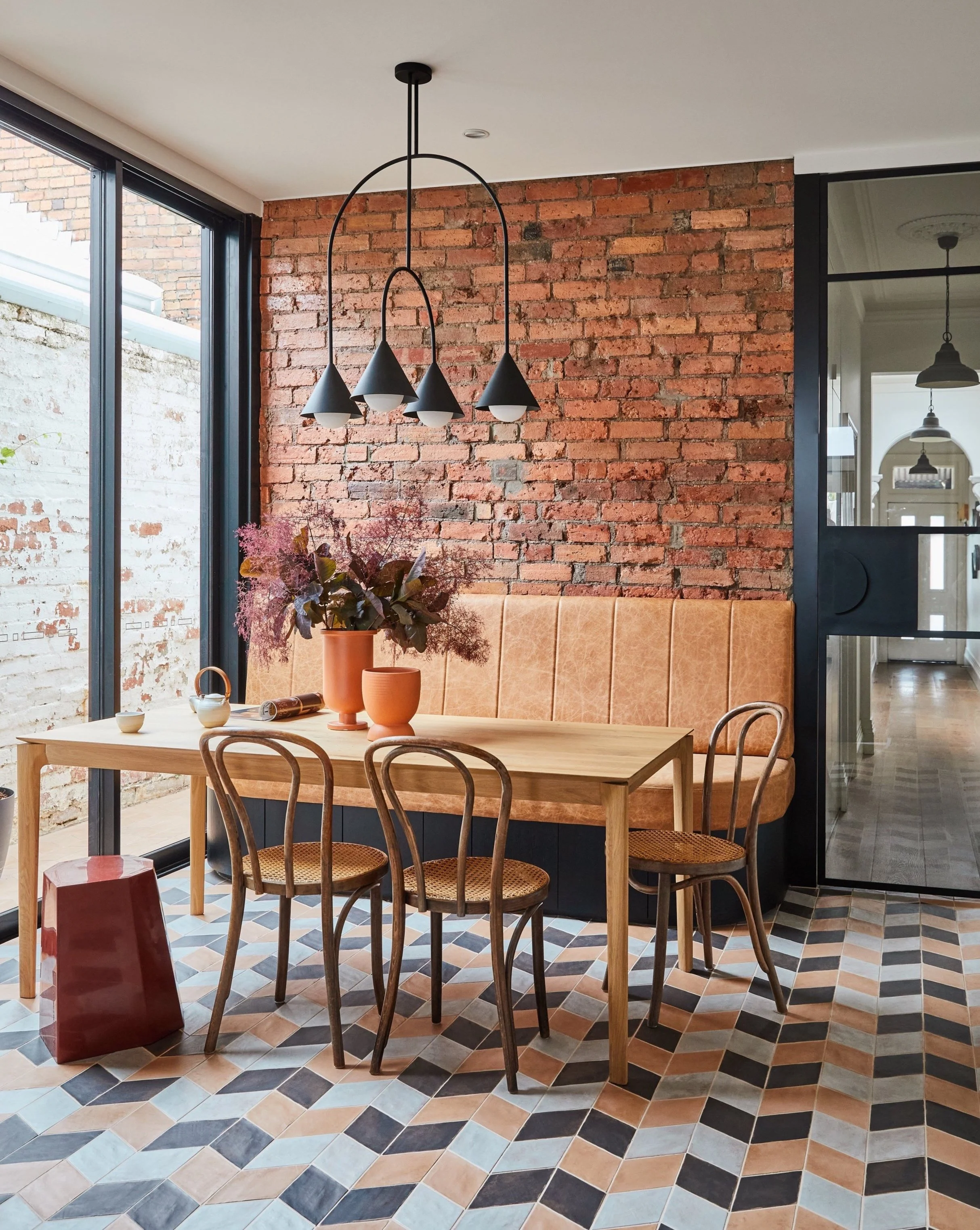 Cartlon North Terrace is a layered interior sympathetic its history, featuring black accents, exposed brick and patterned tiles, a vibrant and layered home the owner’s can enjoy for many years to come.