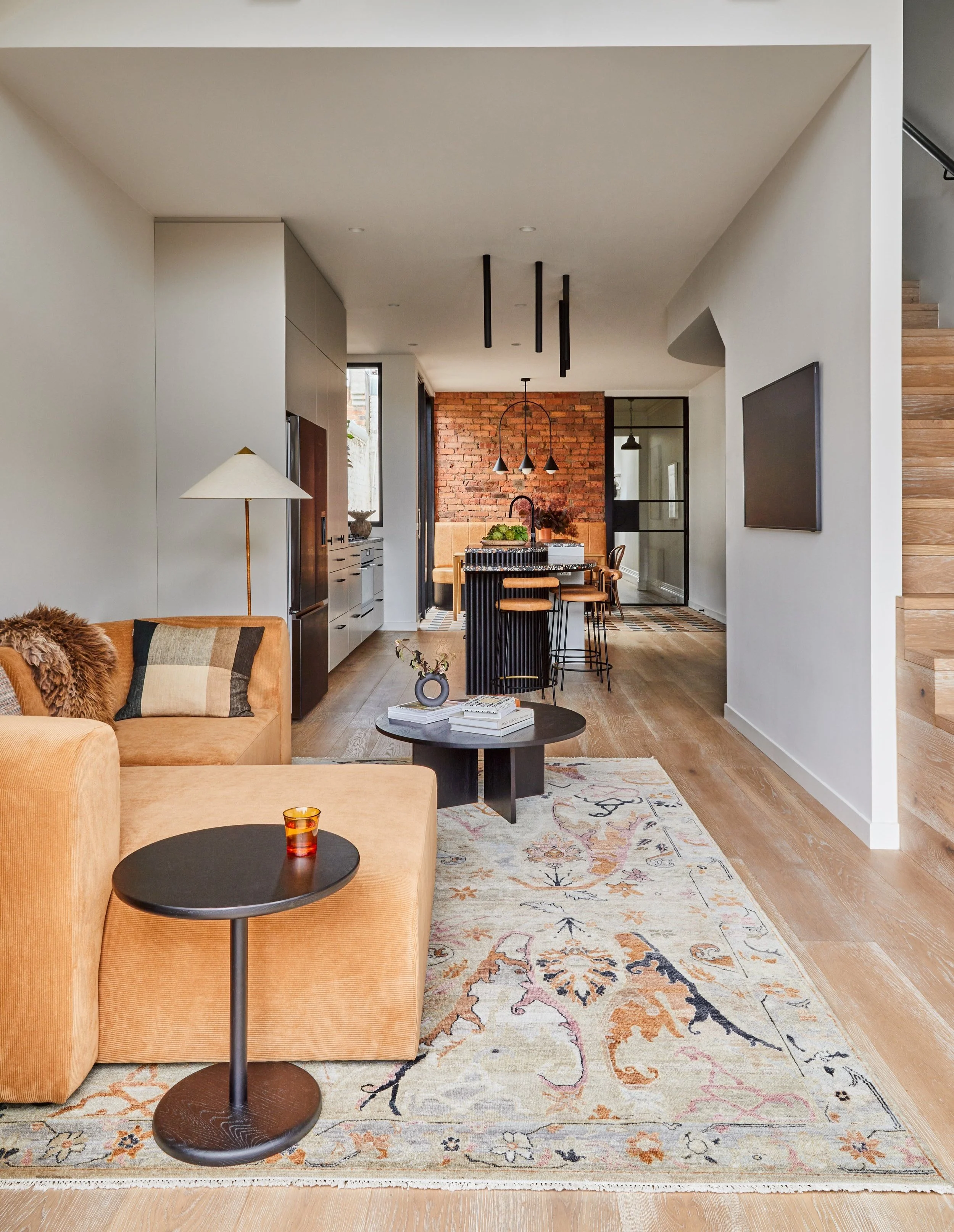 Traditional elements such as black steel doors, terrazzo and exposed bricks transition into the contemporary cabinetry design and styling on the upper level of the home.