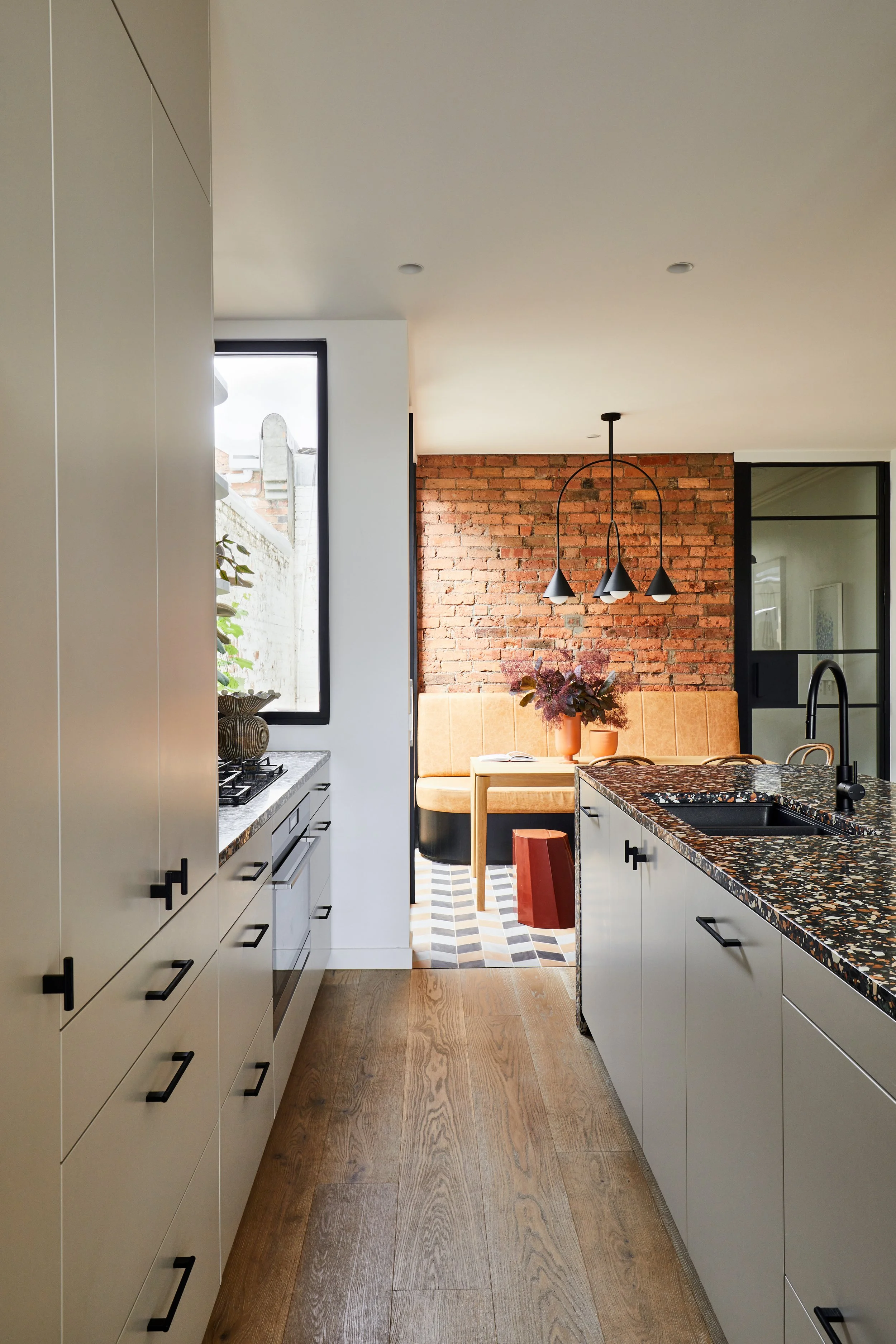 The design draws inspiration from the rich foundations of the home. ‘When designing within contemporary extensions on a traditional style of house, I really work to create a blended style within the space—elements of tradition, such as the black steel doors, terrazzo and exposed bricks transition into the contemporary cabinetry design and styling on the upper level,’ she says.