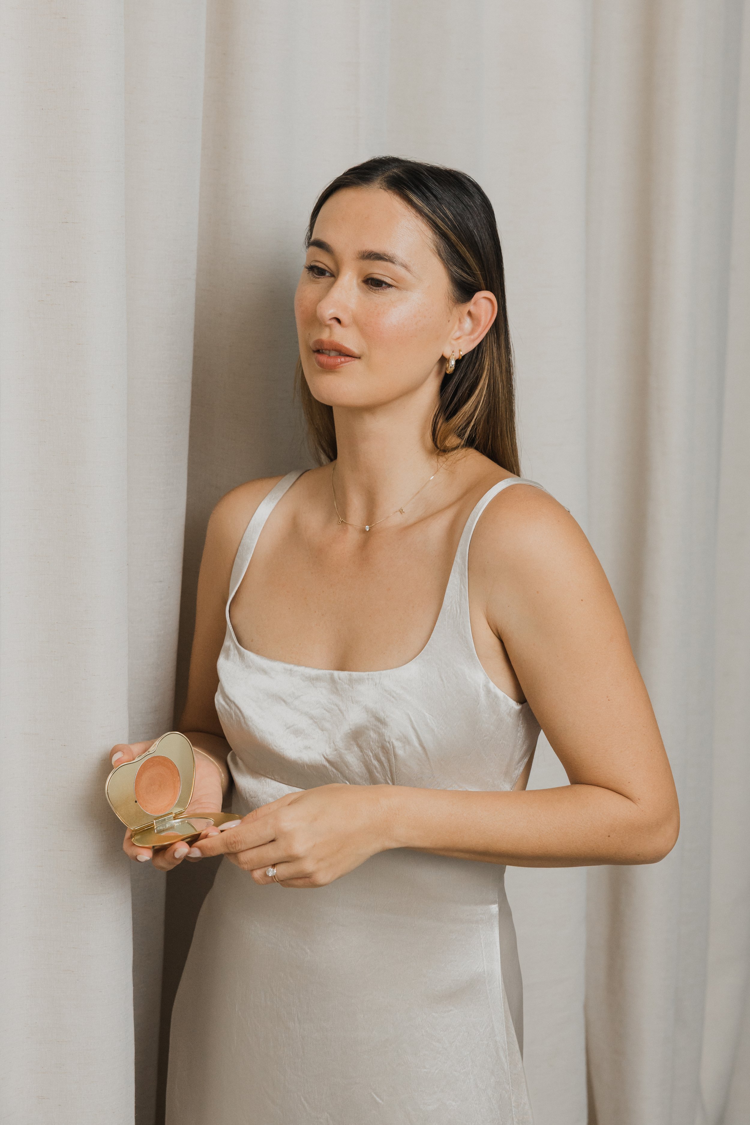 Our gold keepsake compacts are weighty and smooth—every undulating curve is intentional. They’re meant to feel organic, grounding and intimate, like an heirloom you return to. Even the click of the magnetic closure was considered – that satisfying sound is part of the ritual. Every design choice is about deepening the connection between you and the product and of course, with the brand.